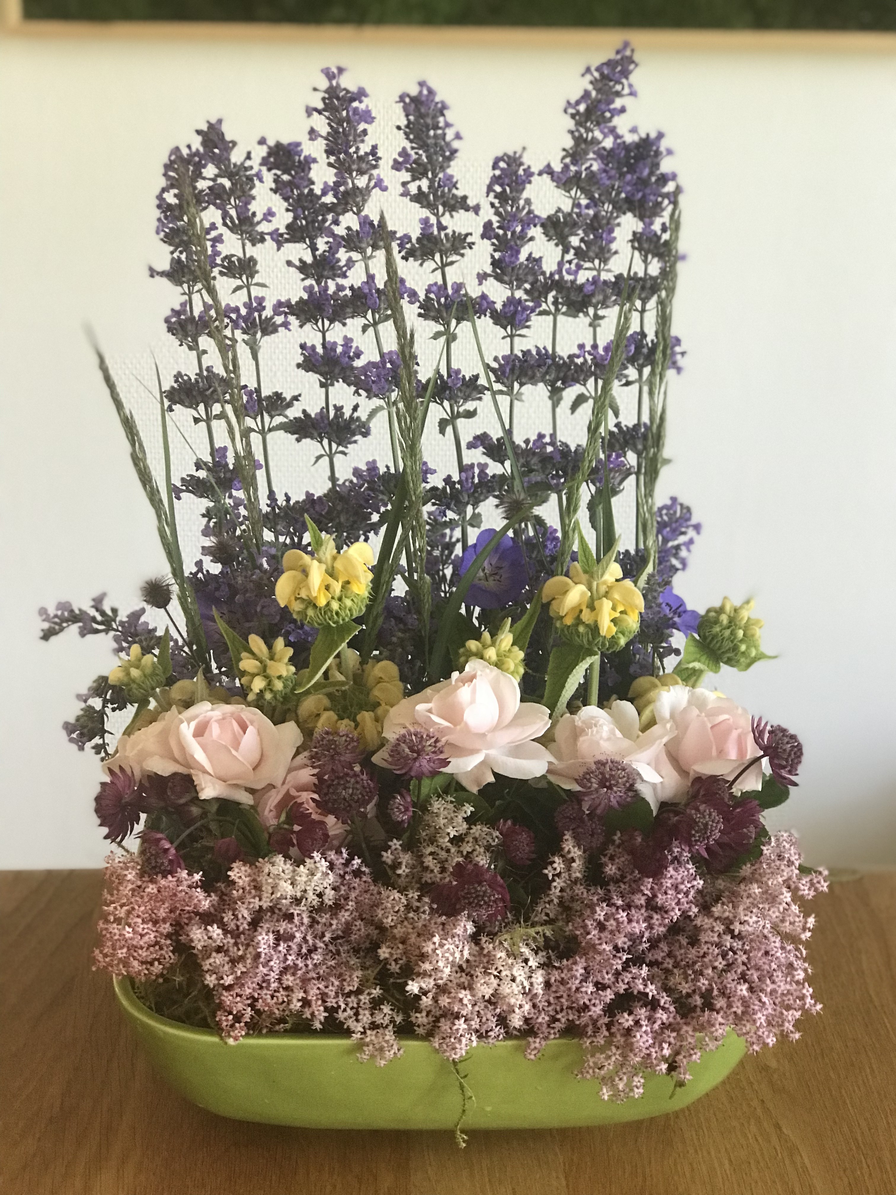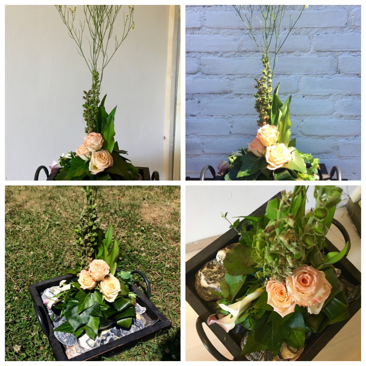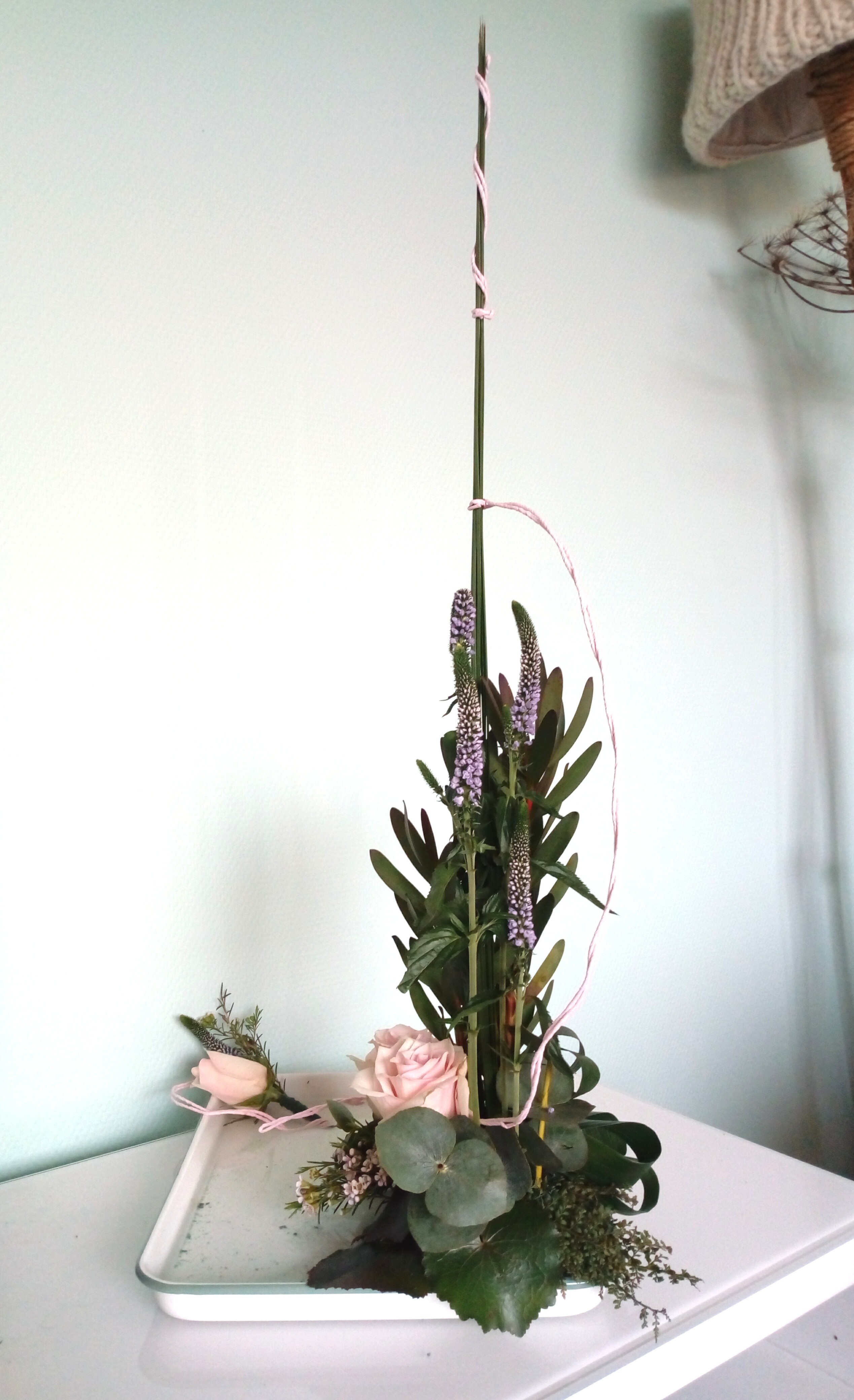 Hallo Nicolle, bij deze mijn lineair bloemstuk op schaal. Bijna al het materiaal komt uit eigen tuin, muv de roosjes. Zelf vind ik het erg mooi, ben benieuwd wat jij ervan vindt. Groetjes, Rita