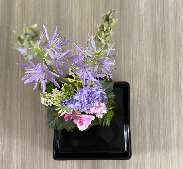 Hoi Angelique, Het was misschien moeilijk om materialen te kiezen, maar je hebt een mooie keuze gemaakt. Je arrangement ziet er ook erg goed uit, je vorm en lijnen zijn prima. Leuk ook zo met het bonte Hedera. Als je moeite hebt met je Anemoon kan je ook eventueel voorsteken met een andere steel. Hou er wel tekening mee dat ze gaan groeien. Nu komt dat mooi uit want ook je Ornitogalum (zuiderwind lelie) zal nog groeien. Top gedaan. Groetjes, Nicolle