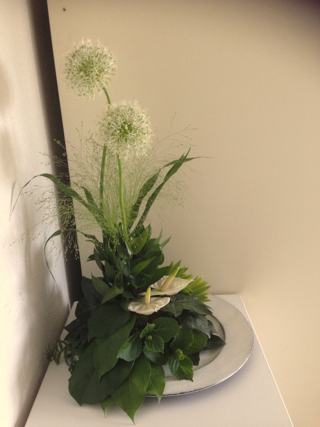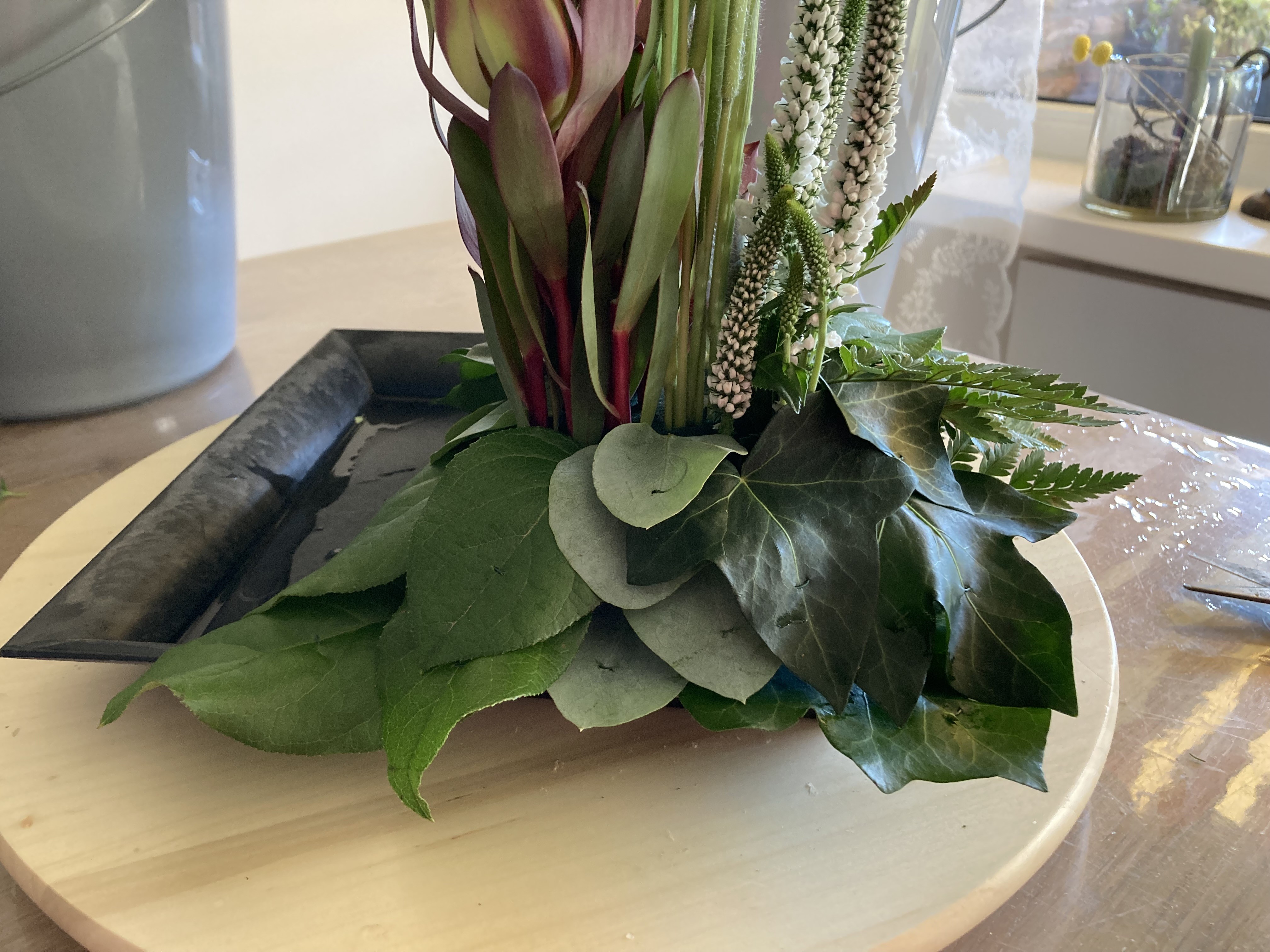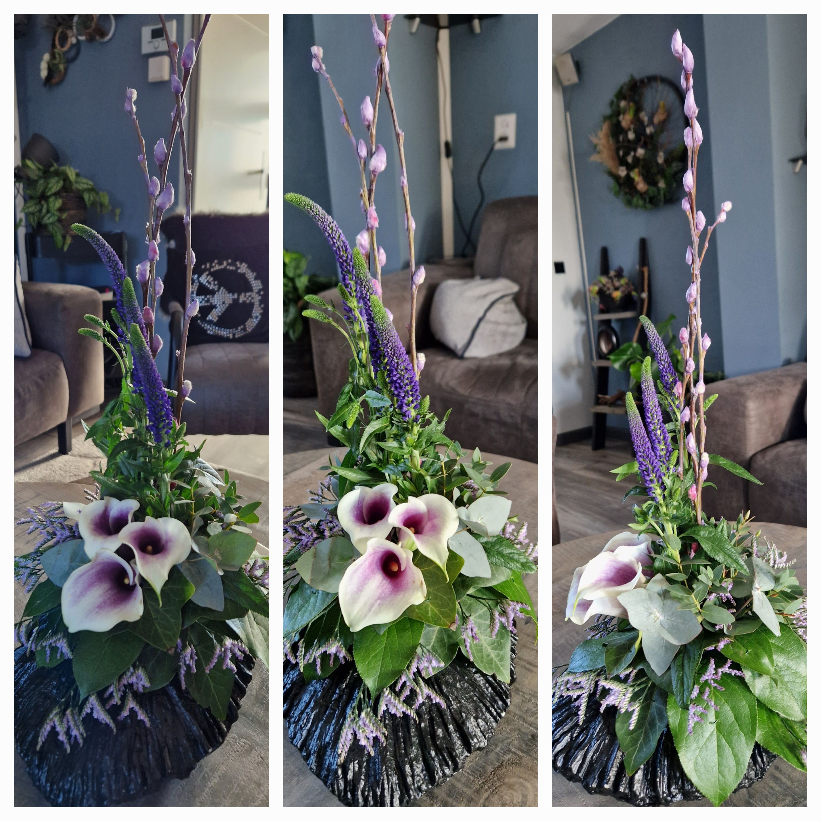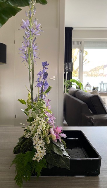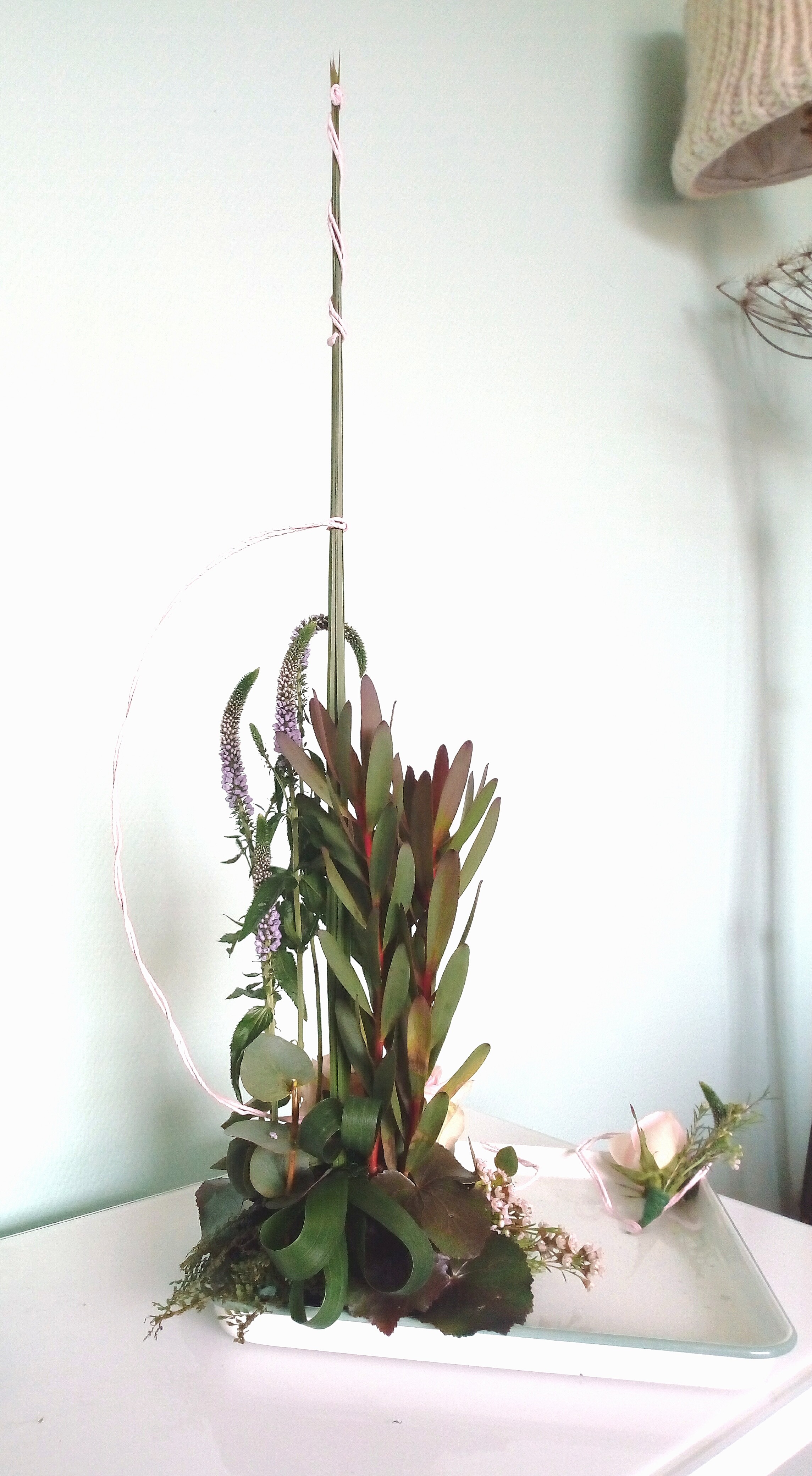 Eerste keer lineair.Ik had een soort paars tropisch blad maar dat was veel te groot, dus nu calla-blad rechts.Geen bolletjes mos maar Aspedistra gevouwen. Ben benieuwd wat je oordeel en tips zijn. Groetjes Eva Onstenk - van Ammelrooij