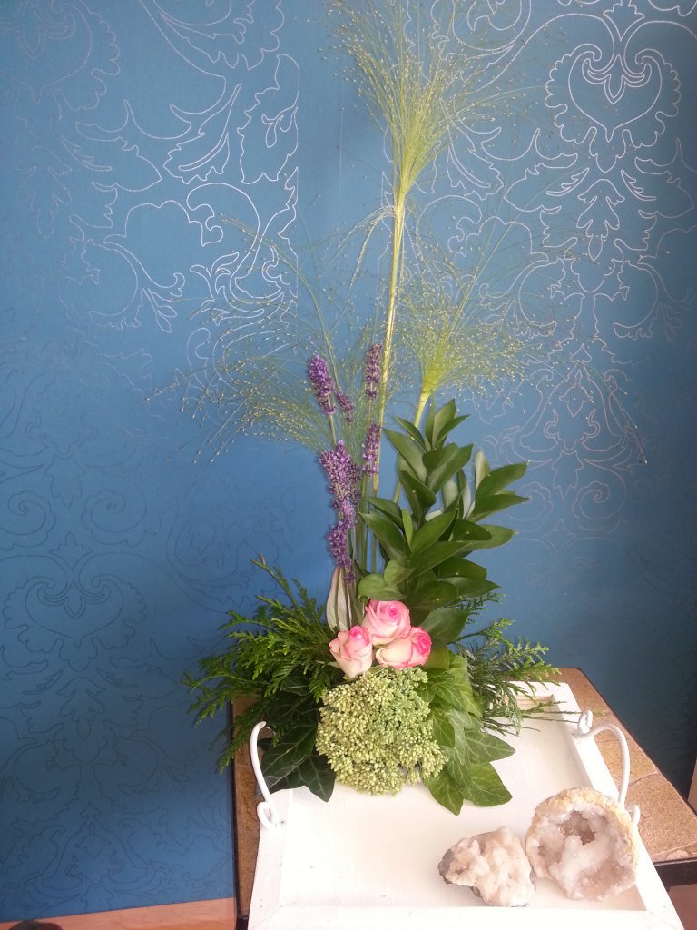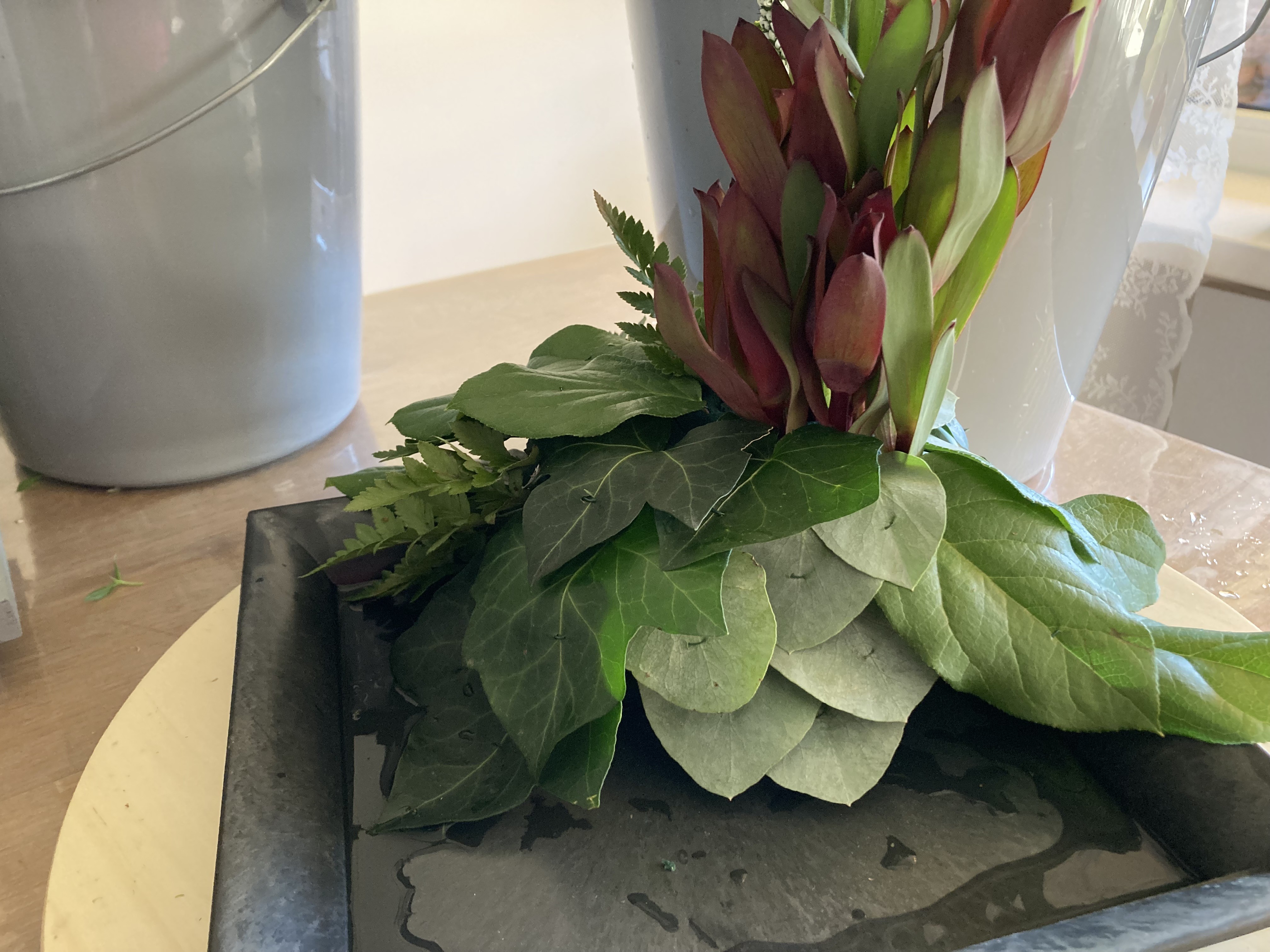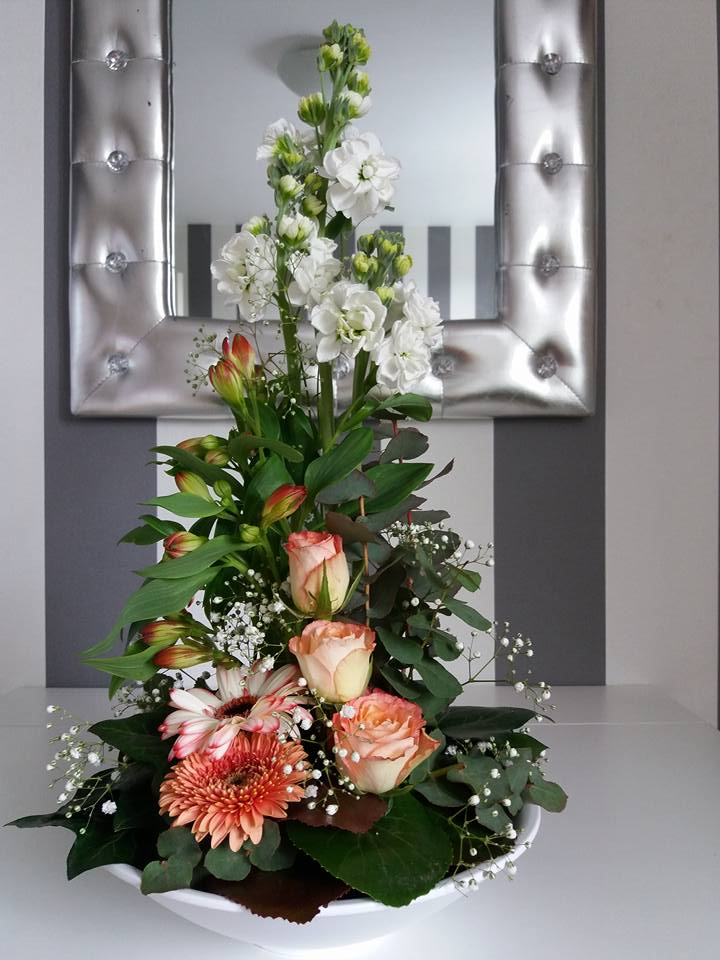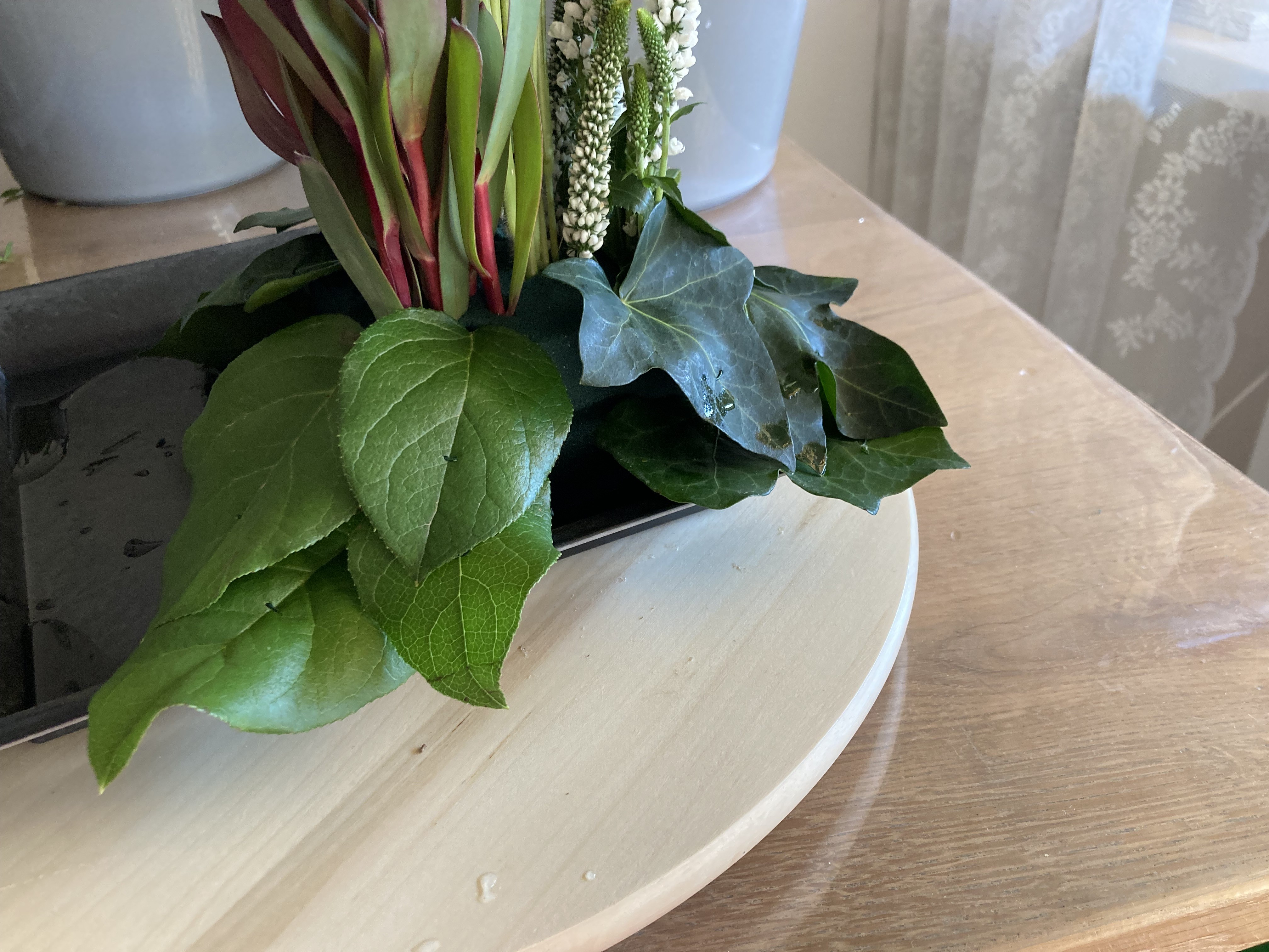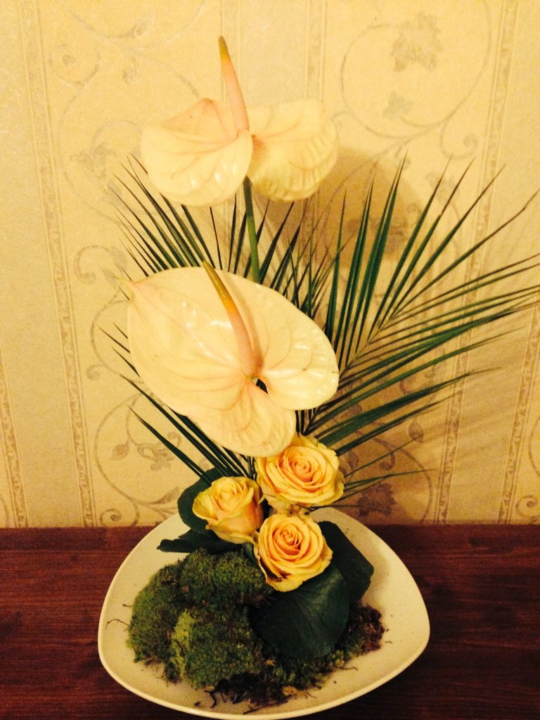 Eerste keer lineair.Ik had een soort paars tropisch blad maar dat was veel te groot, dus nu calla-blad rechts.Geen bolletjes mos maar Aspedistra gevouwen. Ben benieuwd wat je oordeel en tips zijn. Groetjes Eva Onstenk - van Ammelrooij