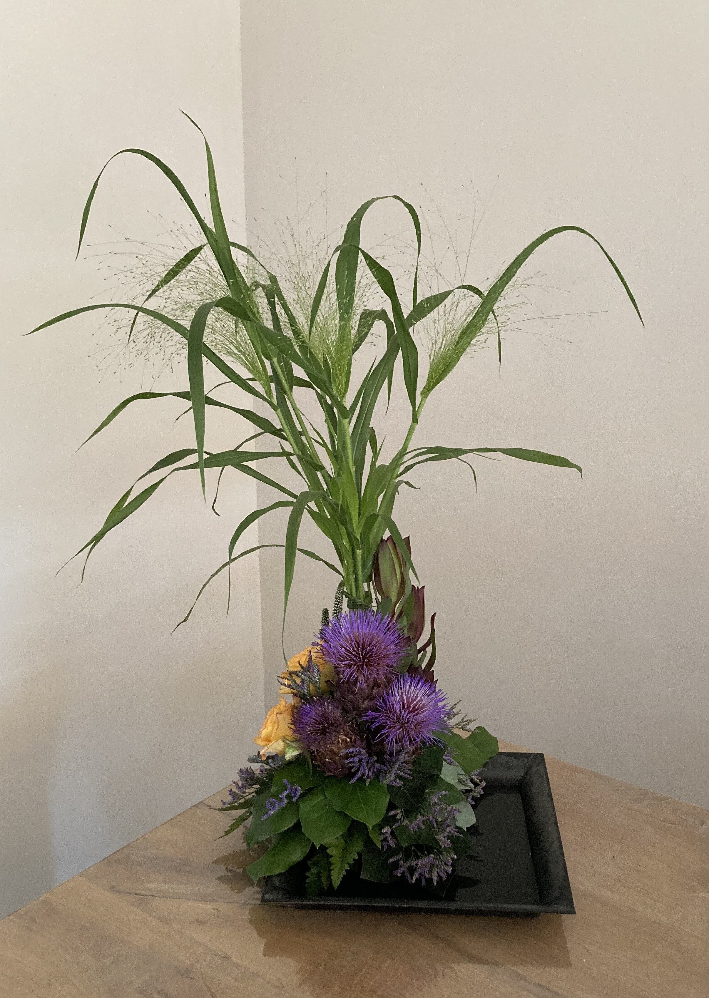 Mijn eerste lineaire schikking op een vierkante schaal en wat een succes????. Het ging al mis met de oasis, die was aan 1 kant te lang maar goed, met die mega artisjokken was dat wel mooi... overigens vind ik die wat te zwaar voor dit stuk. De Veronica rechts achterin vallen weg, daar had ik denk ik beter Ruscus voor kunnen neerzetten, durf het niet meer te wijzigen. Nou deze komt er zéker nog een keer. Groetjes, Dianne