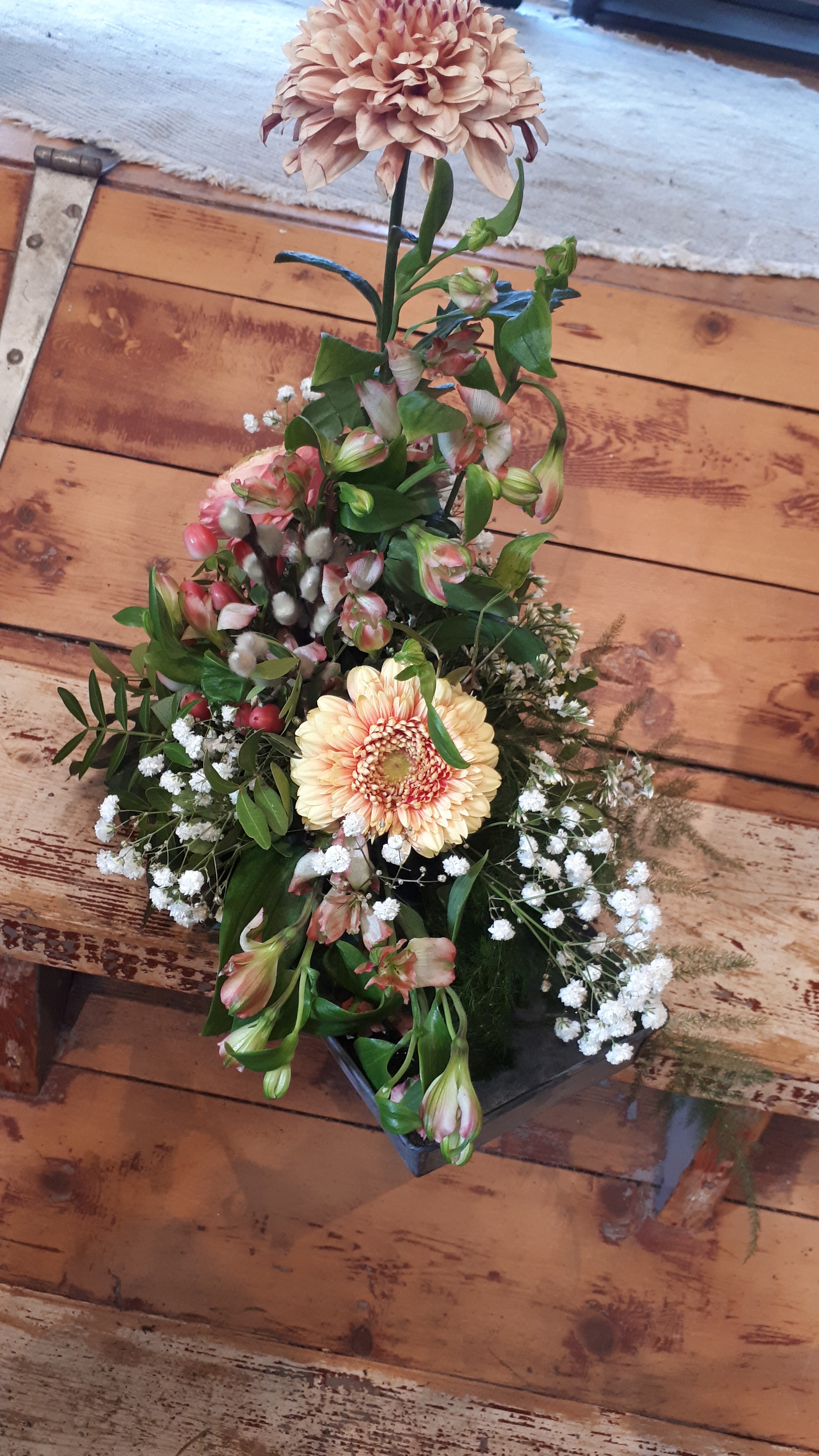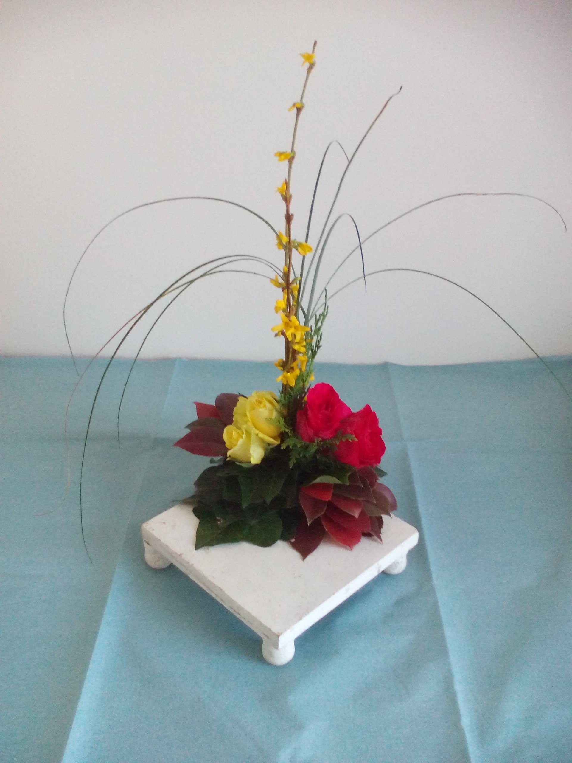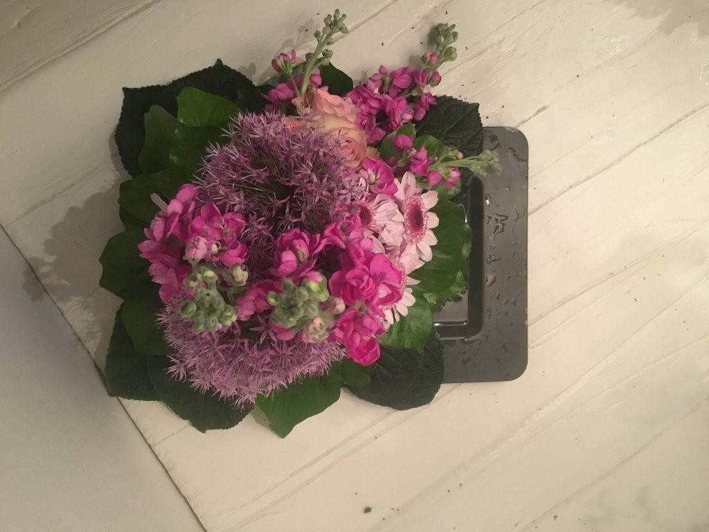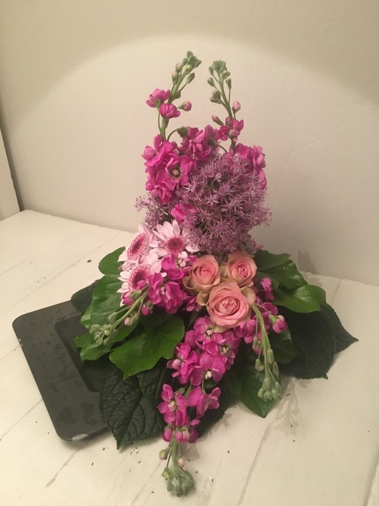 Dag Nicolle ik ben al geruime tijd de cursus online bloemschikken aan het volgen met heel veel interesse. Ik heb eerst de lessen uit de vakopleiding eens allemaal bekeken en ga nu beginnen met oefenen. Ik was van plan om de lineaire schikking op schaal eens uit te proberen als bloemstuk voor op het graf van mijn vader die vandaag 9 jaar geleden overleden is. Ik vond jammer genoeg niet de juiste materialen en heb dan meer bloemen gekocht.Ik dacht dat het zou lukken...wat niet helemaal het geval is vrees ik maar ik wilde het toch even doorsturen. Vele groetjes Kristin