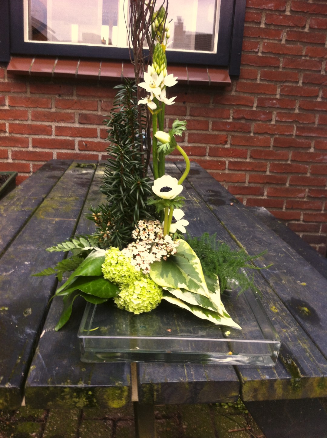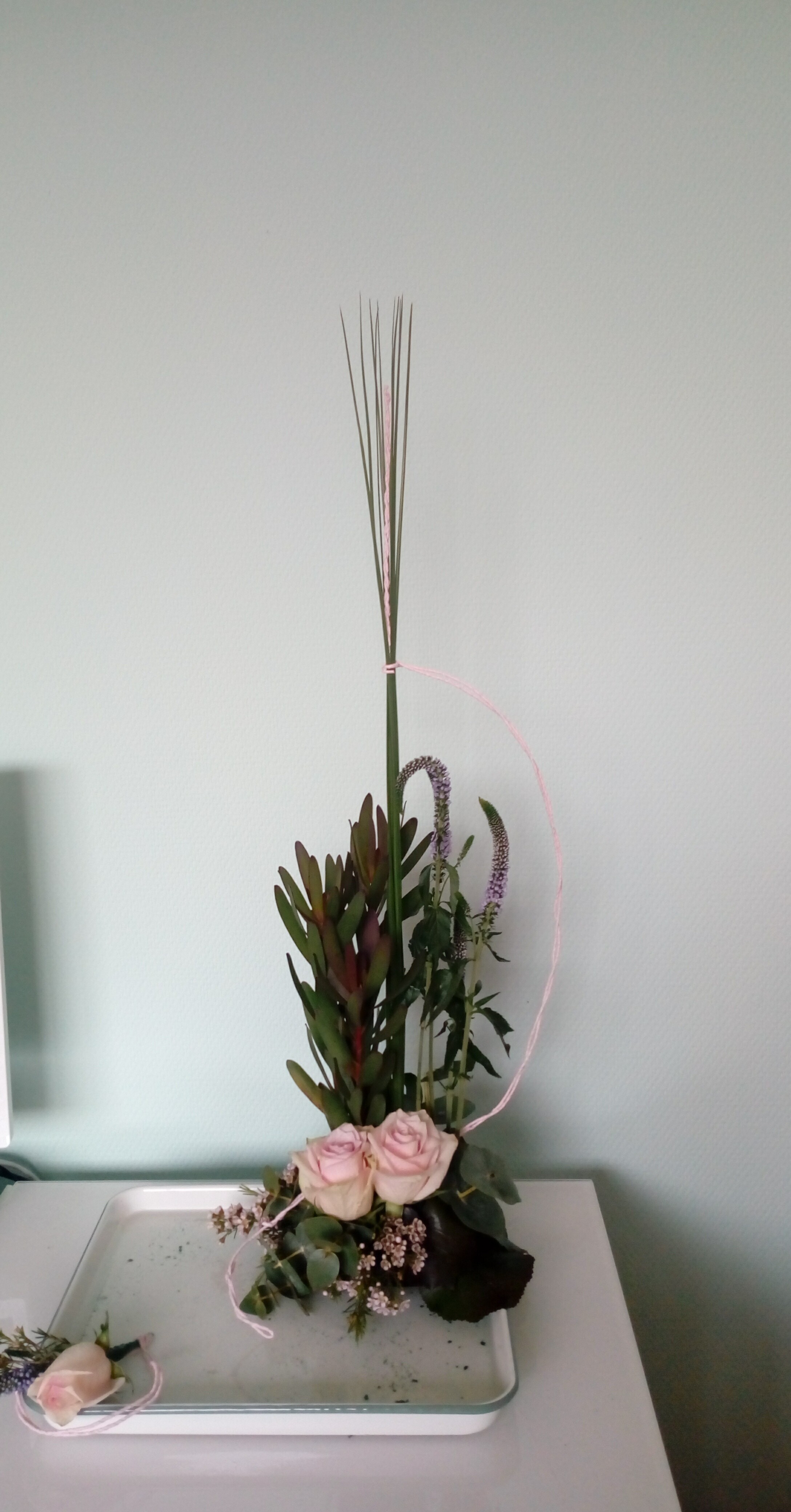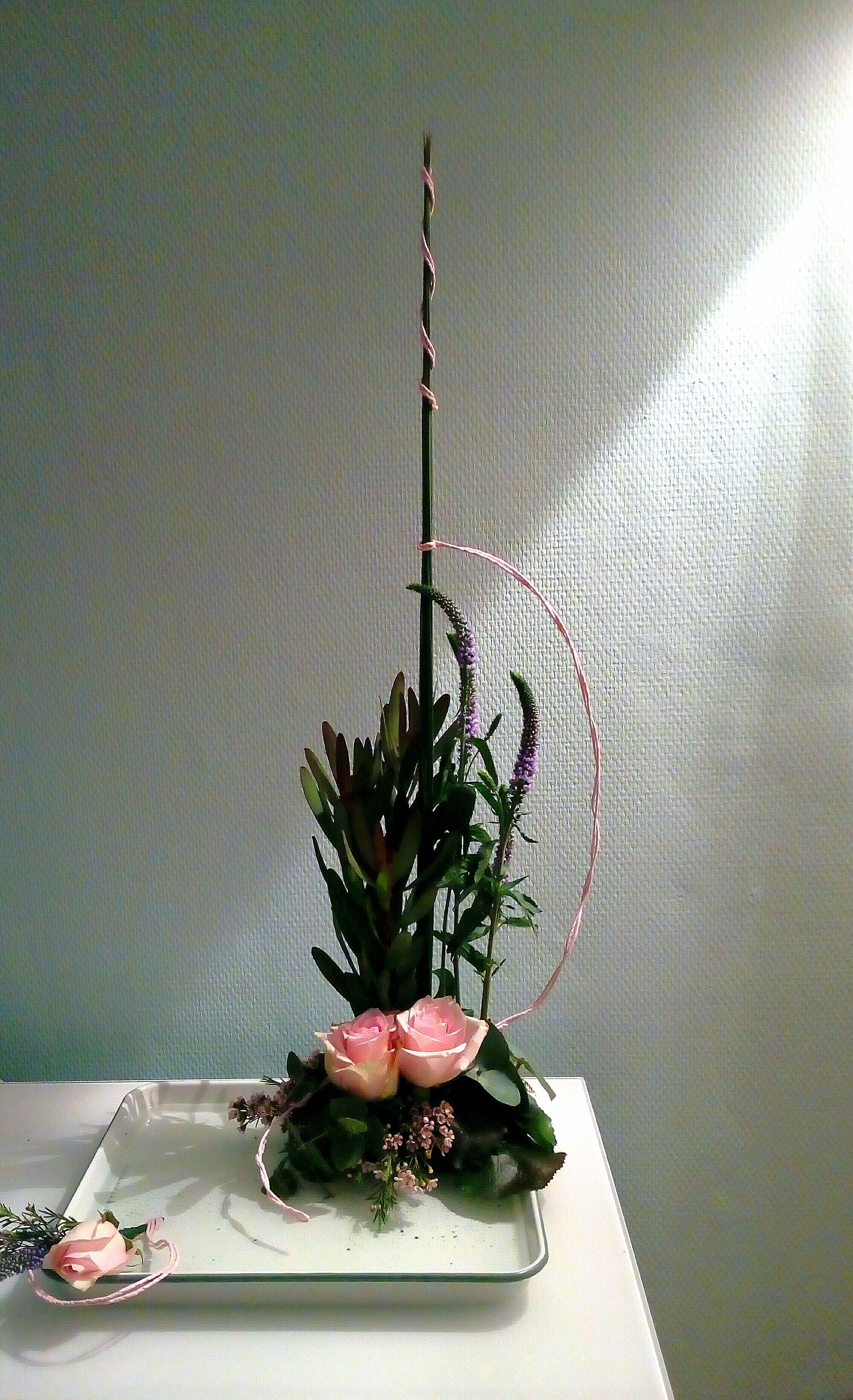 Hai Nicolle, Het was een pittige bevalling, kwam niet goed uit met de materialen, oasis begon af te brokkelen, ik wilde overnieuw beginnen. Niet gedaan, maar in plaats daarvan wat geëxperimenteerd: 1. geknutsel met aspidistra aan de achterzijde, 2. poging tot hogarth-lijn met bindwire om balans tussen links en rechts beter te krijgen, en tenslotte 3. de te kort afgeknipte roos maar in de hoek gelegd. Zie foto's van alle zijden. Alle feedback van harte welkom! Groetjes, Alieke