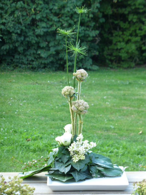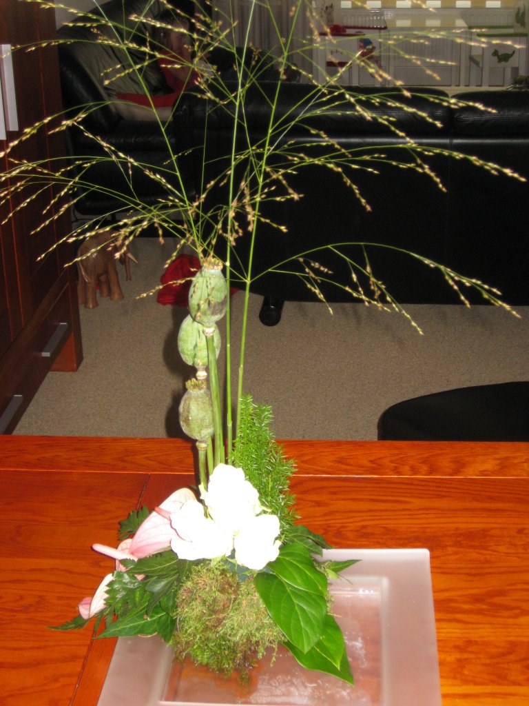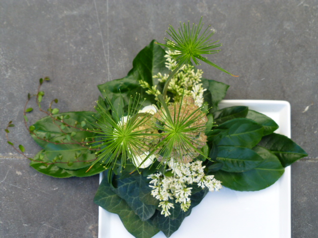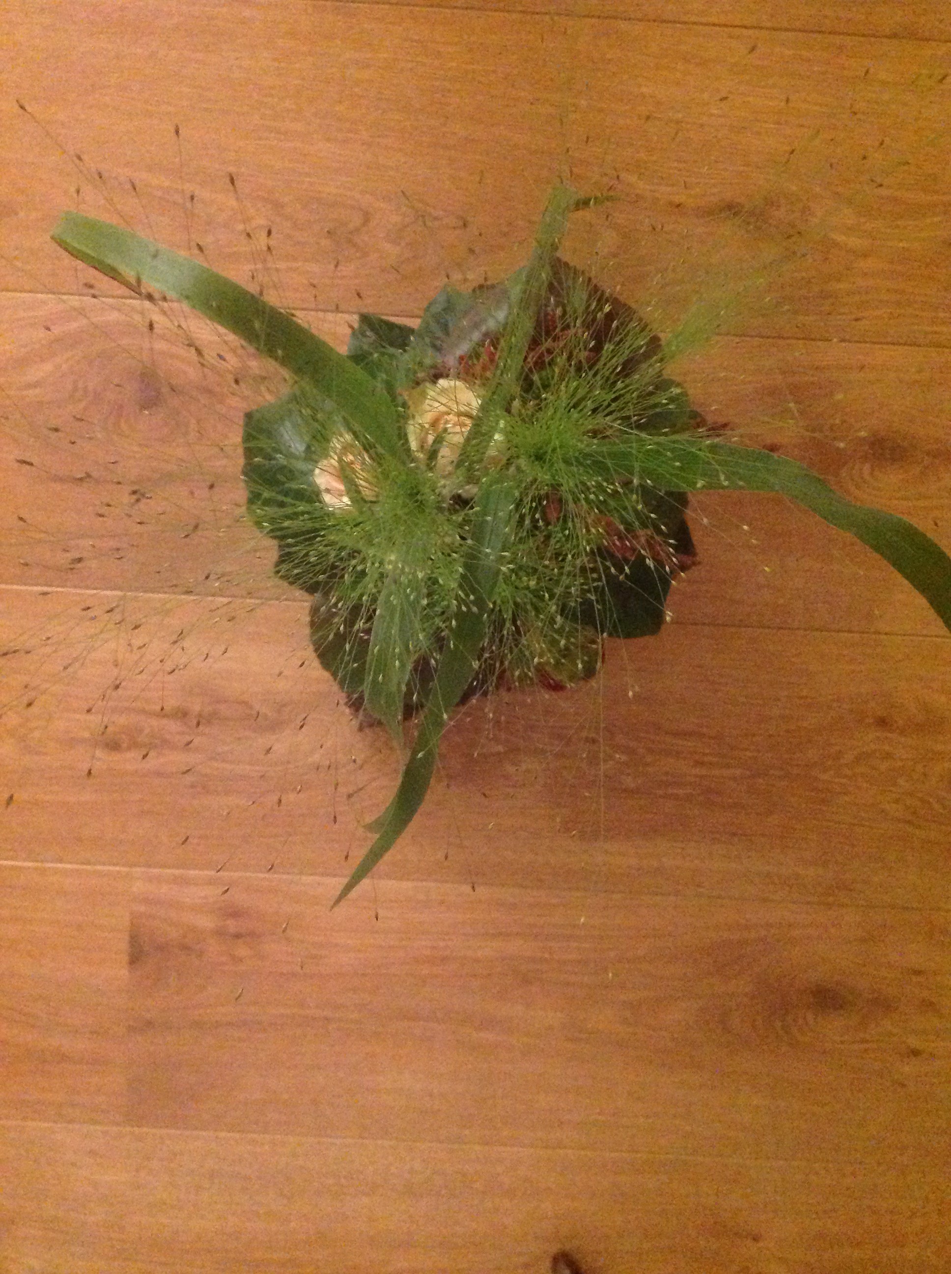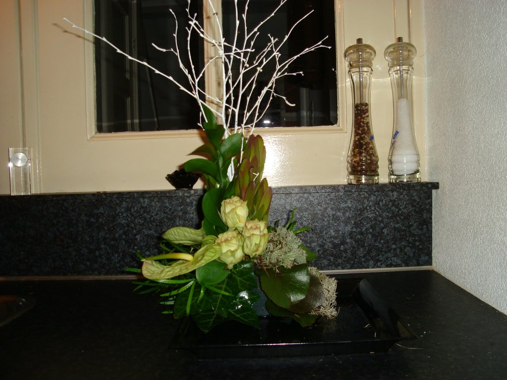 Hai Nicolle, Het was een pittige bevalling, kwam niet goed uit met de materialen, oasis begon af te brokkelen, ik wilde overnieuw beginnen. Niet gedaan, maar in plaats daarvan wat geëxperimenteerd: 1. geknutsel met aspidistra aan de achterzijde, 2. poging tot hogarth-lijn met bindwire om balans tussen links en rechts beter te krijgen, en tenslotte 3. de te kort afgeknipte roos maar in de hoek gelegd. Zie foto's van alle zijden. Alle feedback van harte welkom! Groetjes, Alieke