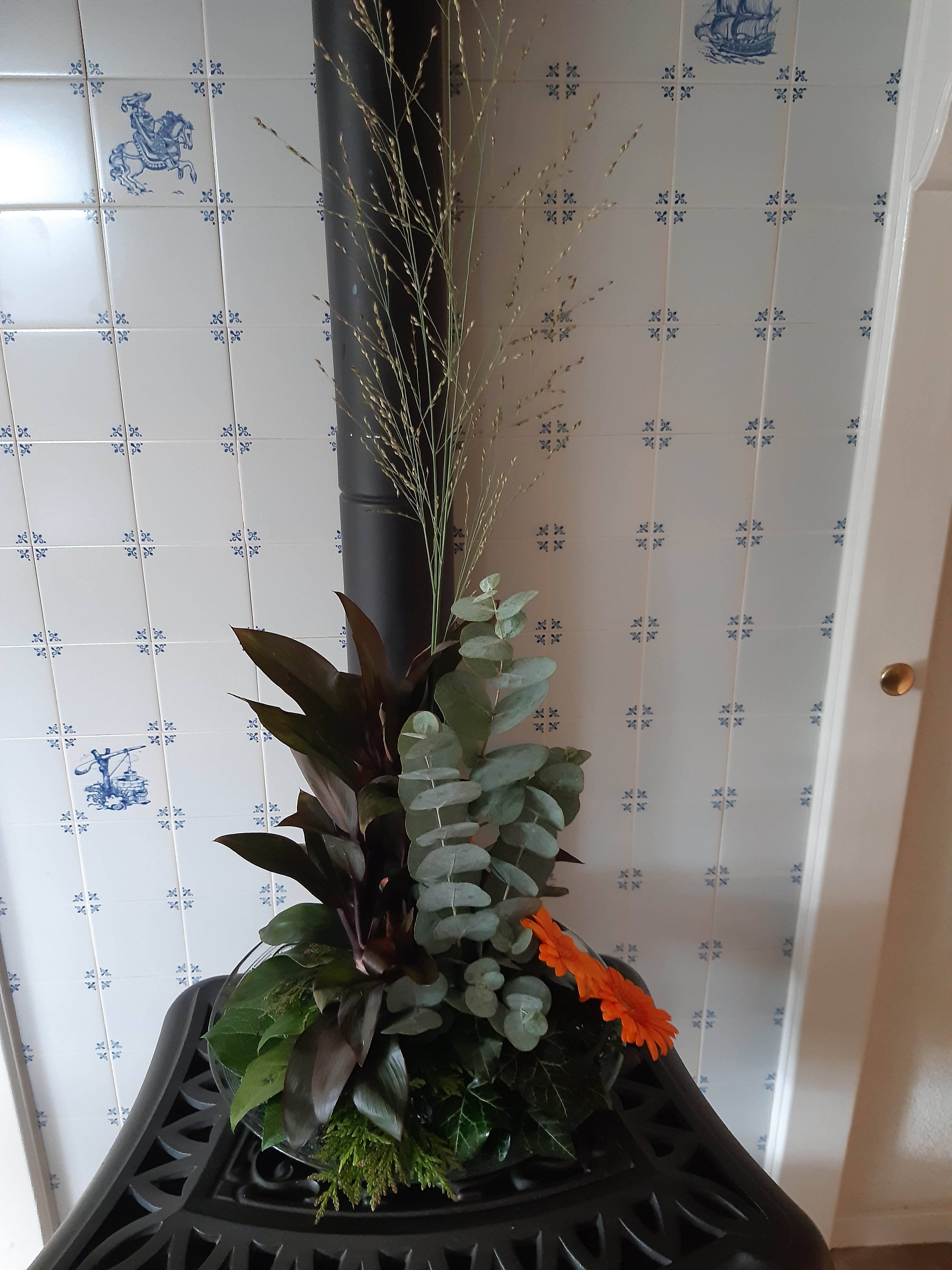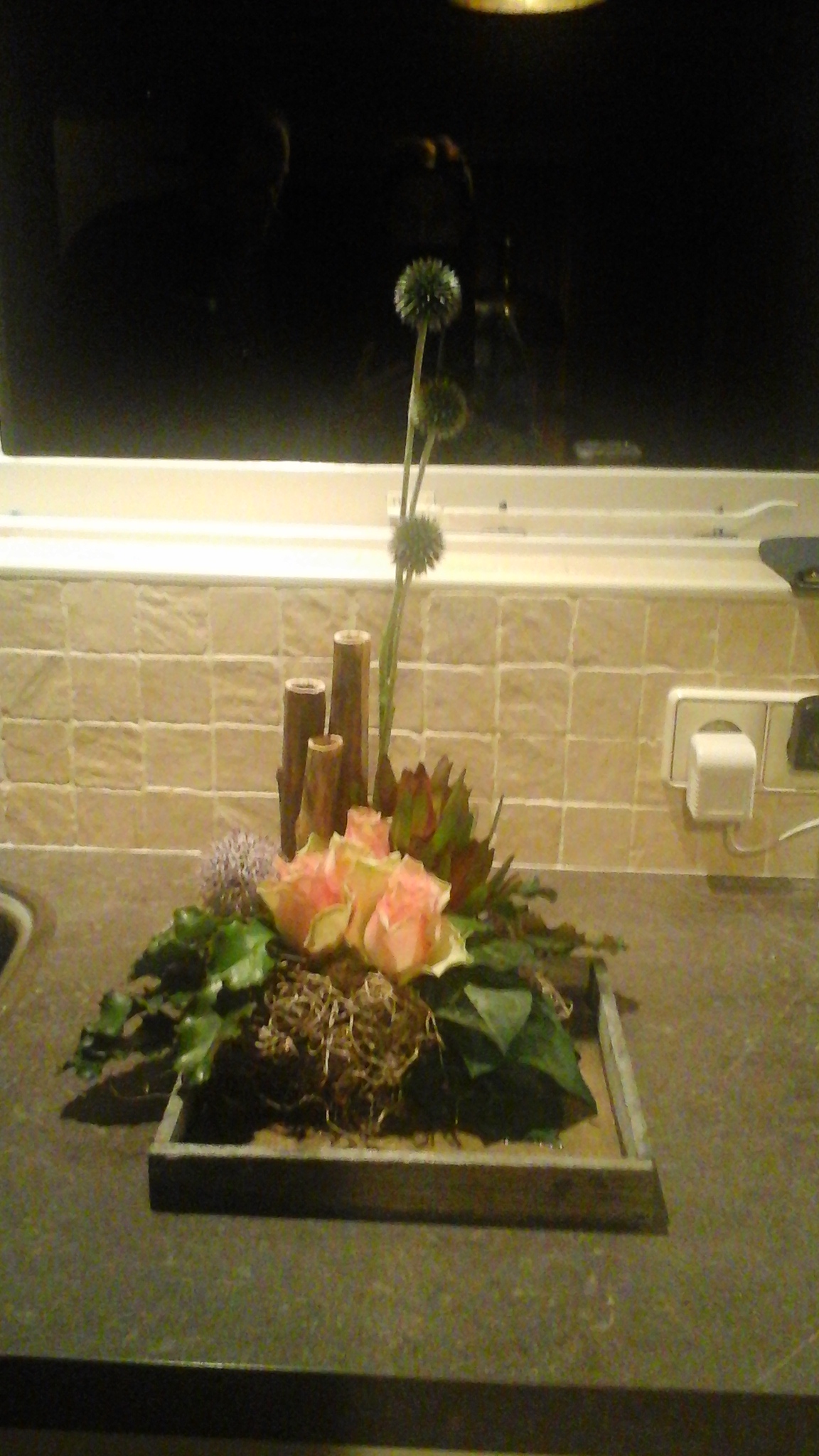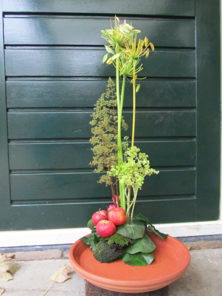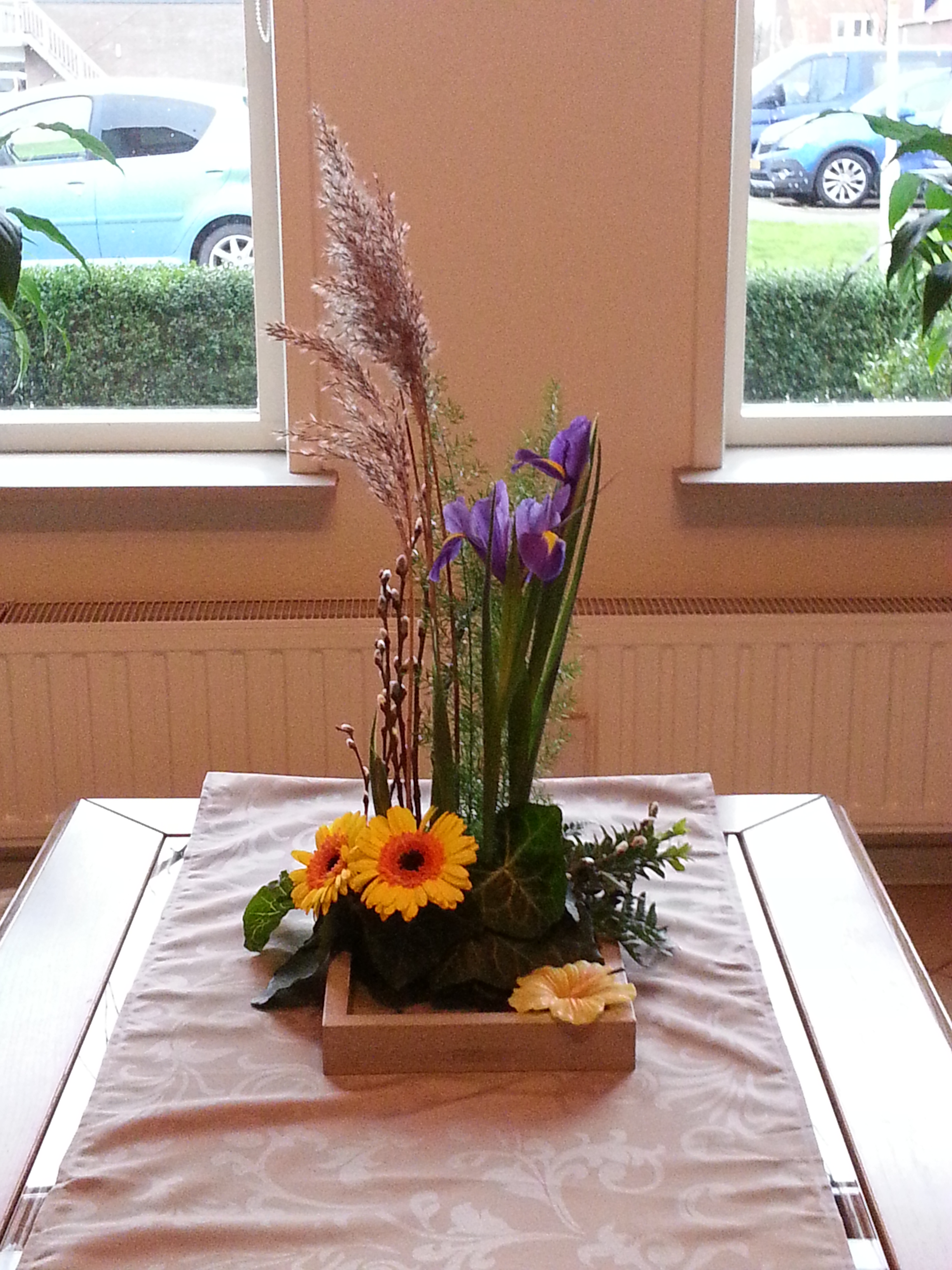 Heb dit arrangement gemaakt en ben benieuwd wat je ervan vindt. Hoop dat het een beetje klopt en hoor graag eventuele verbeteringen. Wat uit de natuur en wat uit de tuin.