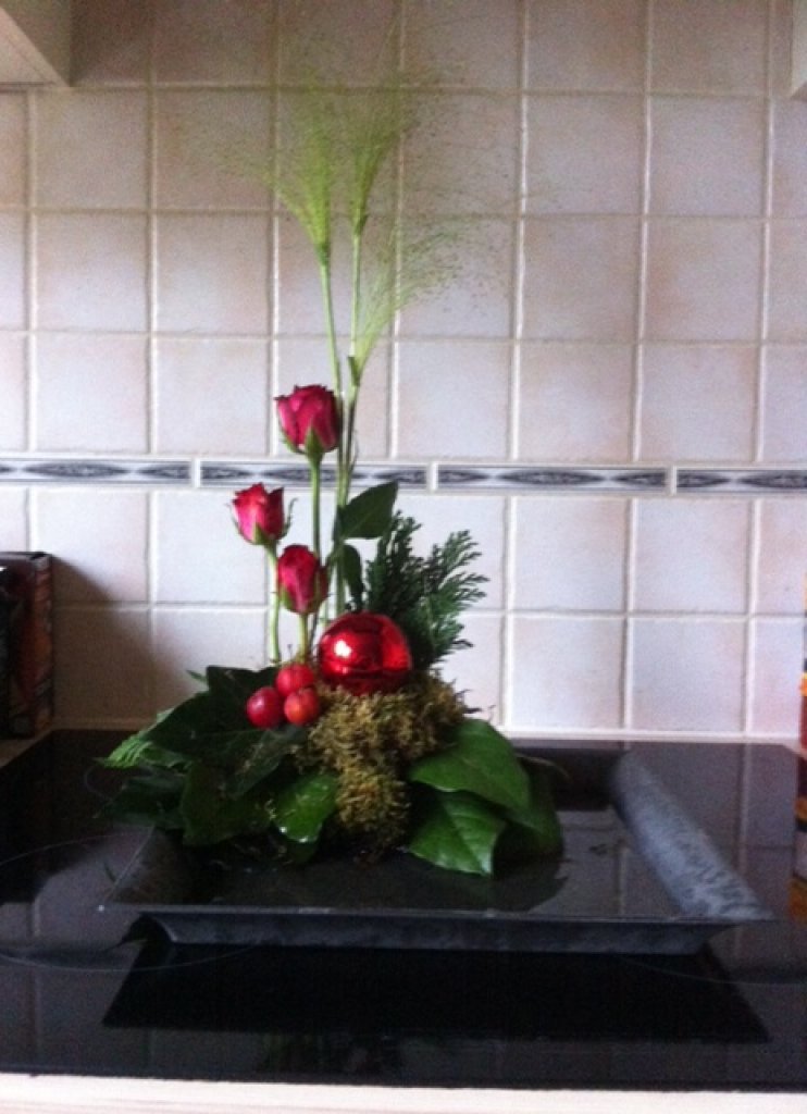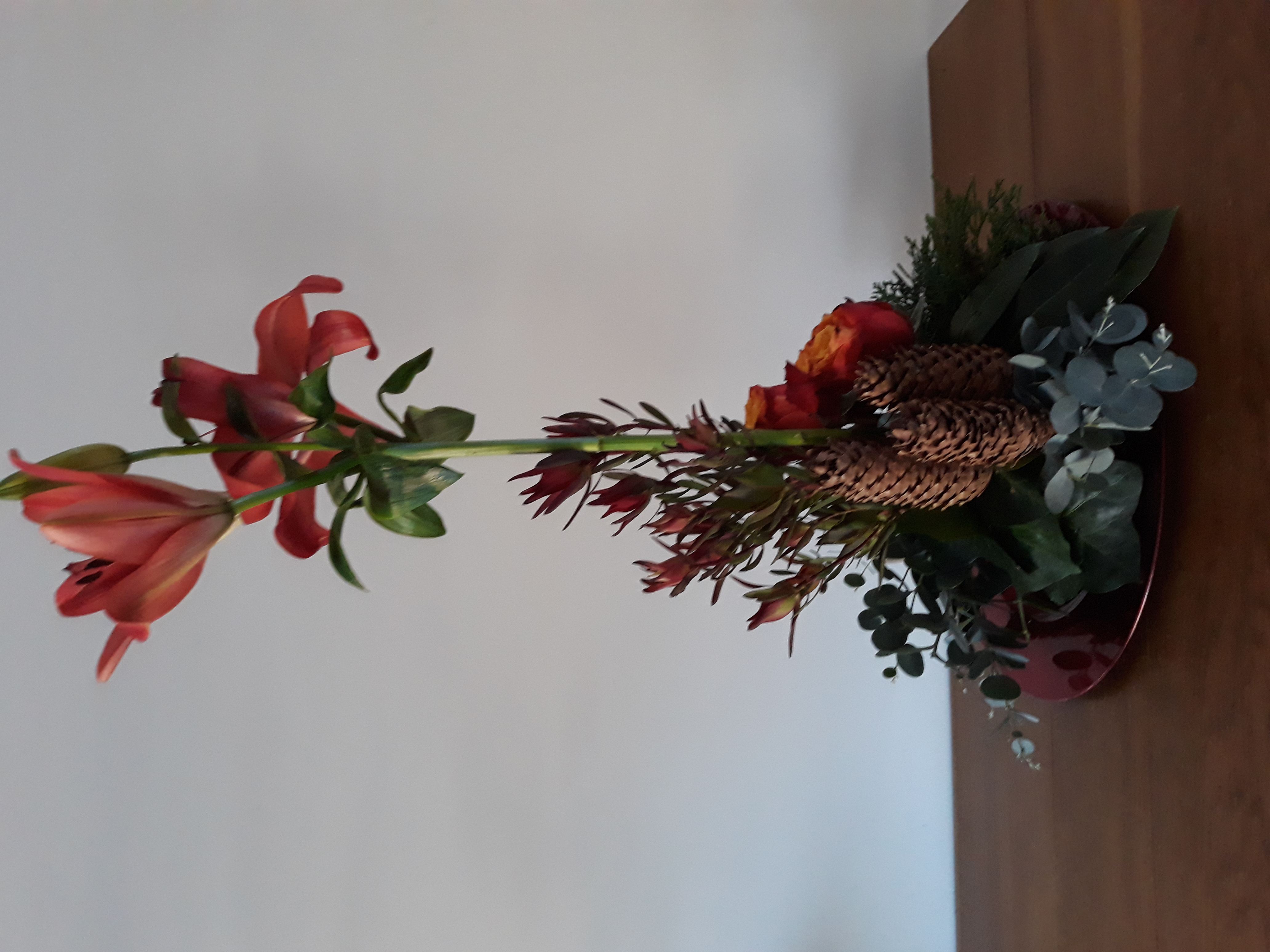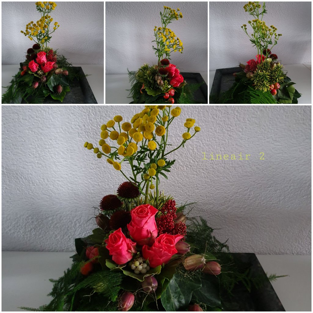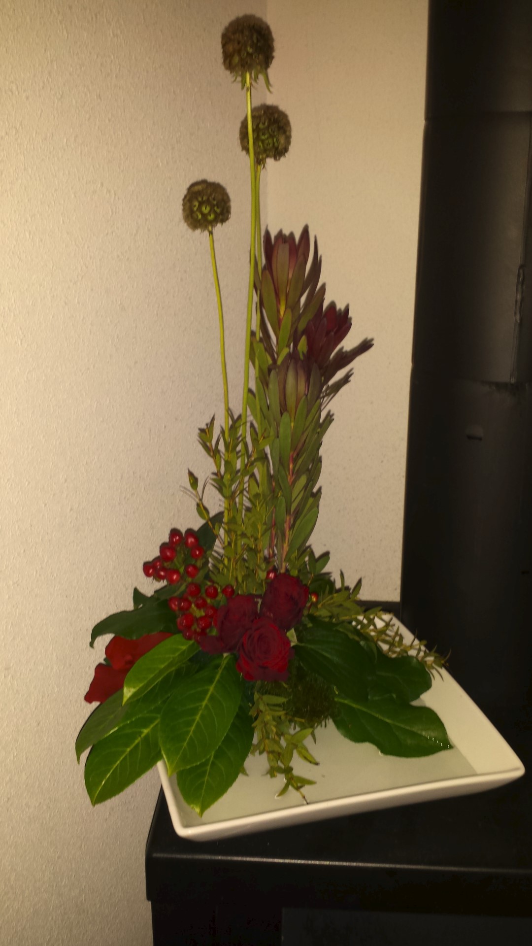 De lineaire schaalarrangement heb ik gemaakt, vond hem wat makkelijker dan de lineaire vaasschikking. Alleen ik had geen bolletjes mos dus ik heb rode blaadjes van de cordyline gebruikt met coniferengroen aan de voorkant van het arrangement. Groetjes Marjanne S