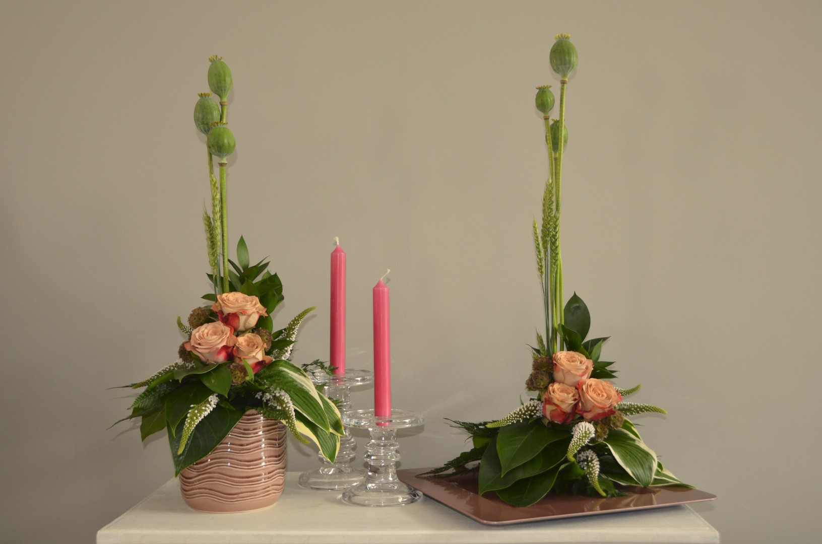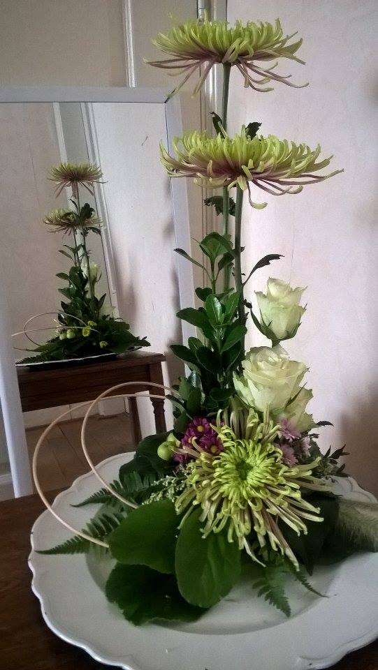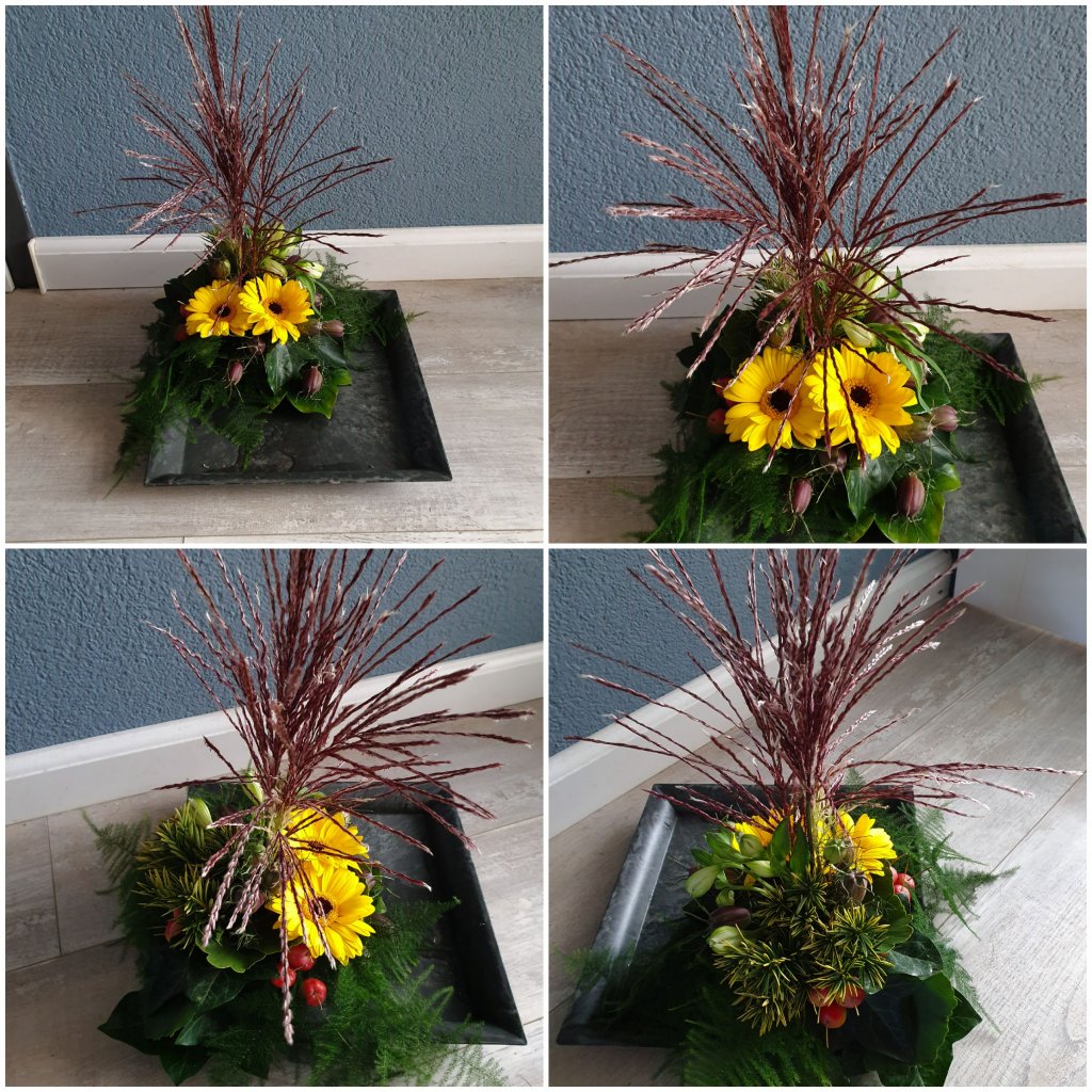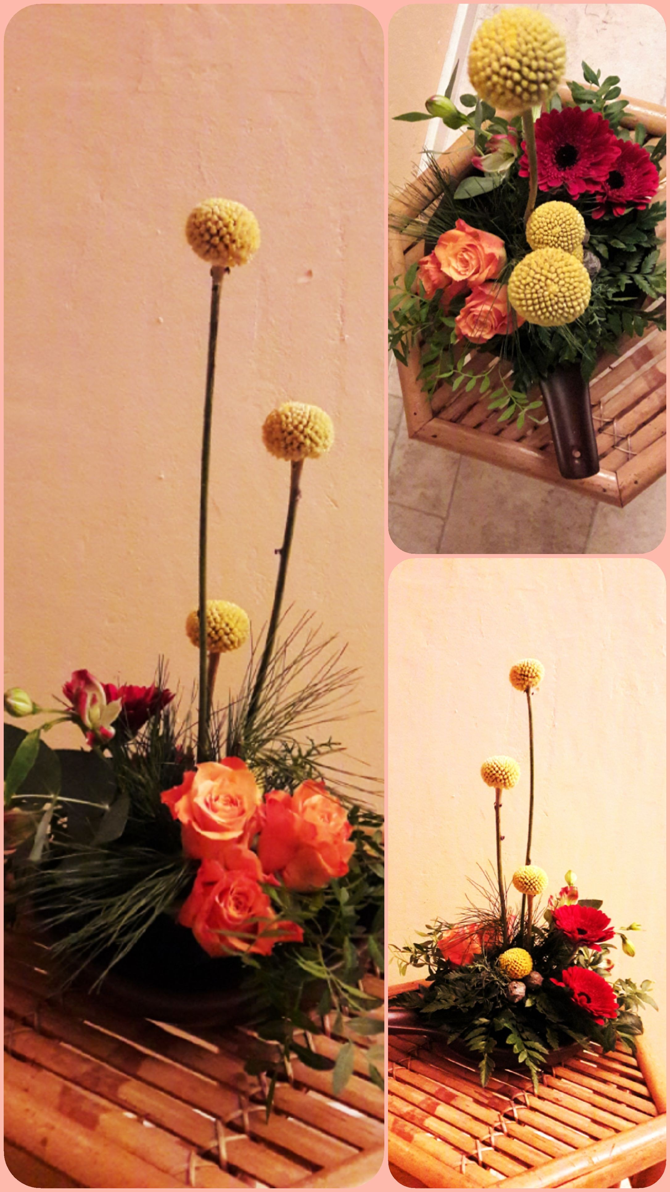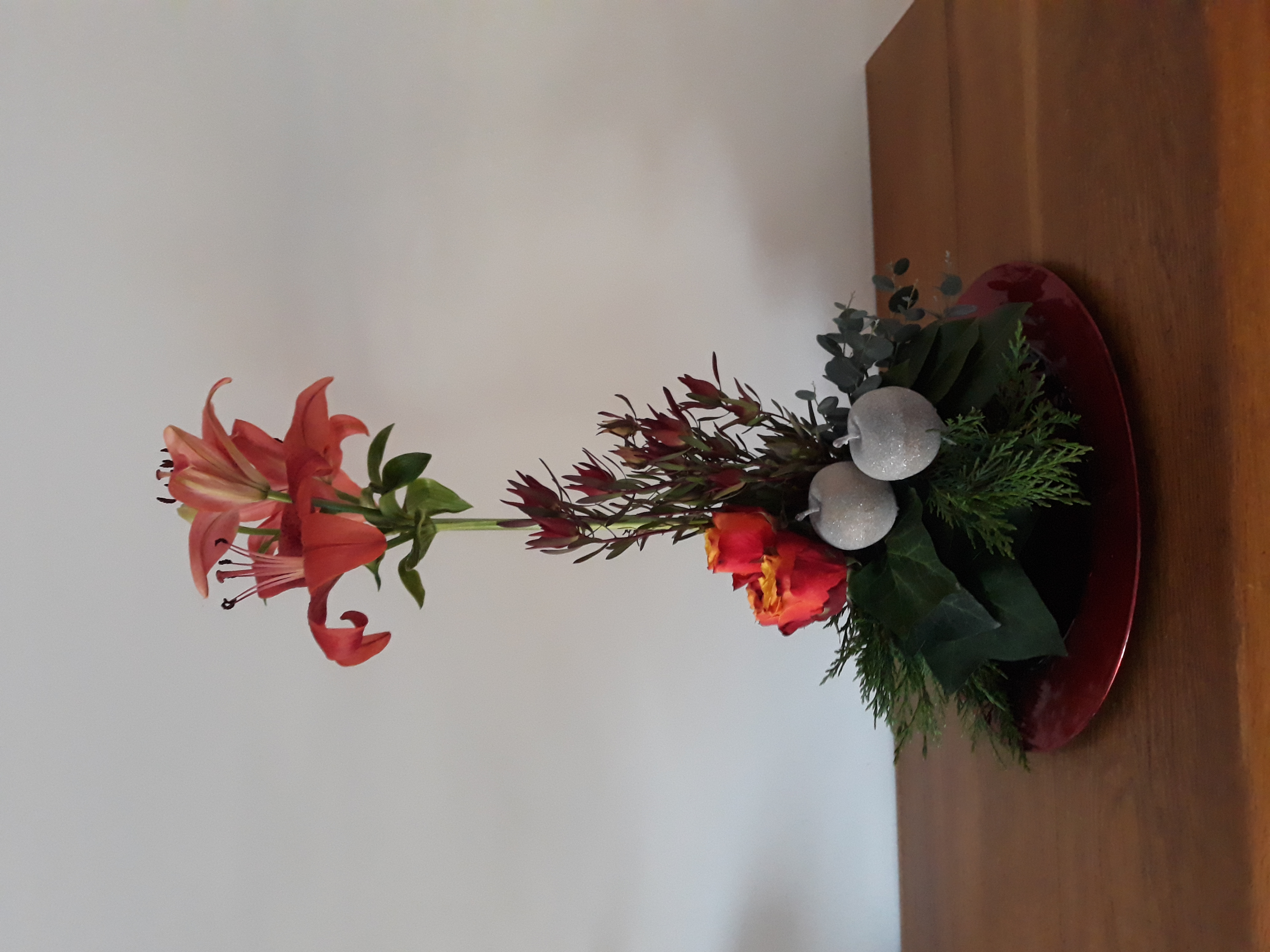 De lineaire schaalarrangement heb ik gemaakt, vond hem wat makkelijker dan de lineaire vaasschikking. Alleen ik had geen bolletjes mos dus ik heb rode blaadjes van de cordyline gebruikt met coniferengroen aan de voorkant van het arrangement. Groetjes Marjanne S