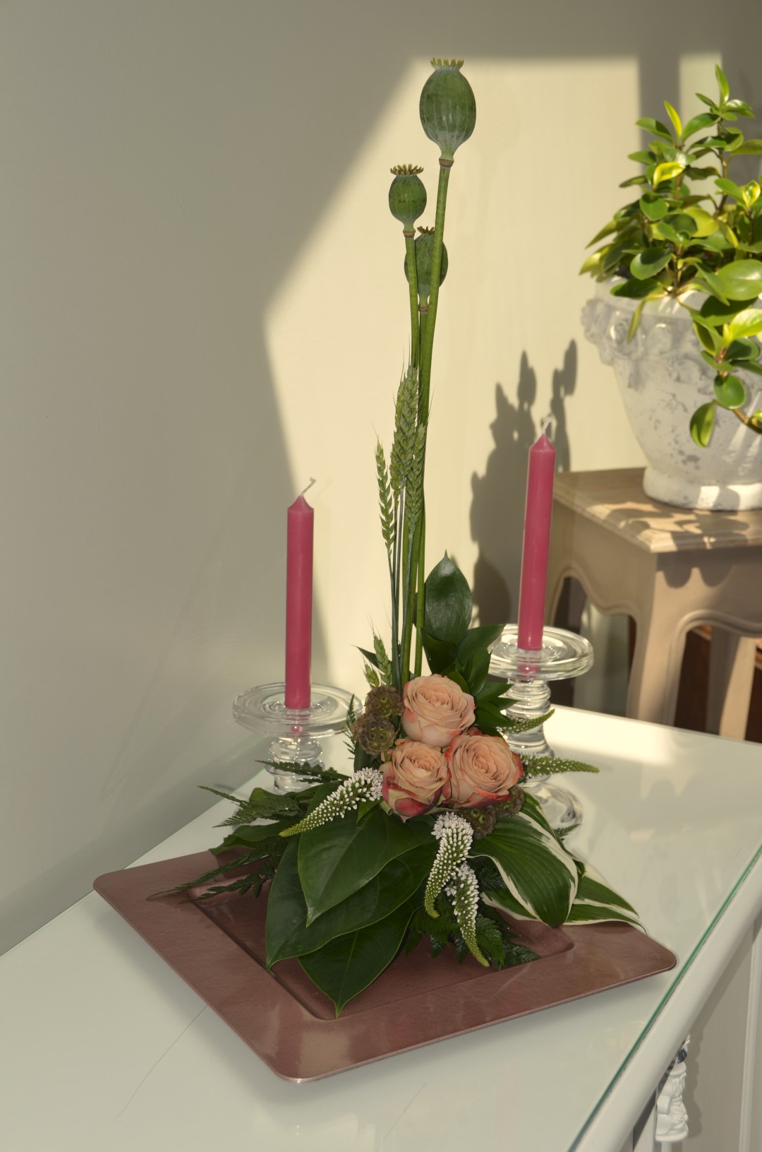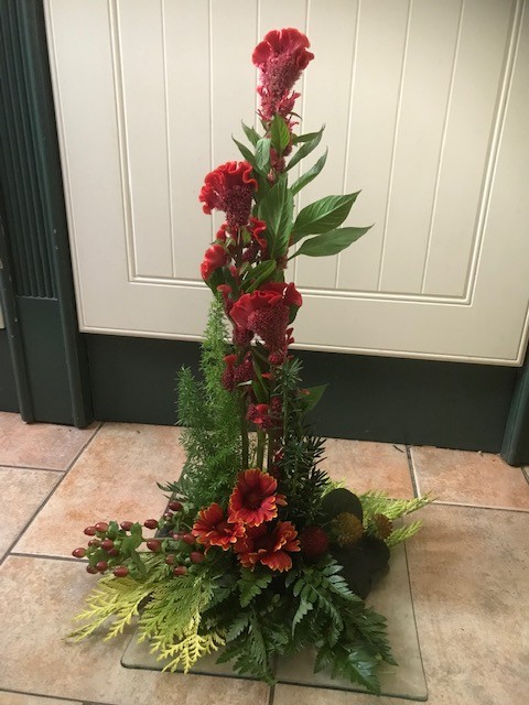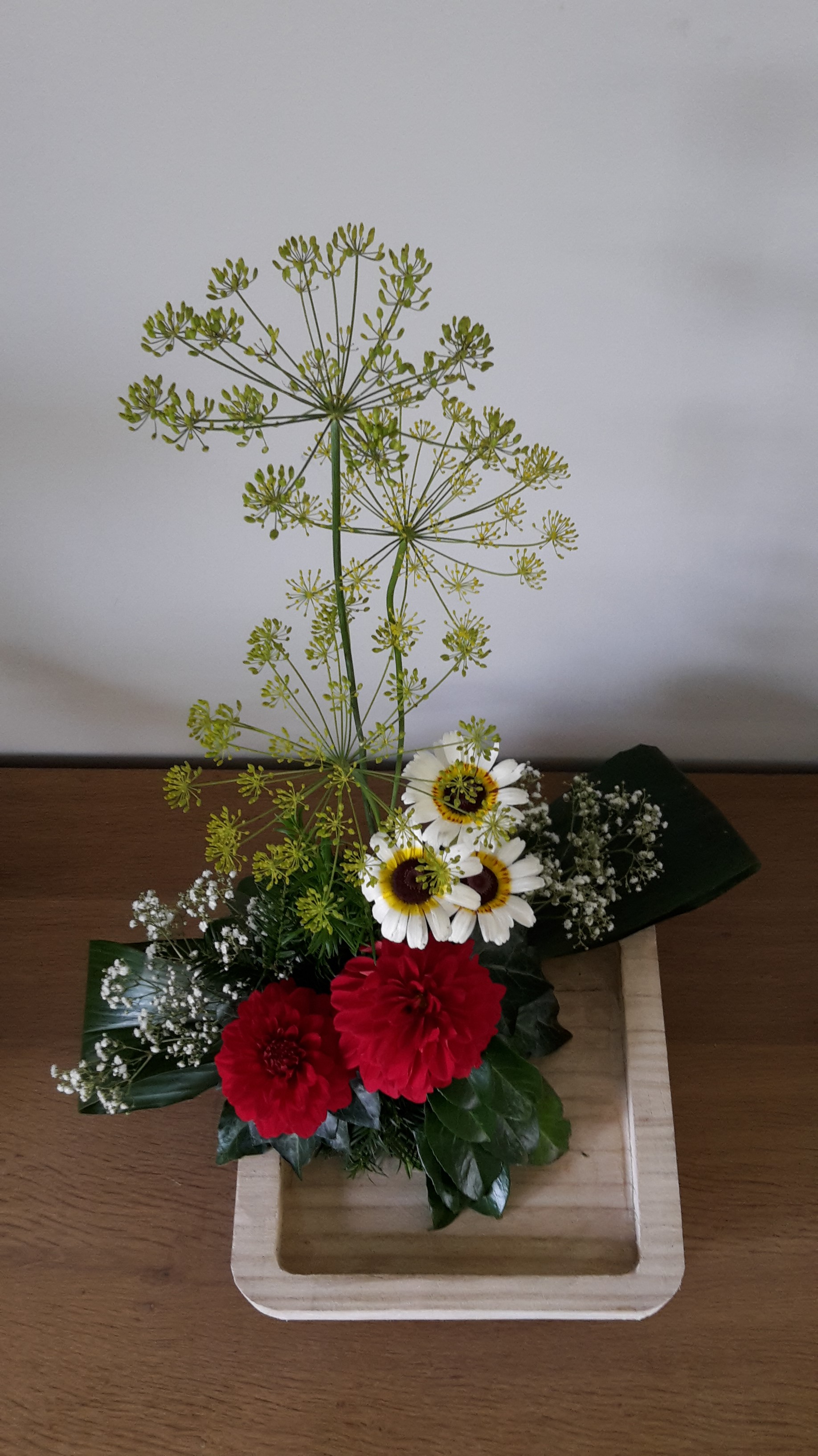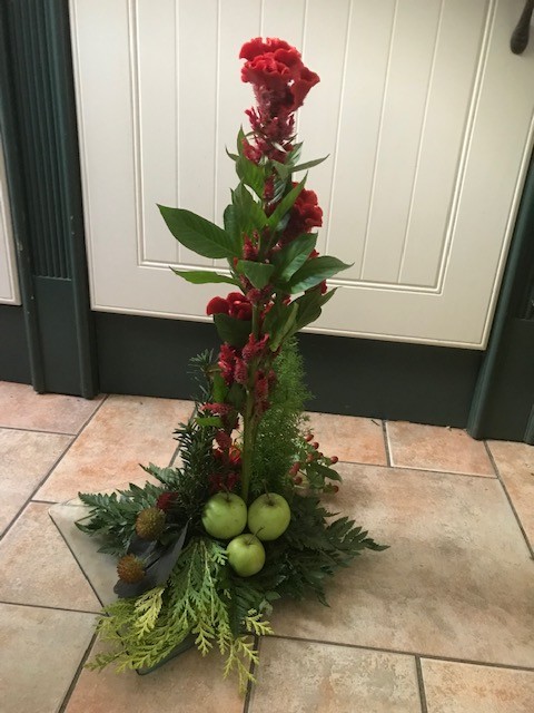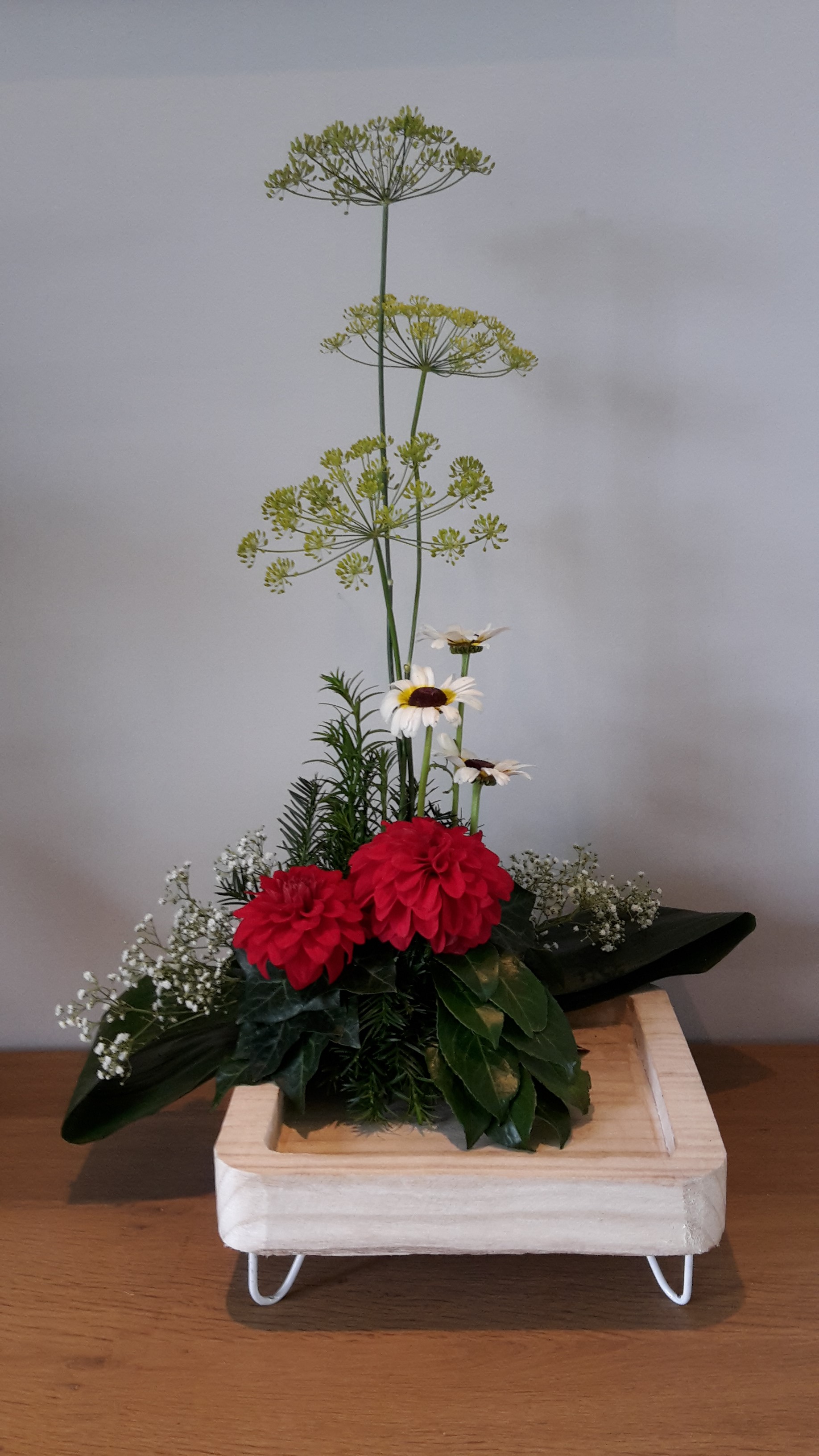 De lineaire schaalarrangement heb ik gemaakt, vond hem wat makkelijker dan de lineaire vaasschikking. Alleen ik had geen bolletjes mos dus ik heb rode blaadjes van de cordyline gebruikt met coniferengroen aan de voorkant van het arrangement. Groetjes Marjanne S