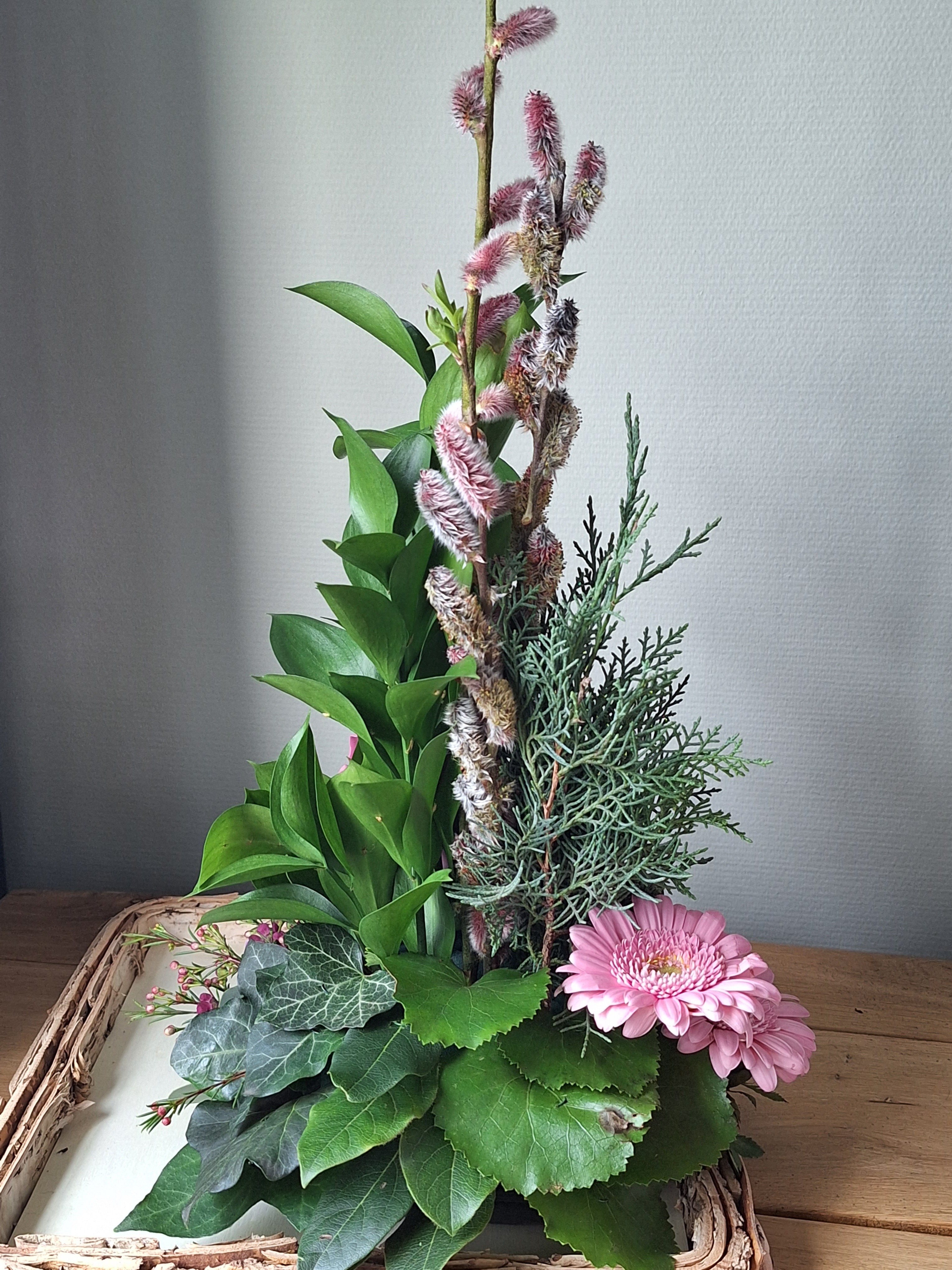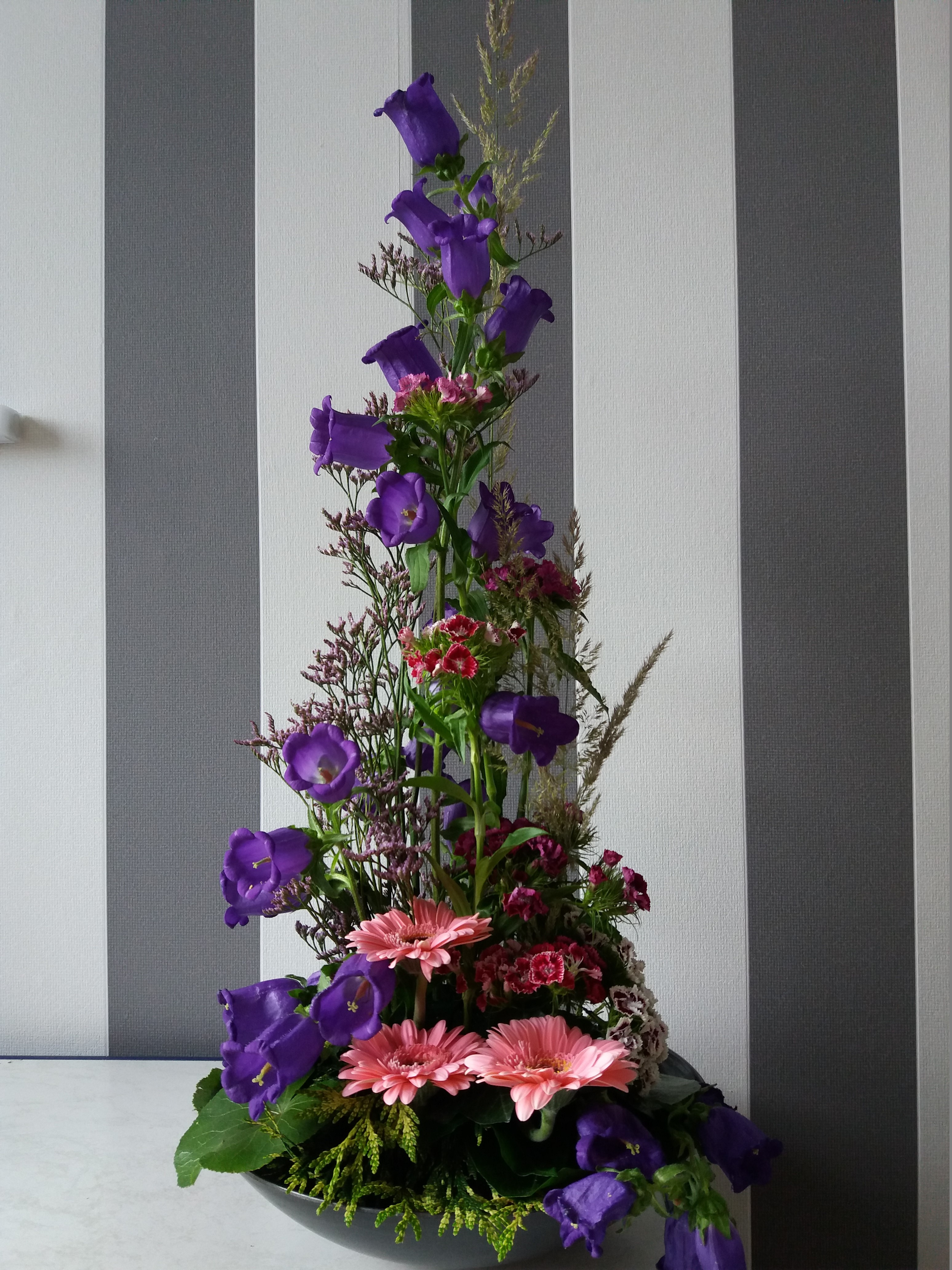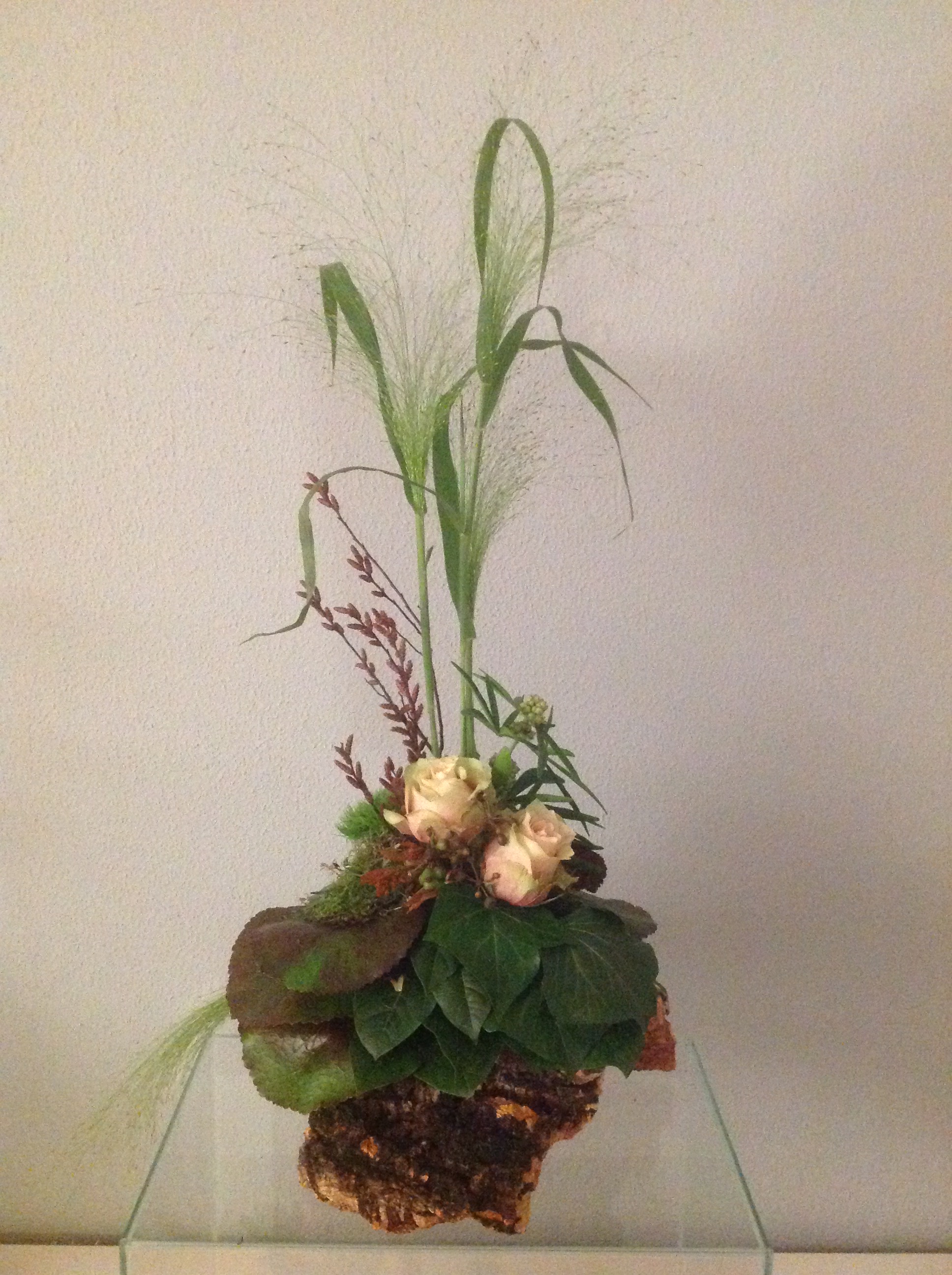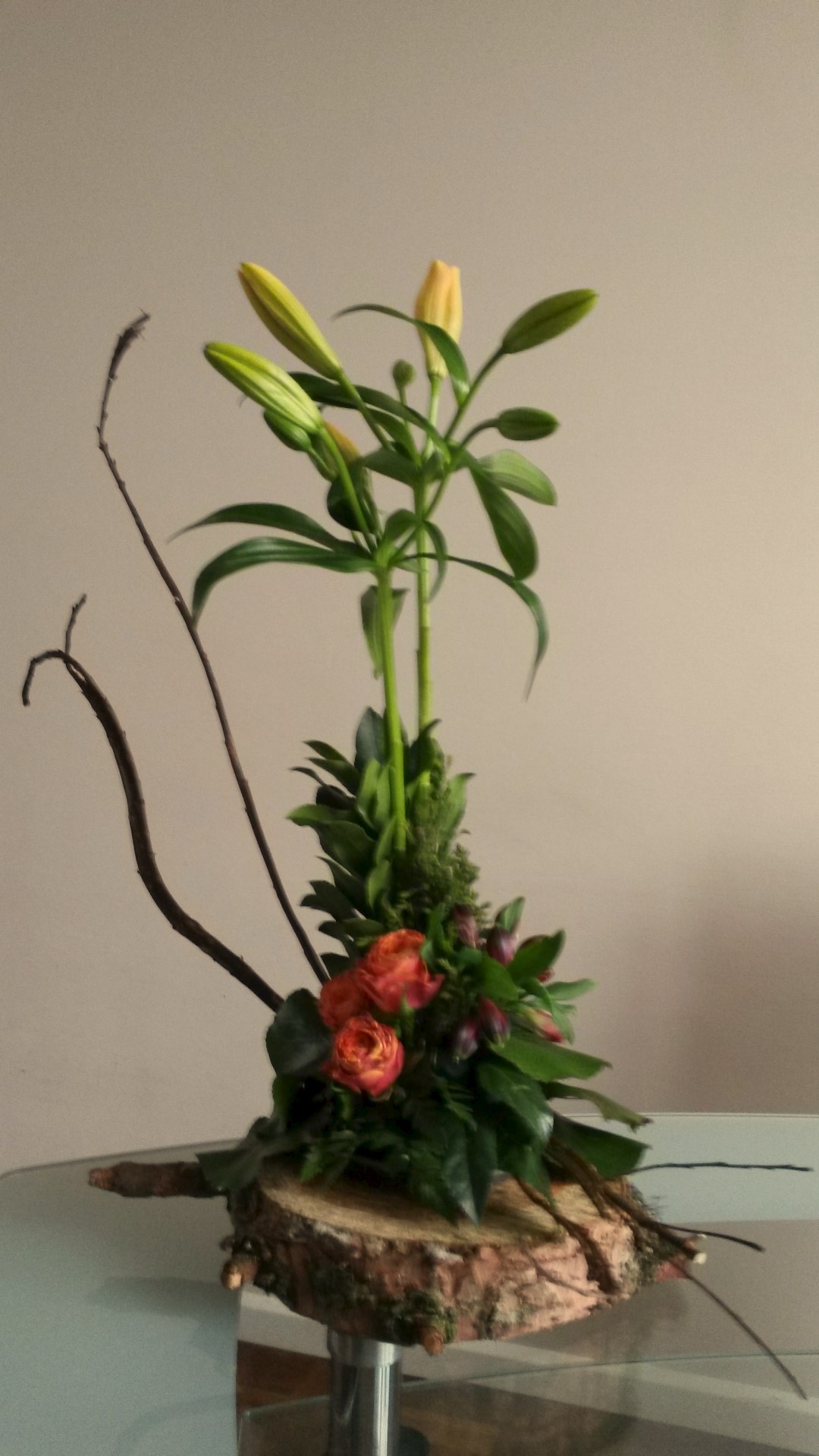 Hoi Jacqueline, Daar was je moeder vast heel blij mee. Leuke, rijke materialen. Je lijnen zijn prima. Ik mis een beetje de holle lijn, dit komt omdat je best veel bloemen in de hoogte hebt gebruikt. Dat geeft een mooi resultaat, maar hoeft niet. Ook de twee op je boomschijf zijn erg mooi geworden. Natuurlijk materiaal is weer helemaal in. Wel zou het handig zijn als je een er een waterschotel zou hebben. Dan kan je ze later ook goed water geven. Probeer ook eens de Alstoemeria samen als hoogste te gebruiken, dan even niks en dan je holle lijn. Dat geeft ook een leuk effect. Ga lekker zo door. Groetjes, Nicolle