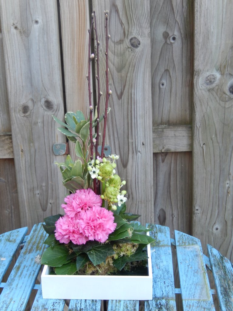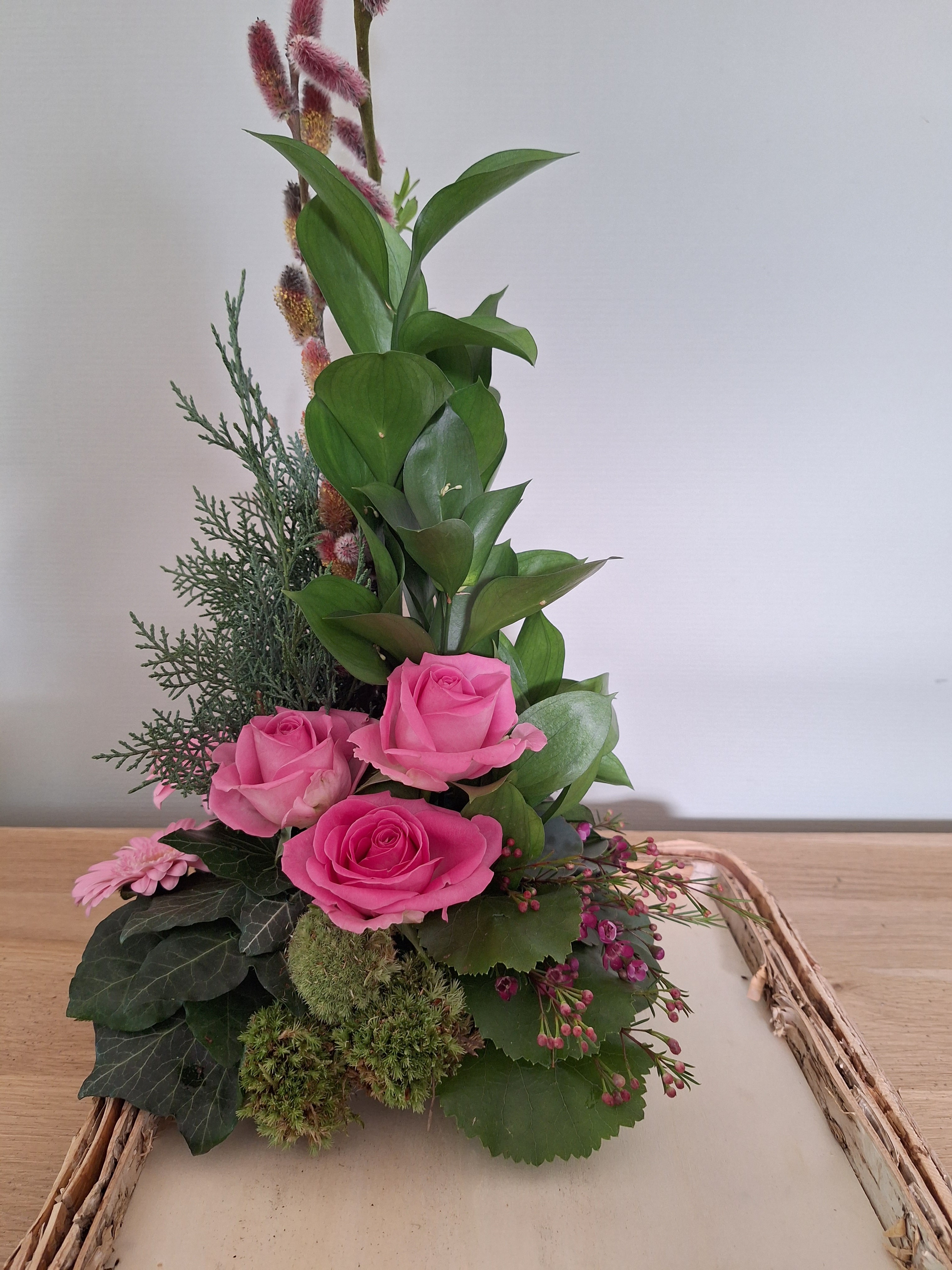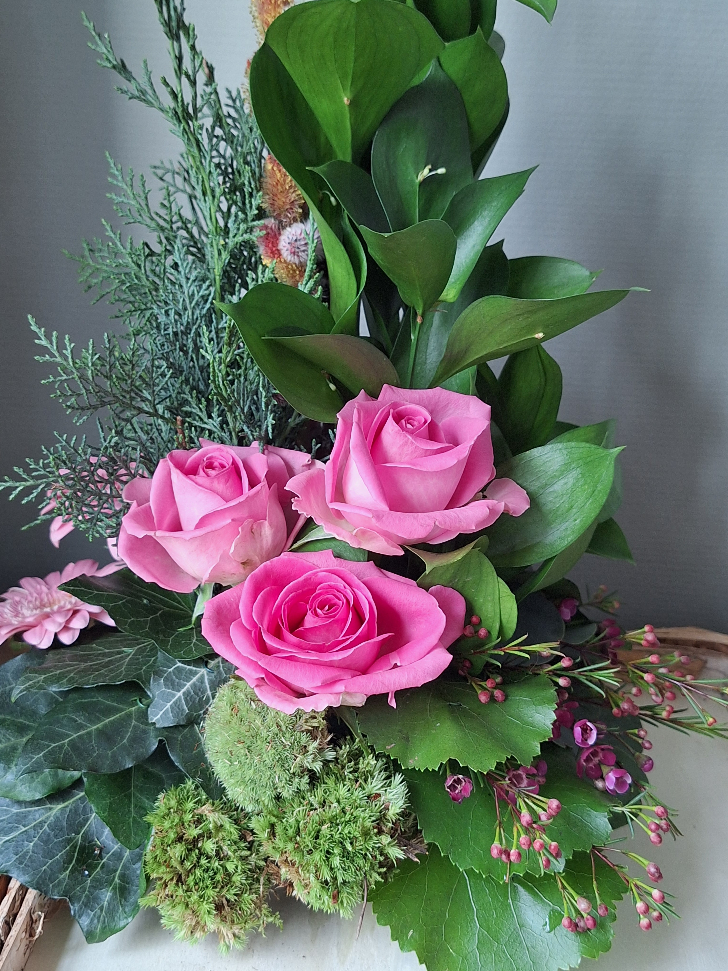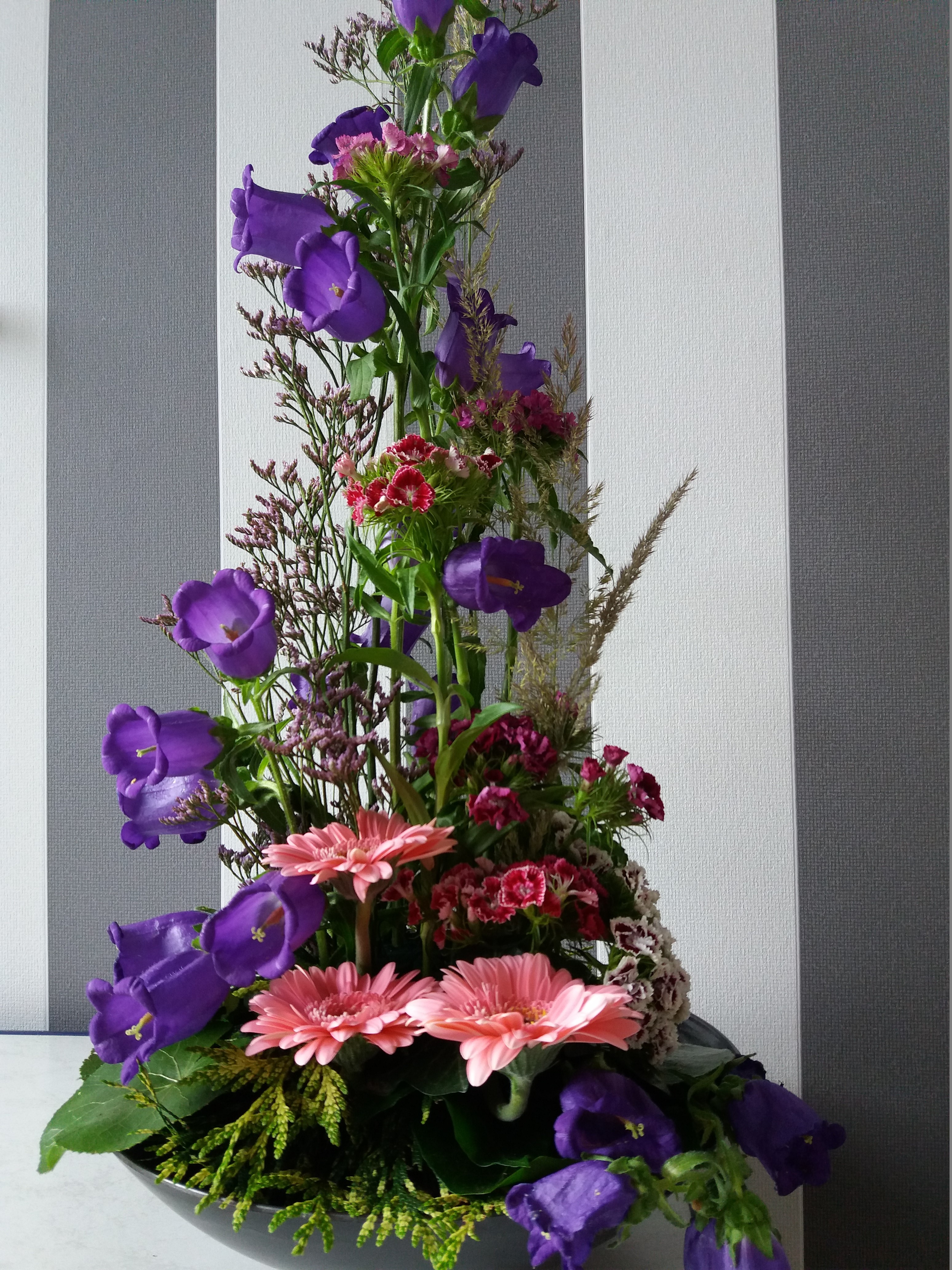 Hoi Jacqueline, Daar was je moeder vast heel blij mee. Leuke, rijke materialen. Je lijnen zijn prima. Ik mis een beetje de holle lijn, dit komt omdat je best veel bloemen in de hoogte hebt gebruikt. Dat geeft een mooi resultaat, maar hoeft niet. Ook de twee op je boomschijf zijn erg mooi geworden. Natuurlijk materiaal is weer helemaal in. Wel zou het handig zijn als je een er een waterschotel zou hebben. Dan kan je ze later ook goed water geven. Probeer ook eens de Alstoemeria samen als hoogste te gebruiken, dan even niks en dan je holle lijn. Dat geeft ook een leuk effect. Ga lekker zo door. Groetjes, Nicolle