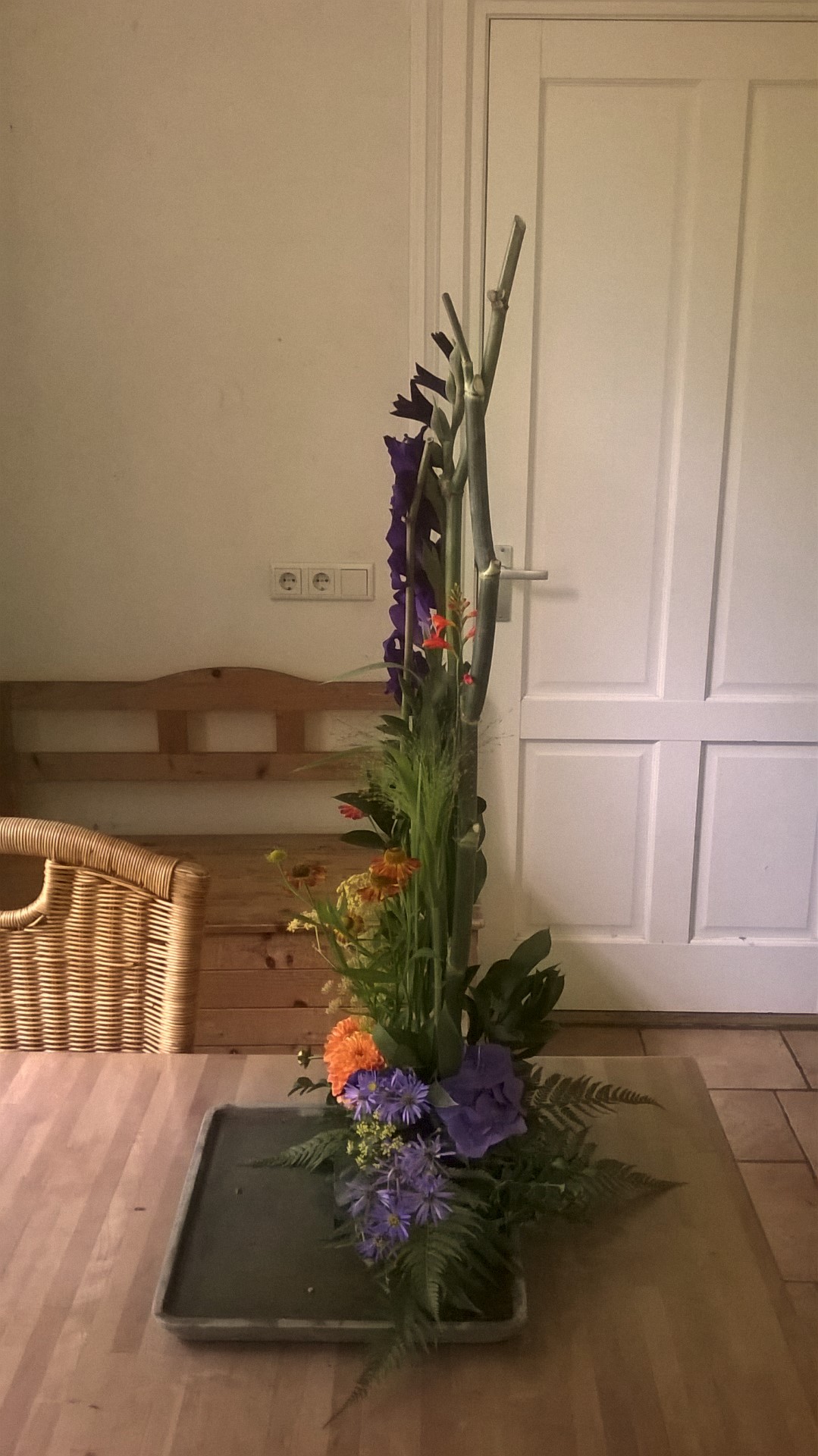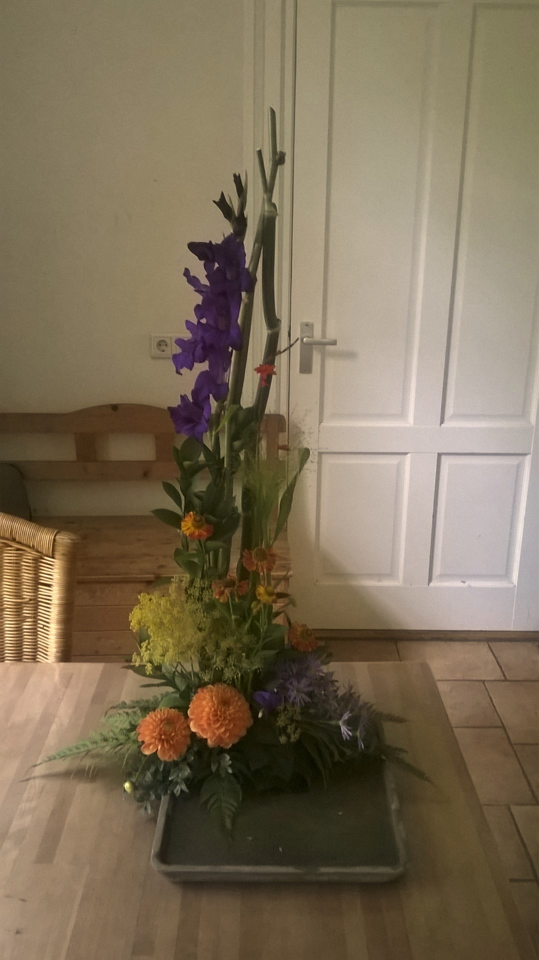 Dag Nicolle, Vooral de kleuren vind ik gewaagd geworden. De oranje bloemen had ik op stage uitgezocht. De paarse gladiool komt uit eigen tuin, en wilde ik er heel graag bij door de vorm. gelukkig had ik nog wat meer paars in de tuin.... Groetjes, Jannette