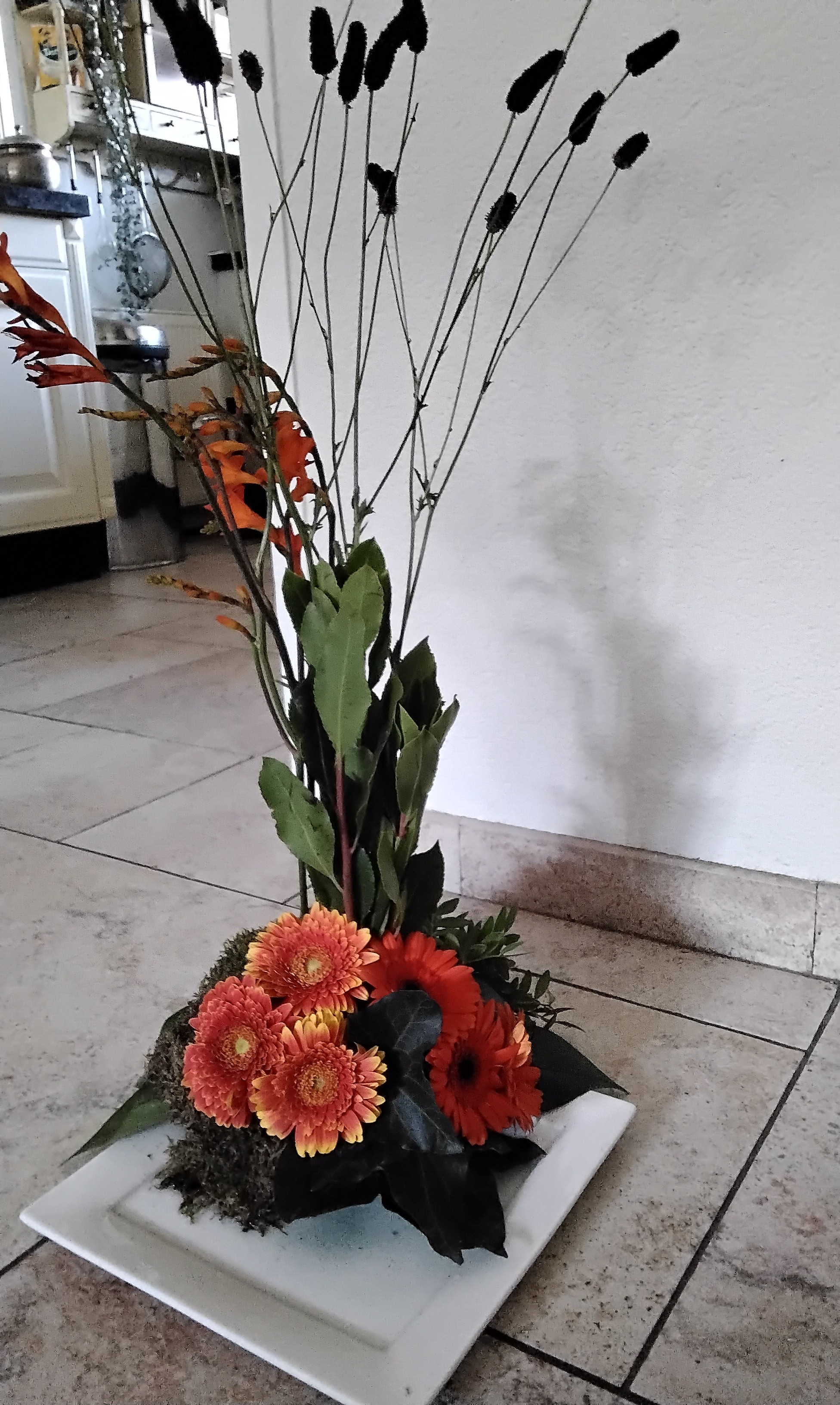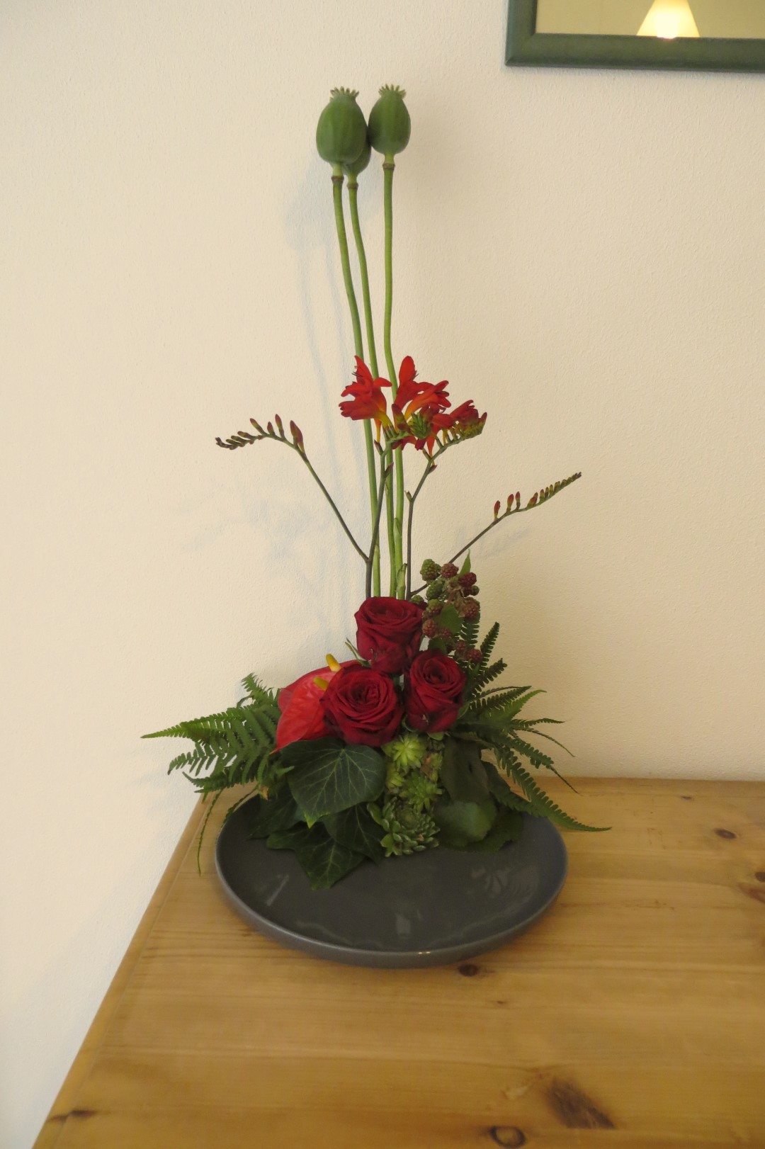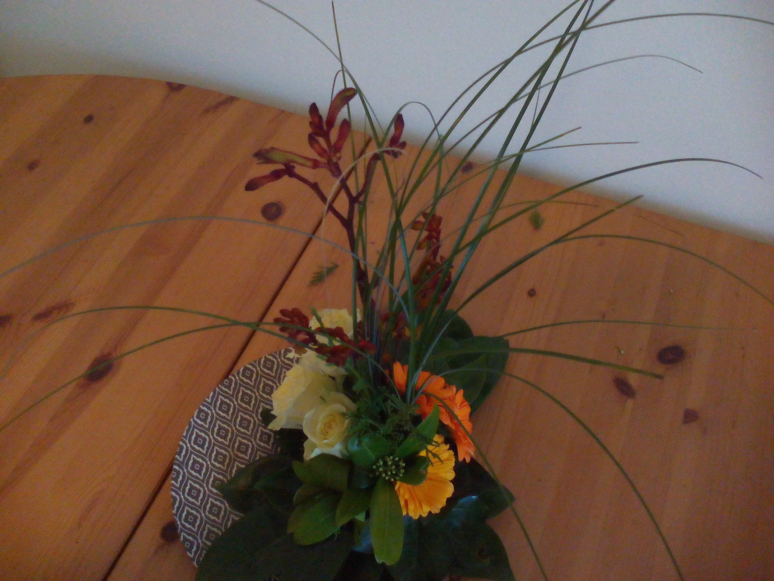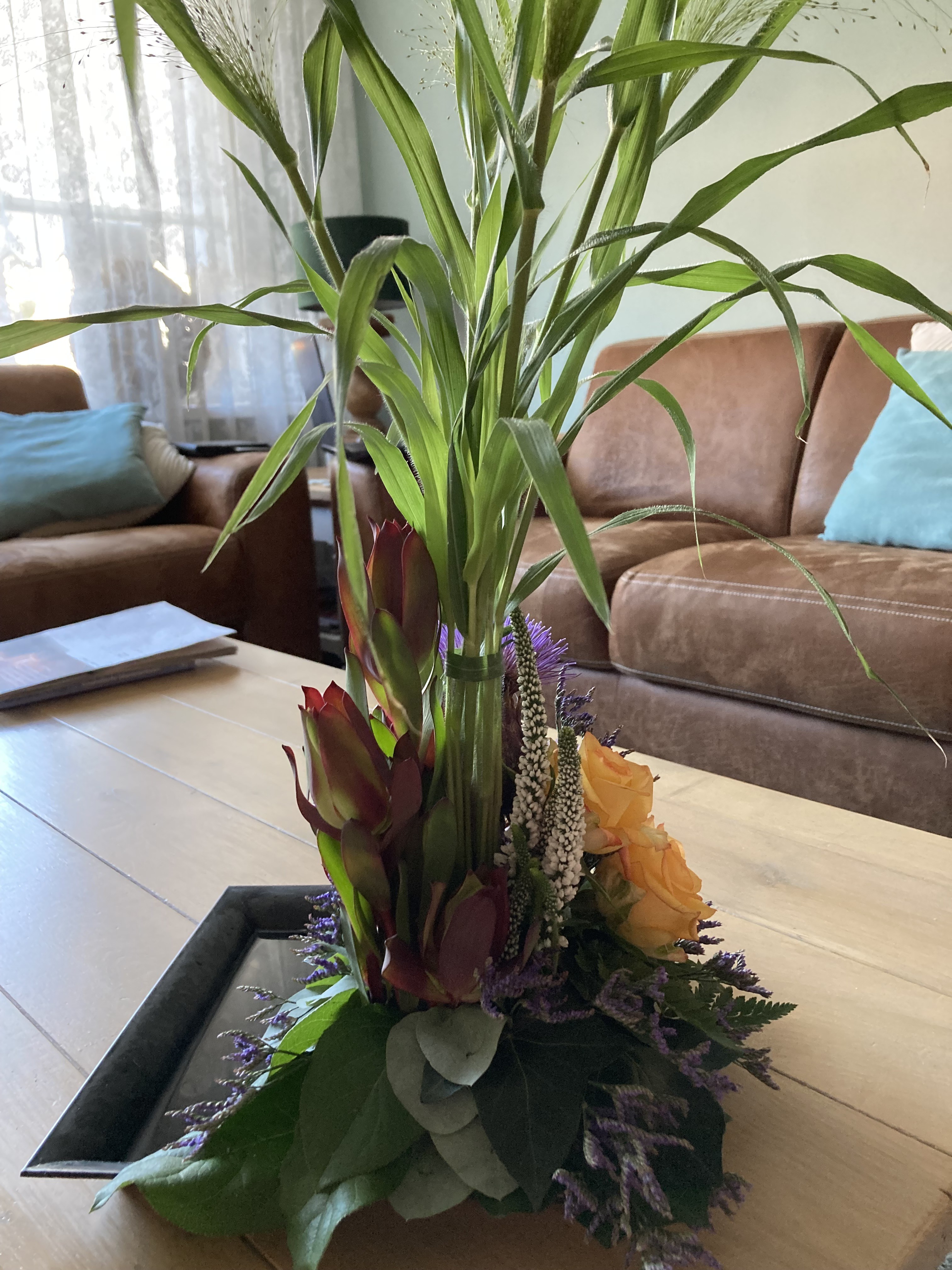 Ook je Anigozonthos had je langste bloemen kunnen zijn. Of als tweede hoogte, dan had je wat meer kleur in de hoogte gehad. Had je hem eerst als handgebonden boeket vast gehouden? Dan kan je makkelijk schuiven. Zoals hij nu is ...is hij ook prima, maar ik denk dat ik de grassen als hoogste had gepakt ernaast de Anigozanthos dan aan de andere kant de rozen en nog korter schuin aan de achterkant de Papaver en de Gerbera's in het hart. Kan je het een beetje voor je zien? :-) Dan zou je meer kleur bovenin krijgen, maar hoef je ook je duren bloemen niet zo kort af te snijden.