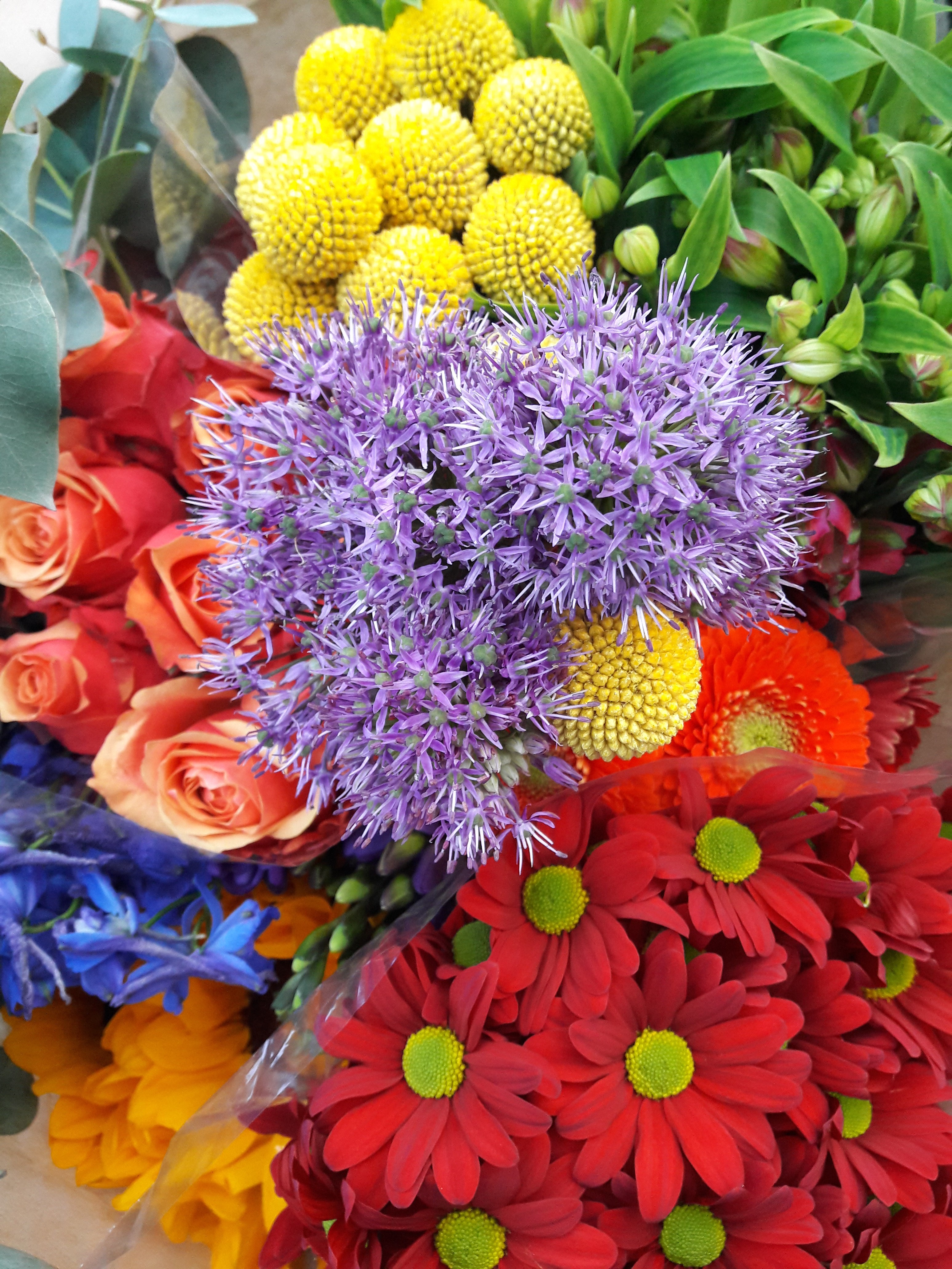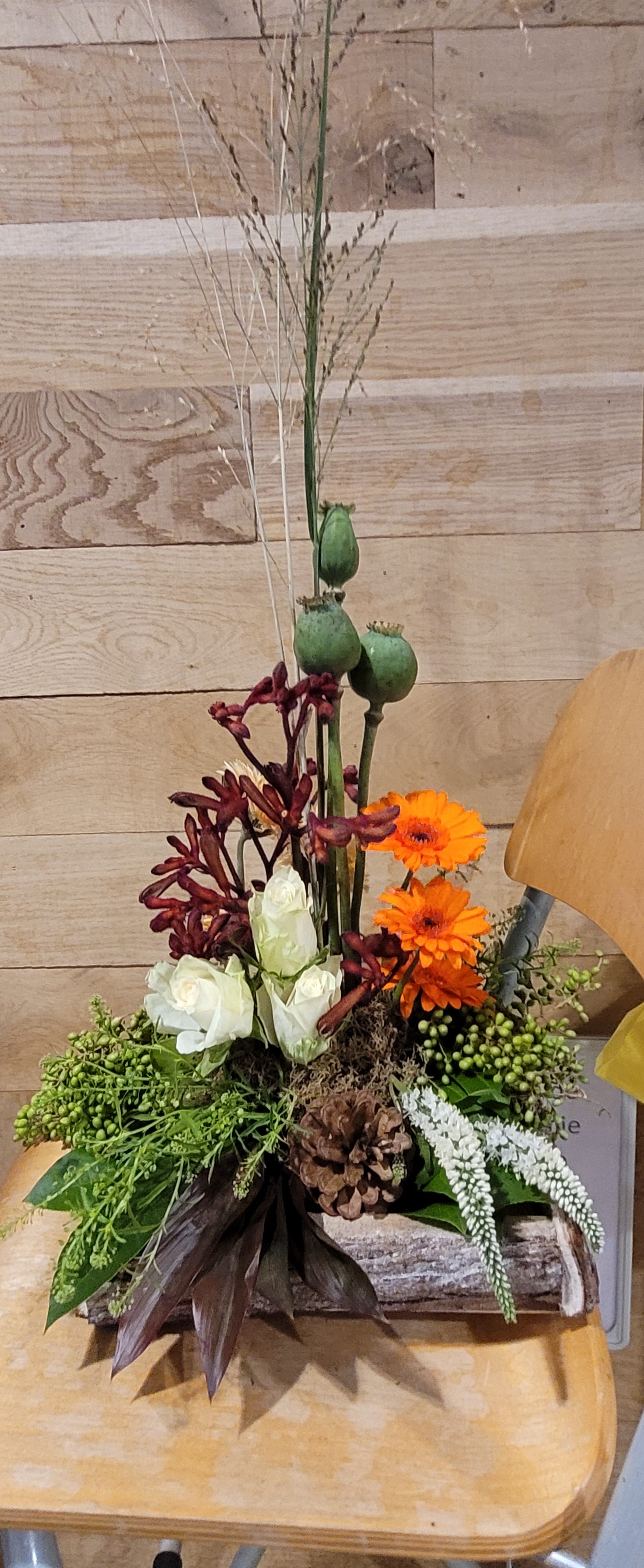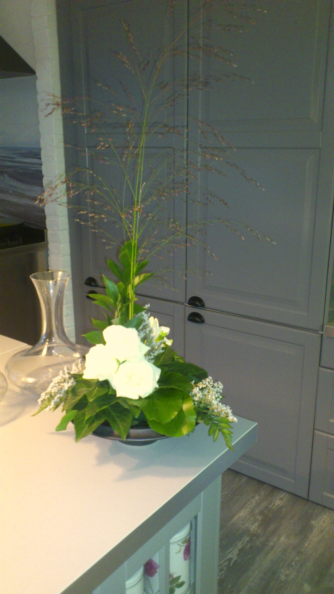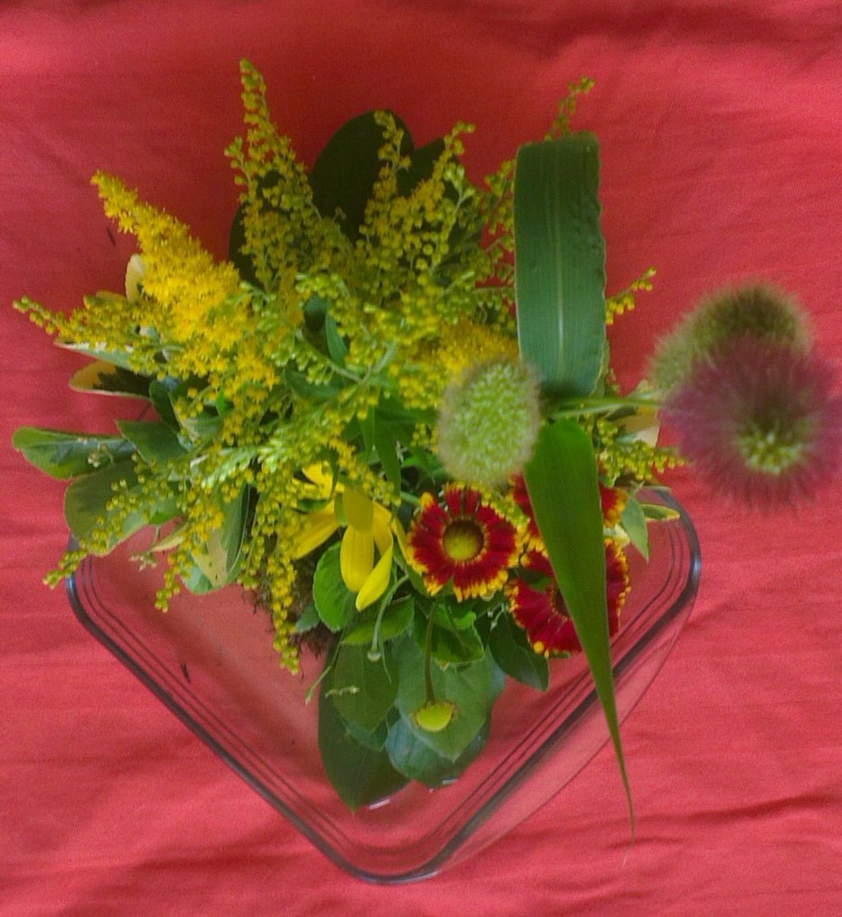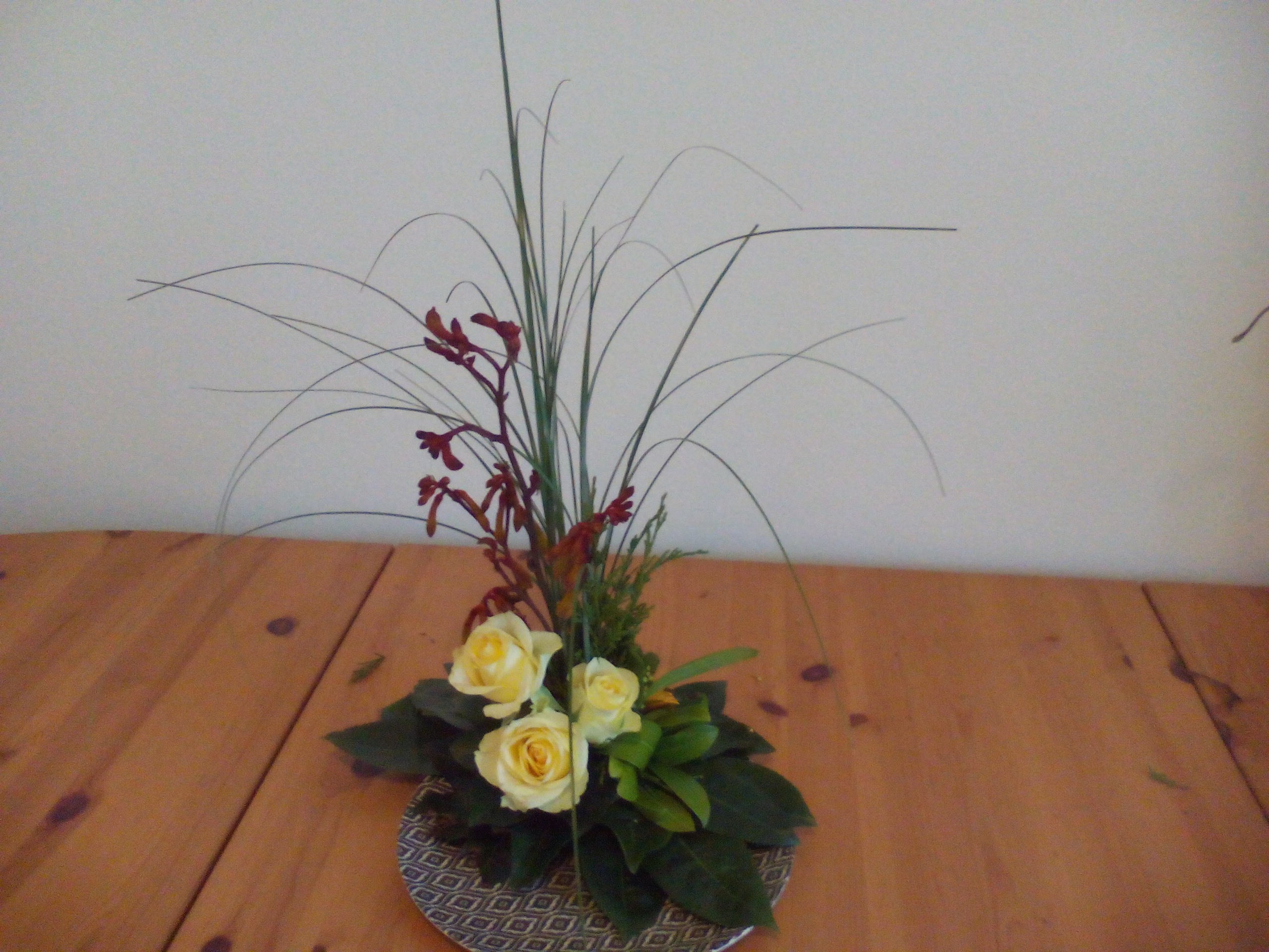 Ook je Anigozonthos had je langste bloemen kunnen zijn. Of als tweede hoogte, dan had je wat meer kleur in de hoogte gehad. Had je hem eerst als handgebonden boeket vast gehouden? Dan kan je makkelijk schuiven. Zoals hij nu is ...is hij ook prima, maar ik denk dat ik de grassen als hoogste had gepakt ernaast de Anigozanthos dan aan de andere kant de rozen en nog korter schuin aan de achterkant de Papaver en de Gerbera's in het hart. Kan je het een beetje voor je zien? :-) Dan zou je meer kleur bovenin krijgen, maar hoef je ook je duren bloemen niet zo kort af te snijden.