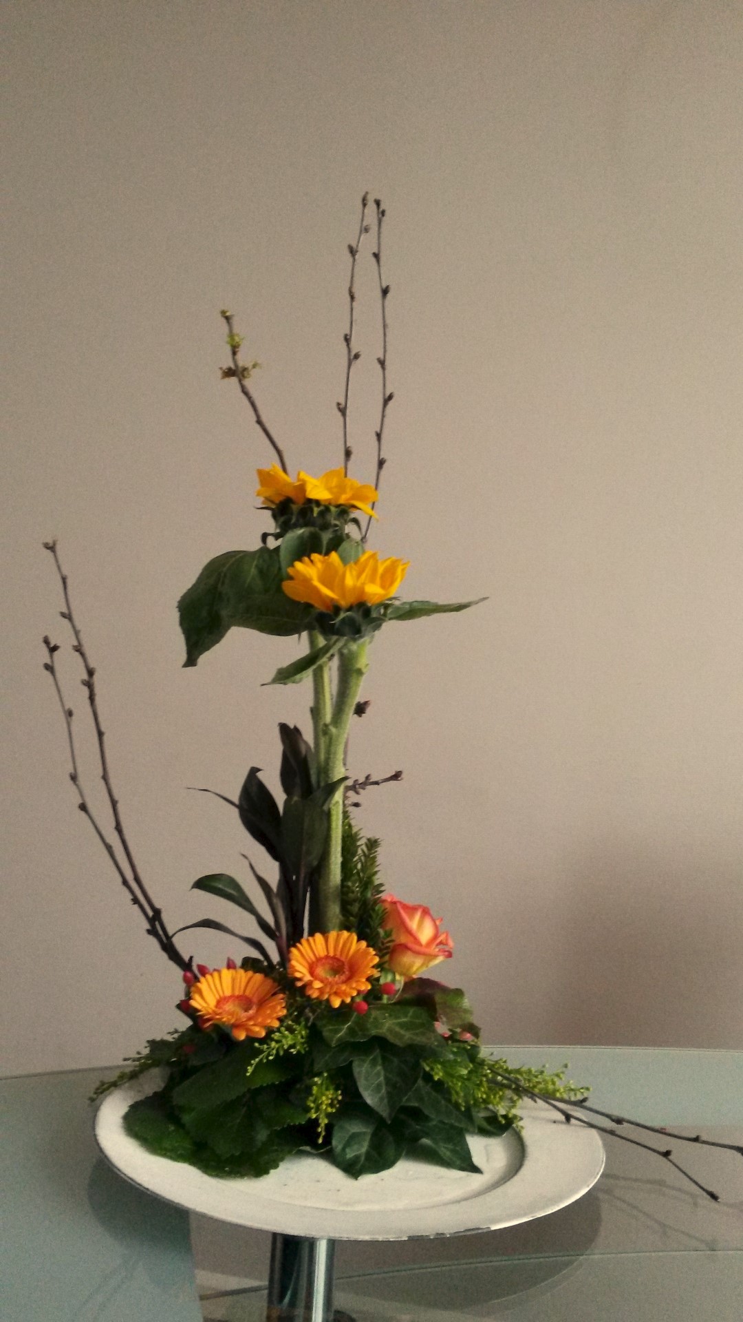 Hoi Angelien, Mooie rustige schaal is het geworden. De lijnen en verhoudingen zijn prima. Met de Hellianthus (zonnebloemen) in de hoogte heb ik een beetje moeite. Je arrangement wordt er zo topzwaar door. Misschien wel in verhouding als je bv. pompoenen in het hart hebt. Zelf zou ik ze in het hart doen, mooi rustig en weer eens iets anders dan de Gerbera mini. Dan krijg je ook sneller een mooie holle lijn. Ga wel lekker zo door met experimenteren, laat je door mij niet tegen houden. Het is een mooi stuk. Groetjes, Nicolle