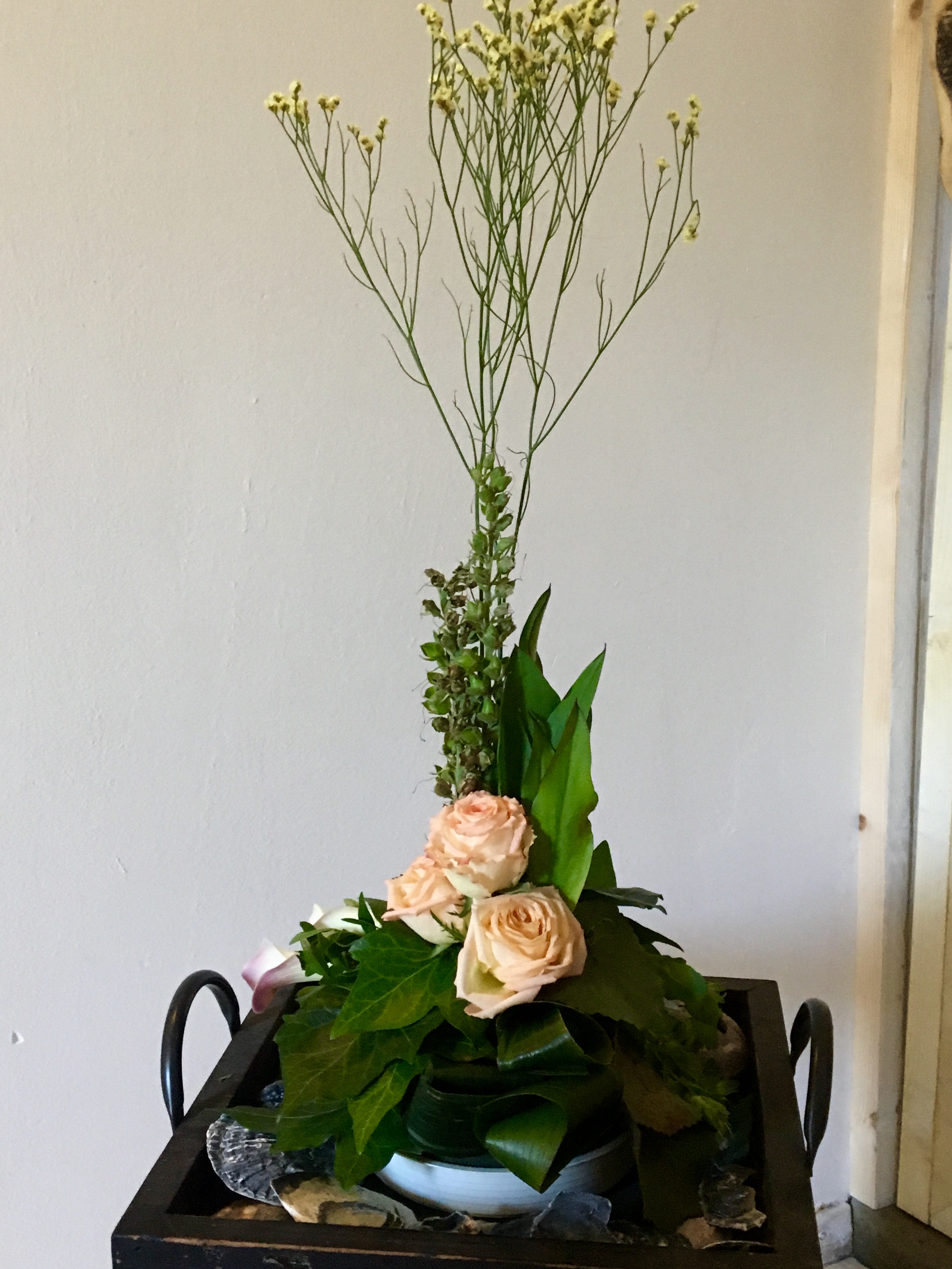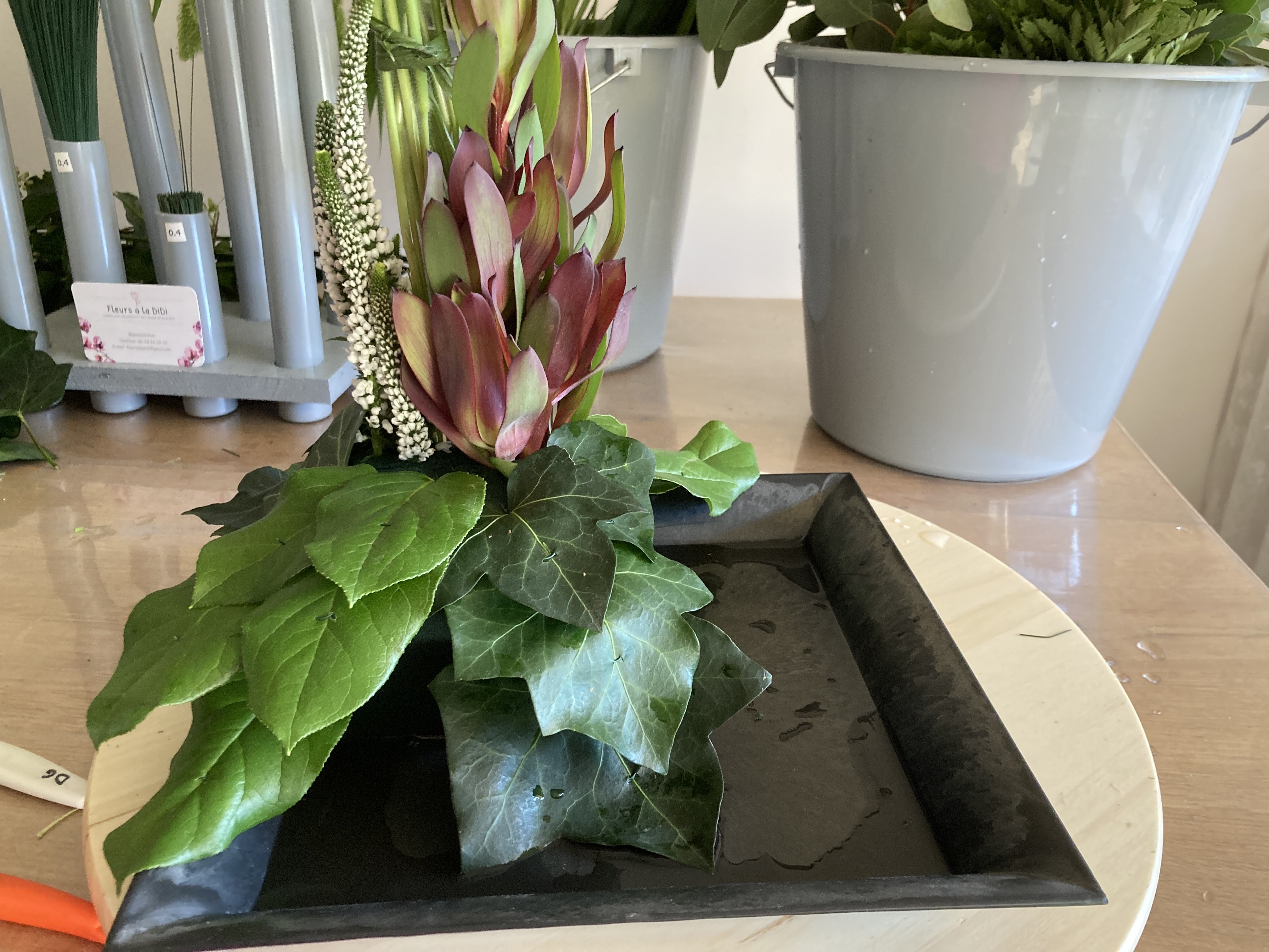 Je 'steen' komt mooi uit met een lineair arrangement. Zantedeschia (je kelkjes) zijn heel erg sterk en staan waarschijnlijk nu nog, maar de stelen zijn lastig om in de oasis te krijgen. Als je voorsteekt, gaat het makkelijker of er een draad omheen draaien en dan vooral om zijn kontje, dan steekt het ook veel makkelijker. Je kan ze ook binnendoor op draad zetten, dan kan je ze meer uitbuigen. Ik raad het aan om dat eerst op een steel te oefenen. Ik hoop dat je iets aan mijn tips hebt. Blijf lekker door gaan en als je vragen hebt, hoor ik ze graag.