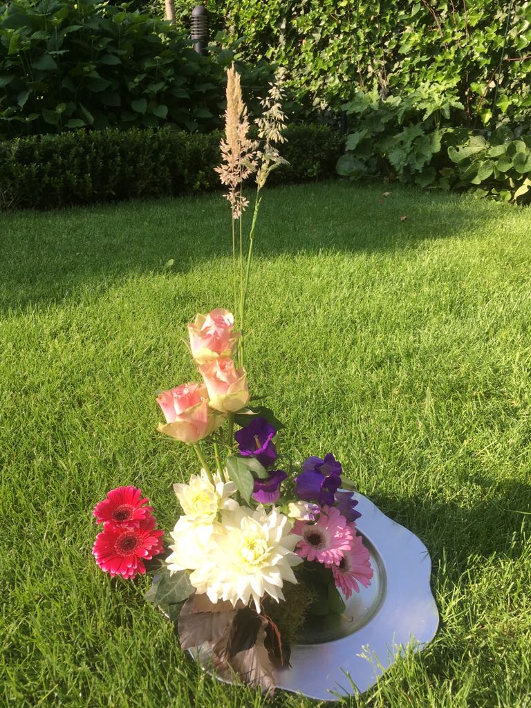 Hoi Laphyta, Je schaal ziet er ook goed uit. Je langste Gerbera had iets langer gemogen, dan was hij nog sierlijker geweest. Probeer ook bij dit arrangement je Iris iets meer tegen het midden aan te gebruiken. Dan blijft je holle lijn er mooier in. Groetjes, Nicolle