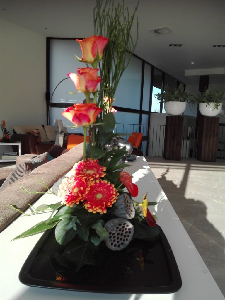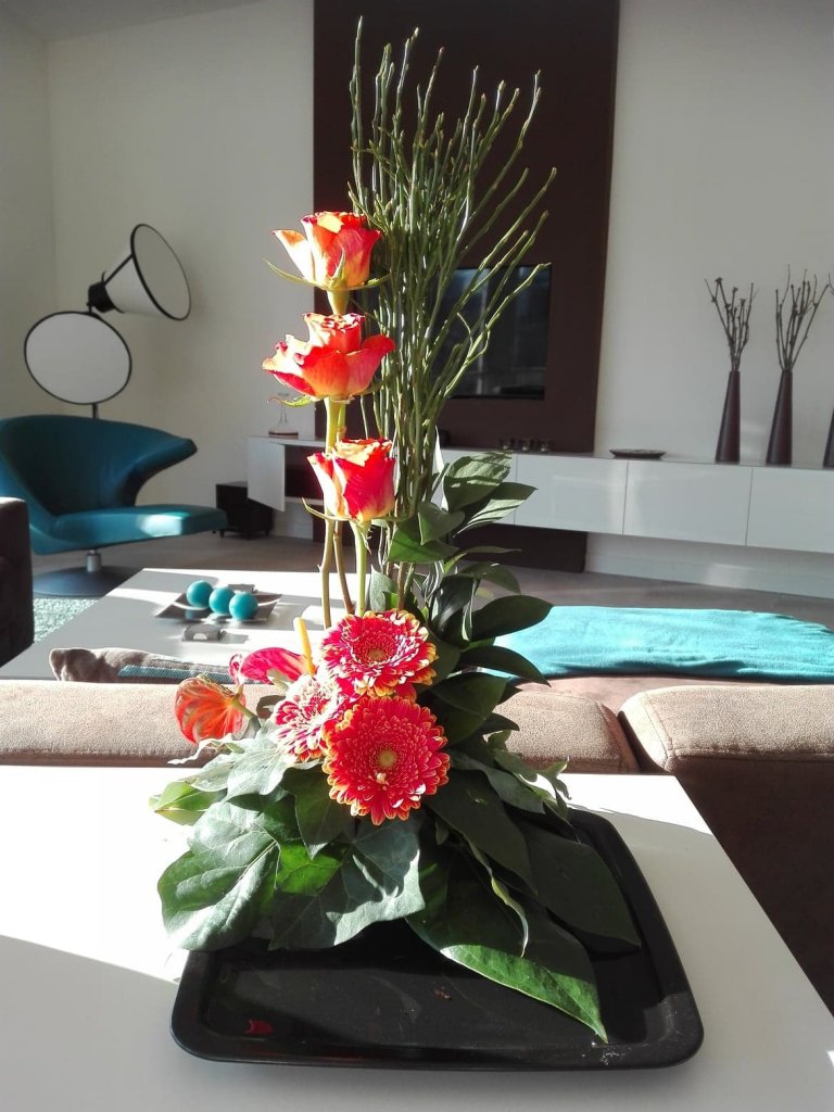 Je hebt zo een mooie aankleding in je huis! Ook je schaal ziet er goed uit. Ook hier de zelfde tip over de Celosia en je Gerbera's mogen iets meer ruimte hebben. Je het ze wel mooi horizontaal gekregen en netjes in een driehoek. Hou goed in de gaten dat je horizontaal maximaal de helft van de hoogte mag...als je slanke materialen hebt.