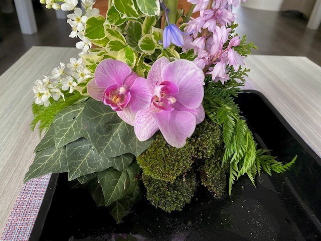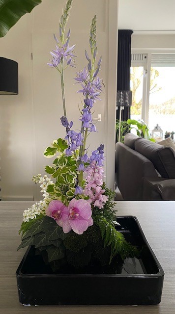 Wat een romantische schaal is het geworden. Ik vind het hele mooie materialen en kleuren bij elkaar. Je verhoudingen en lijnen zijn prima. Je hoogte had iets strakker in het midden gemogen. De Phalaenopsis is prachtig in het hart. Ik hoop dat ze een beetje goed gebleven zijn. Het is ook mogelijk om die op kleine steekbuisje op steel er in te steken, dan kan je ze ook iets verder uit elkaar er in verwerken en staan ze op water. Mooi tussen de Hedera die je er trouwens keurig in hebt gestoken.