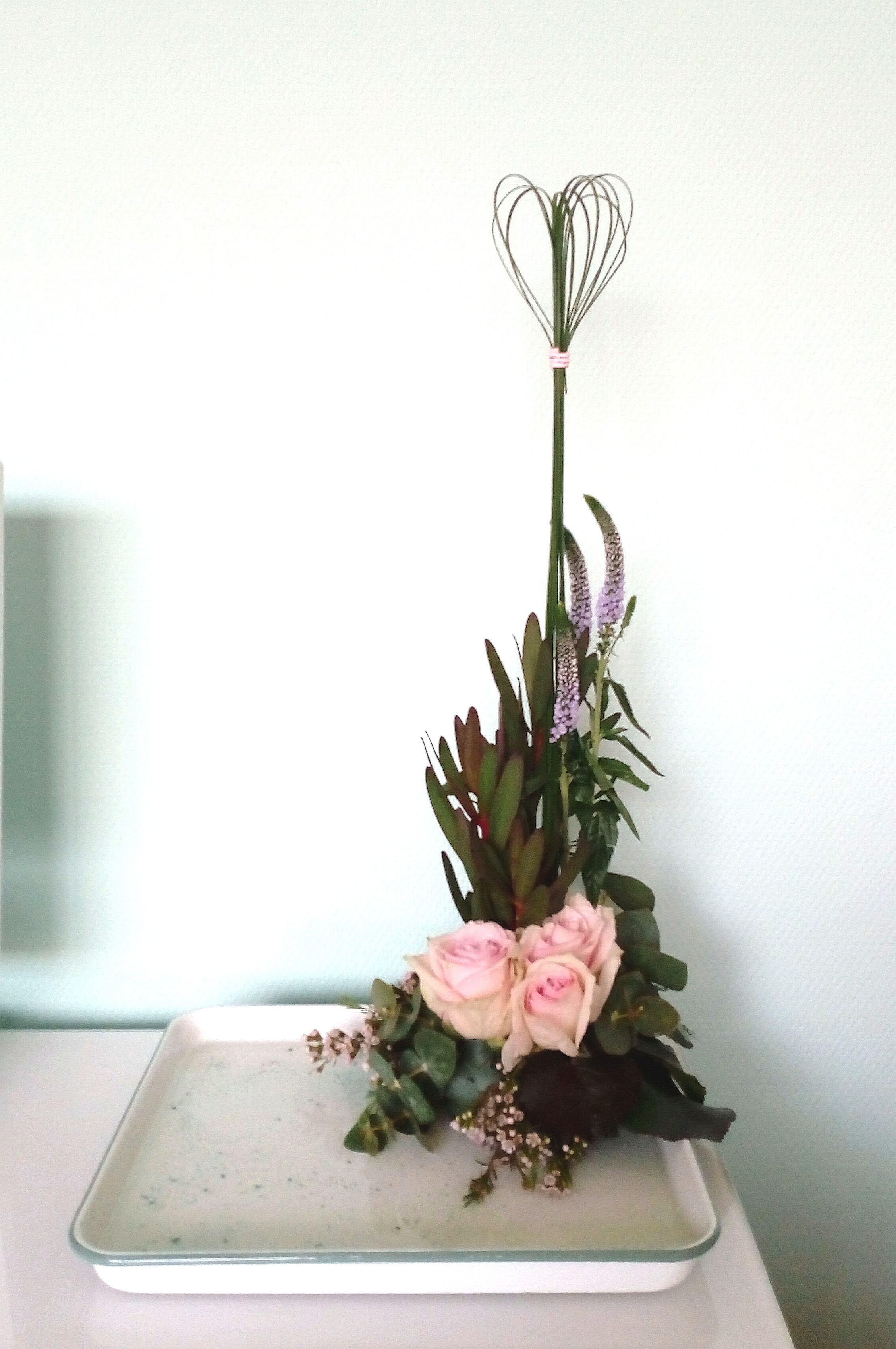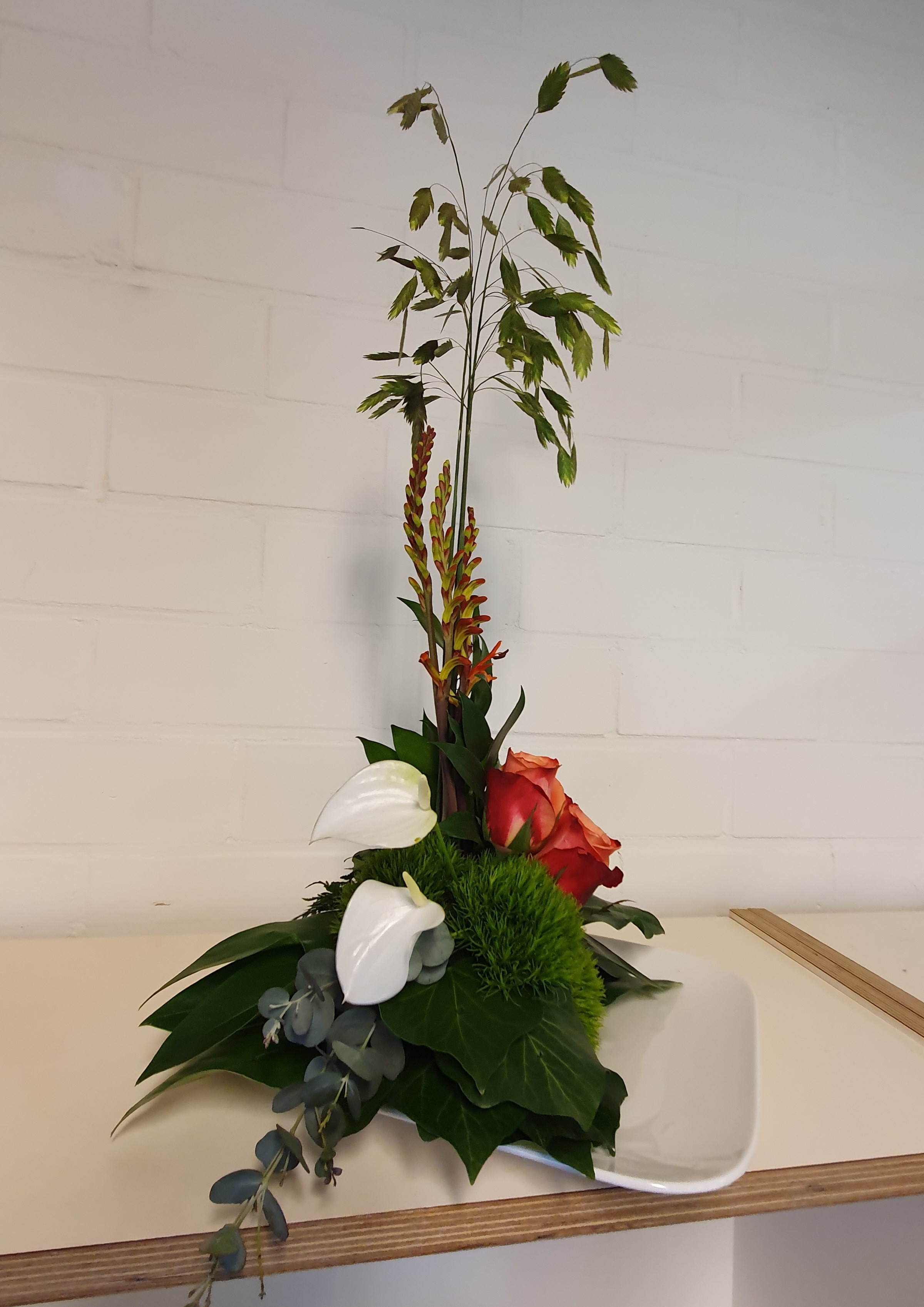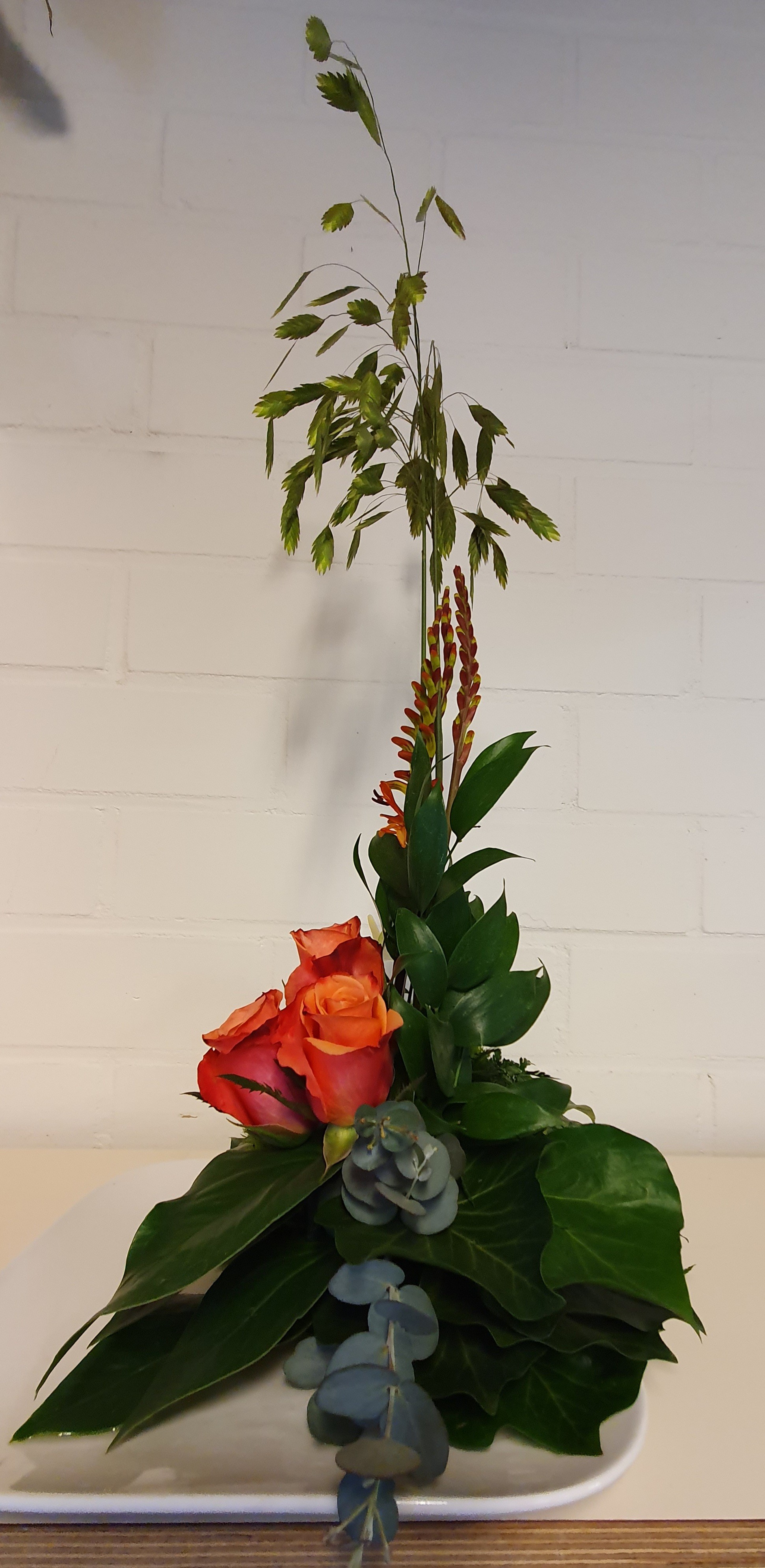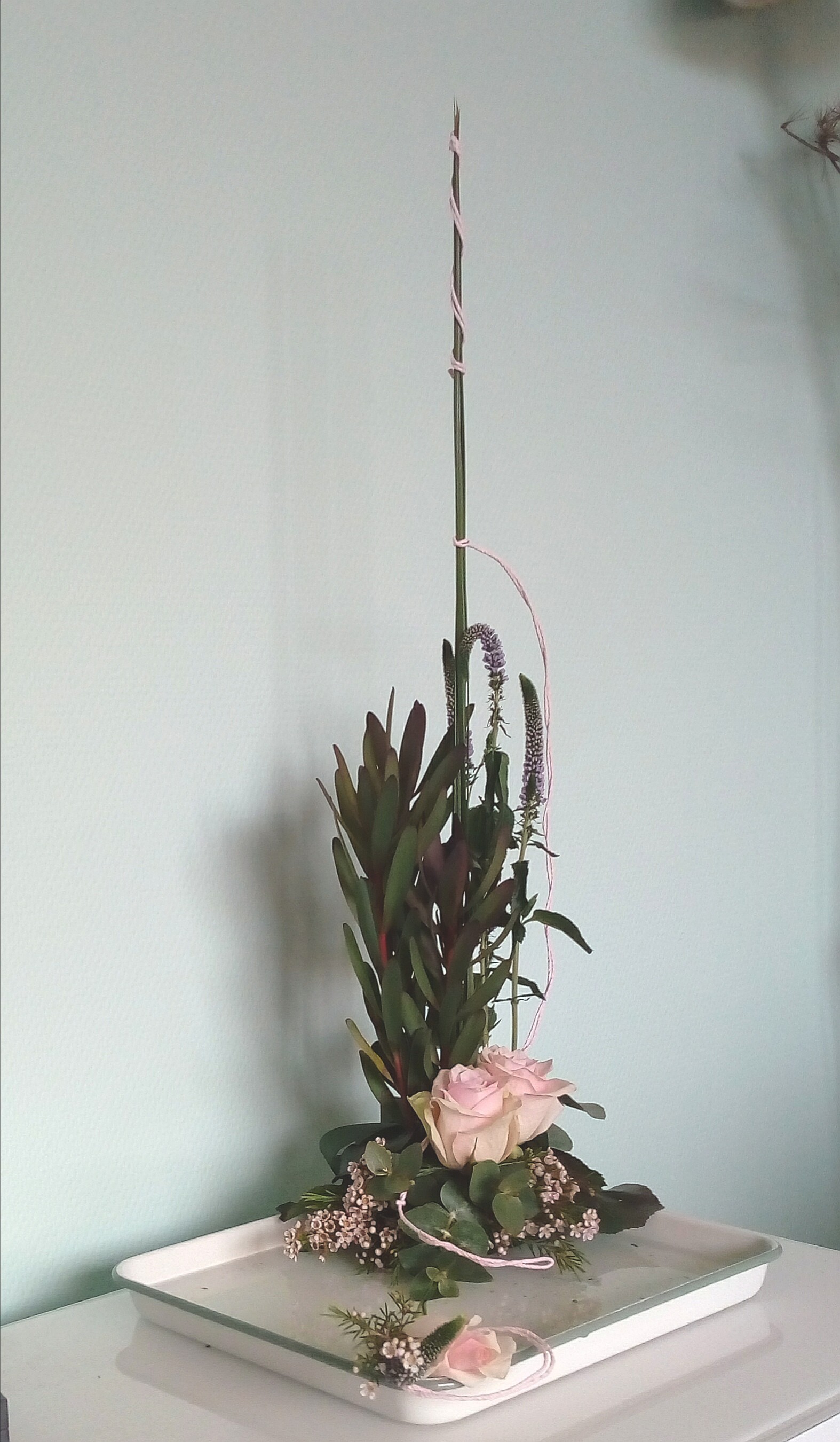 Je schaal ziet er leuk uit. Ik heb nog wel een paar tipjes. Ik mis in de hoogte een beetje de holle lijn. Dat kan je krijgen door je hoogte materialen met iets meer afstand en regelmaat korter te gebruiken. Je laatste Leucadendron komt dan bijna bij je hart. Ik hoop dat je zo begrijpt wat ik bedoel. Misschien kan je het alsnog uitproberen. Het te korte roosje mag er ook nog bij je hart roosjes bij hoor. Een hart kan ook uit drie roosjes bestaan.