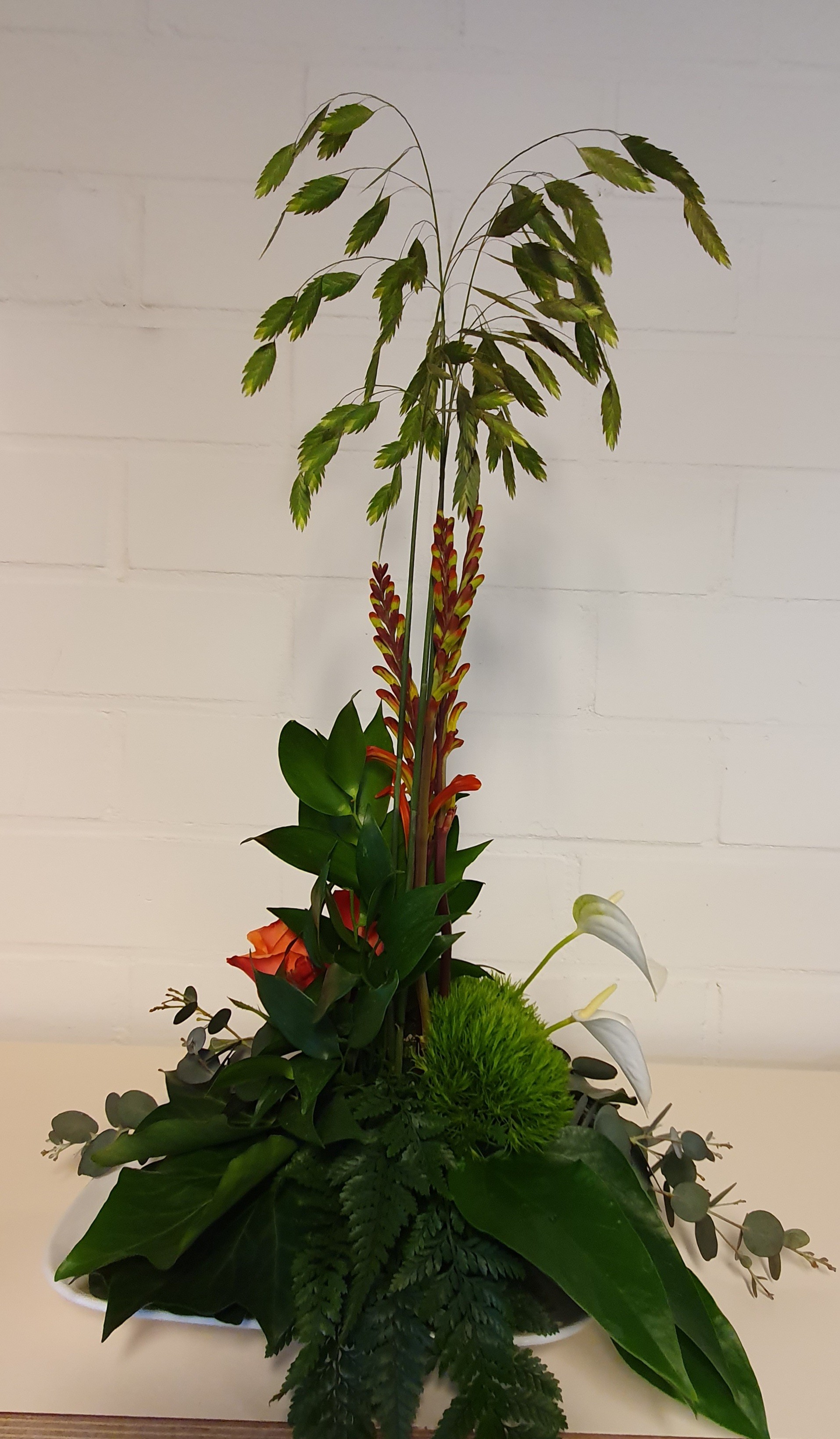 Hoi Ans, Mooie holle lijn! Fijn om in dit arrangement te zien dat je een bladrozet hebt gemaakt. De Ruscus mag eventueel nog wat langer, zodat de stappen 1-2-3 gelijkmatig naar het hart van het arrangement zijn. Dan komt er wat afstand tussen de Ruscus en de Leucodendron. Je hebt aan de zijkant wat mos gebruikt. Zoals je waarschijnlijk zelf ook hebt gezien (je ziet het altijd direct als je een foto hebt gemaakt), zie je aan de voorkant nog wat steekschuim. Je kunt wat mos verplaatsen naar de voorkant, waardoor ook direct de Hedera en de Galaxy beter worden gescheiden. Dit zijn nl. twee ronde bladschijven. Je hebt de roosjes in het hart gebruikt: prima! Volgende keer kun je proberen om de Anthuriums als hart te gebruiken en je roosjes als extra hoogte-lijn. Ga zo door! groetjes, Nicolle
