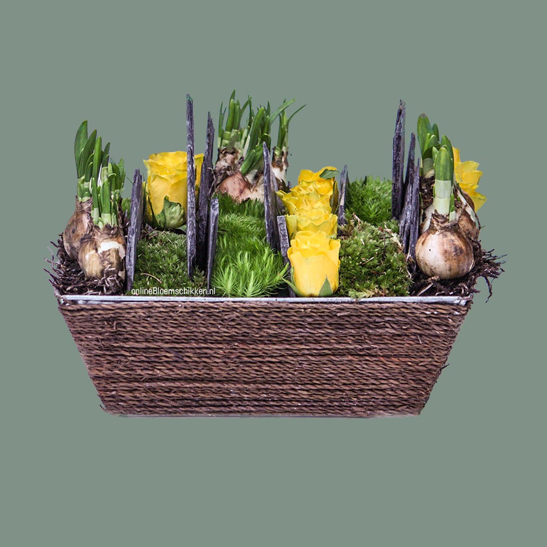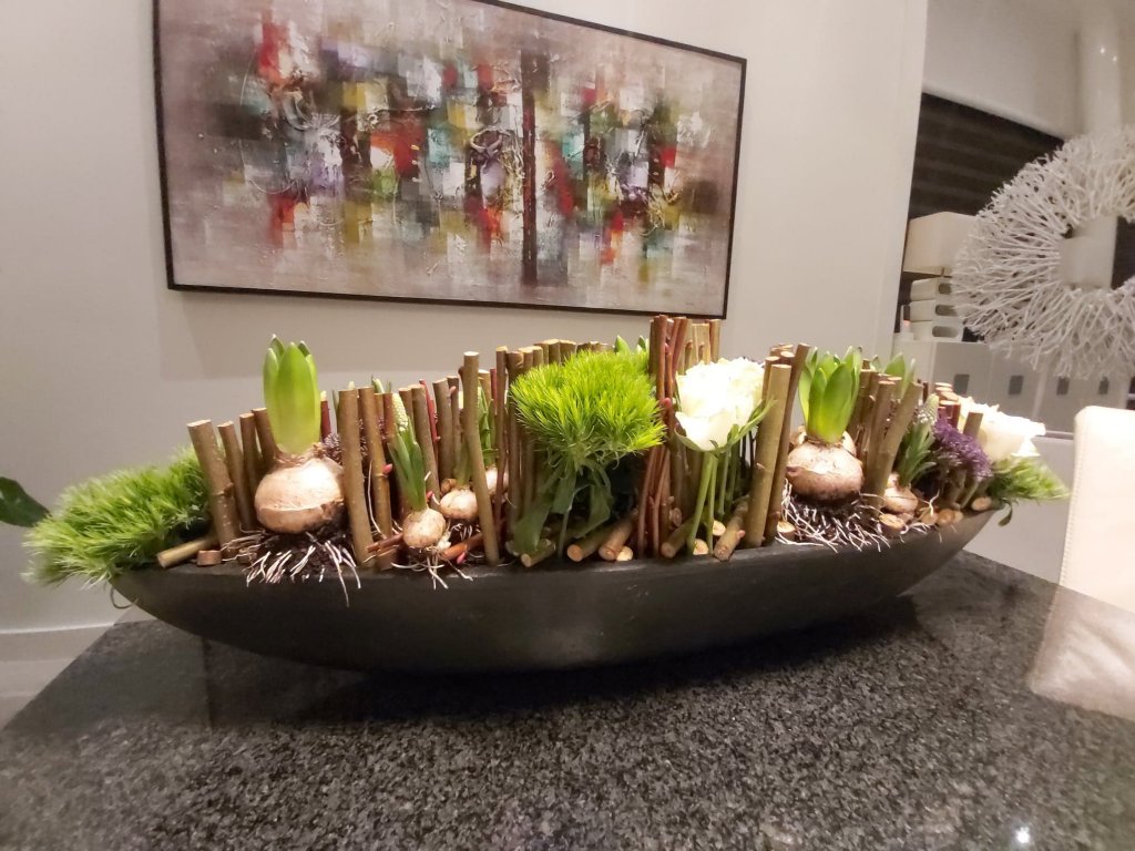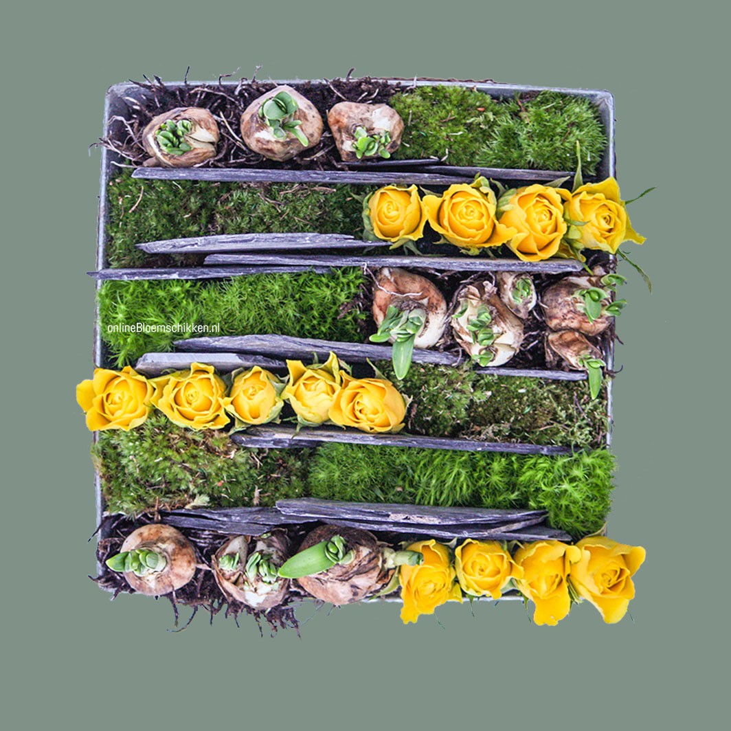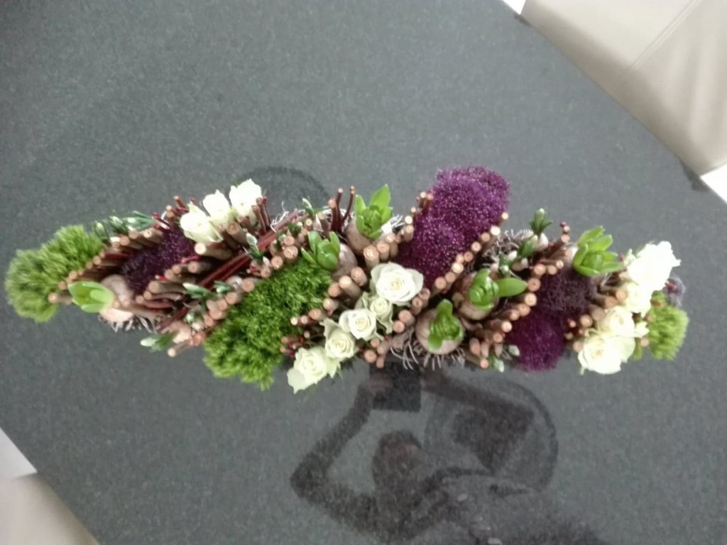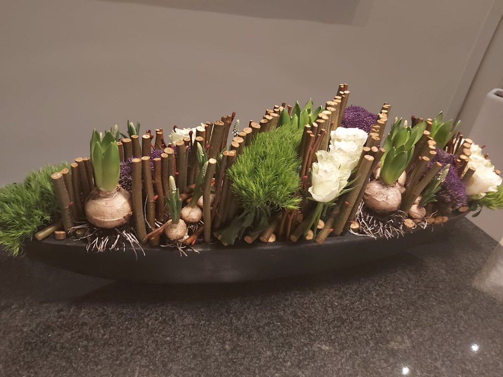 Werken met natuurlijke materialen zoals leisteen is altijd een goed begin. Het werkt ook nog eens snel, omdat je niet veel Oasis hoeft weg te werken. Door een strakkere schaal en met andere kleuren te werken kan dit ook een heel modern stuk zijn voor in een moderne interieur.