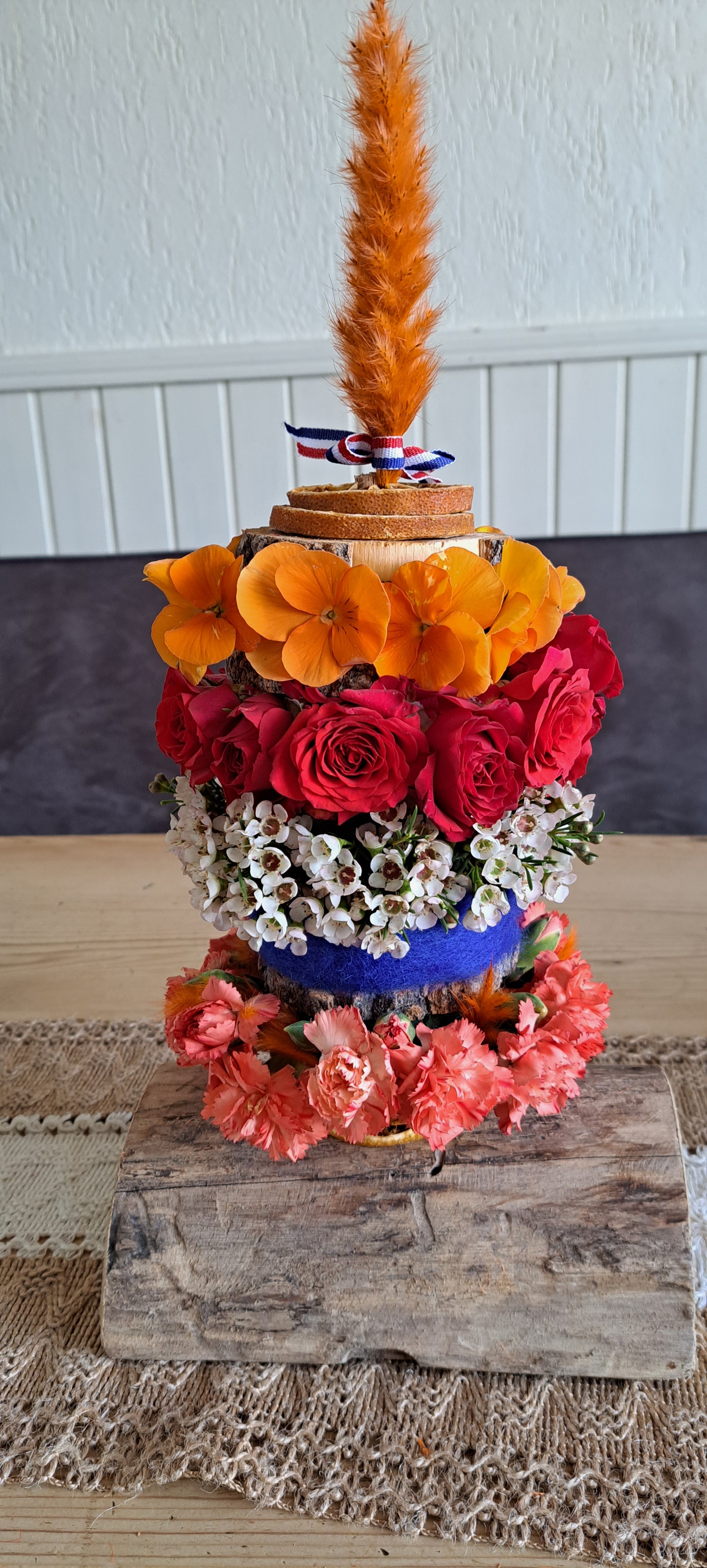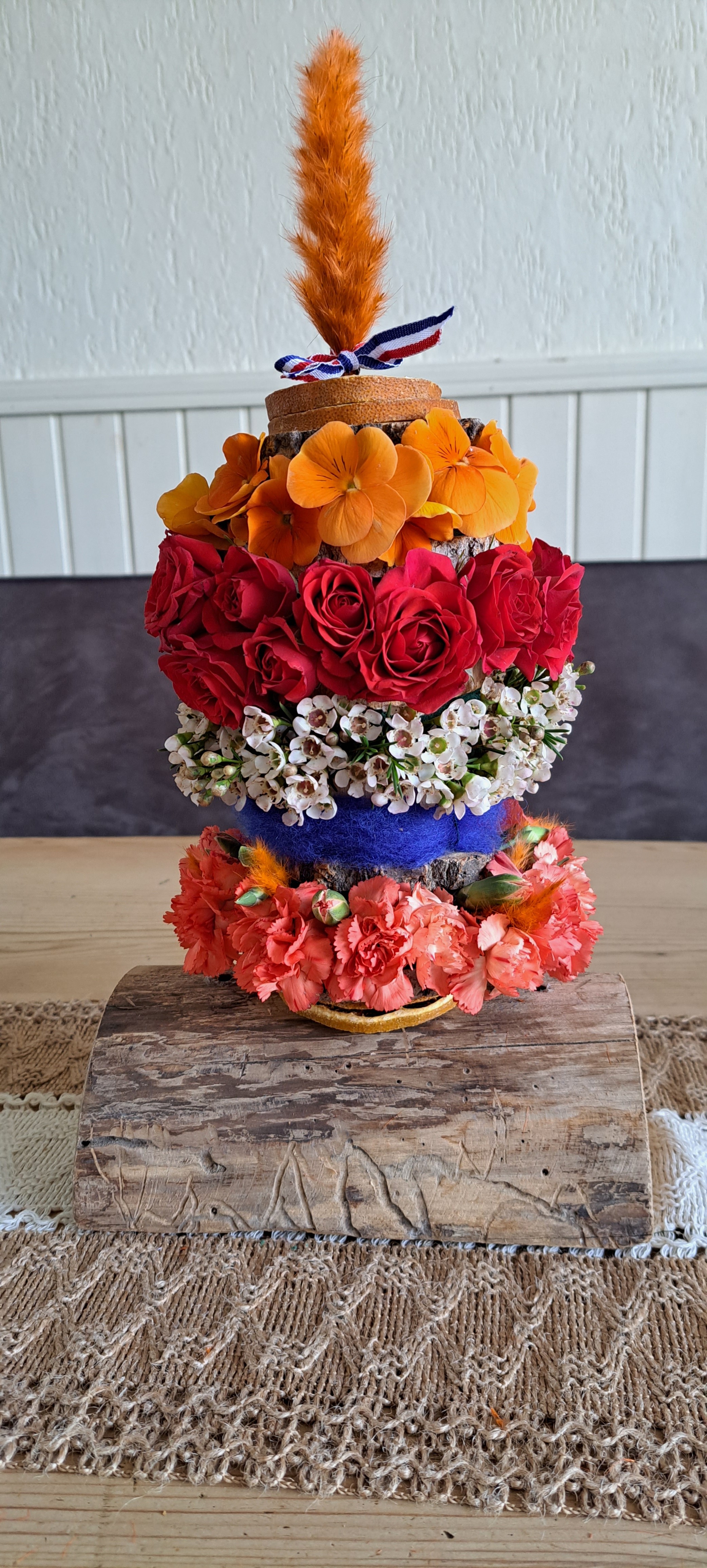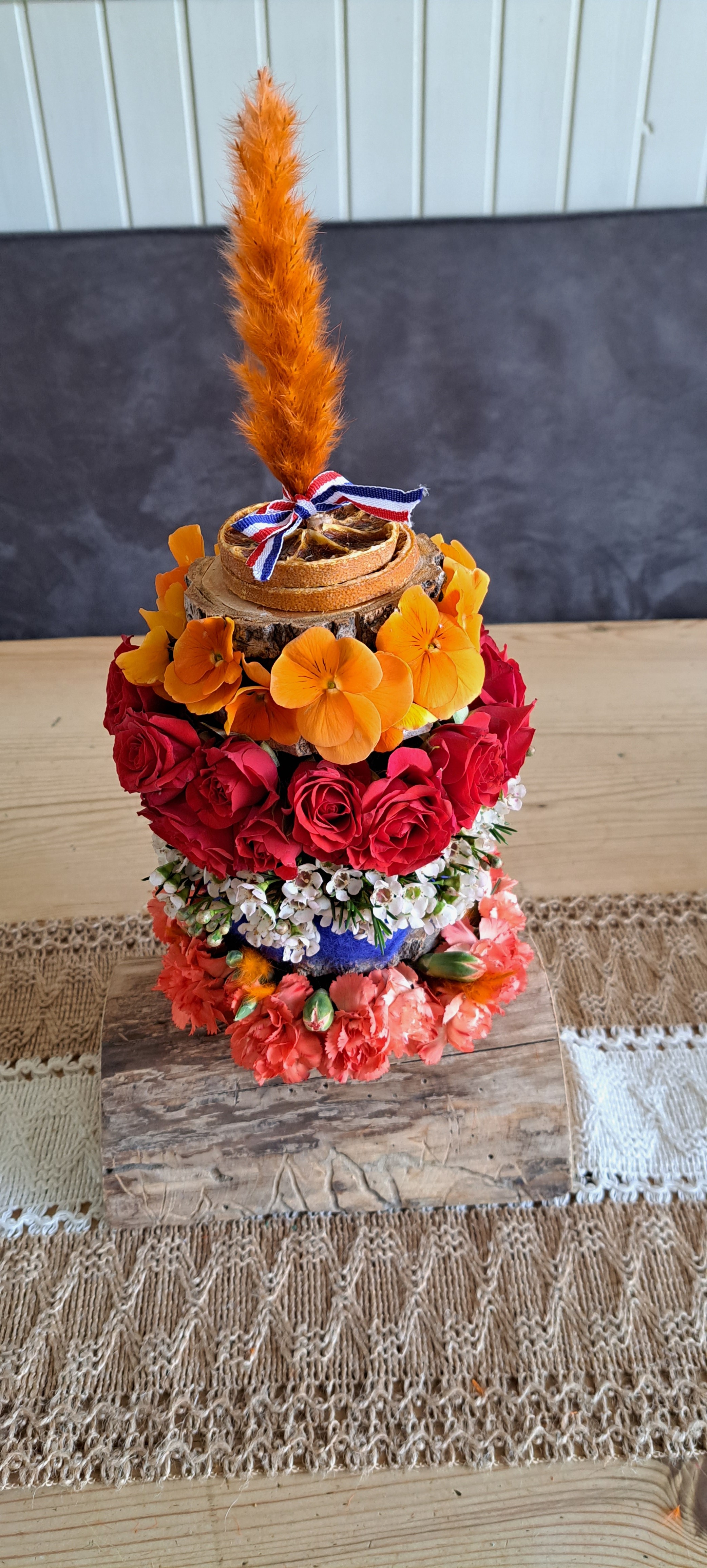 Wat leuk dat je deze voor Koningsdag hebt gemaakt. Het is je heel goed gelukt met deze materialen en kleuren. Het is al een feestje op zich. Je houtschijven hadden wat groter gemogen. Nu vallen ze bijna helemaal weg, maar hij wordt er niet minder vrolijk van. Je kan hem misschien nog een keer maken en dan je oasis nog kleiner maken en nog kleinere bloemen gebruiken. Hij blijft leuk om te maken.