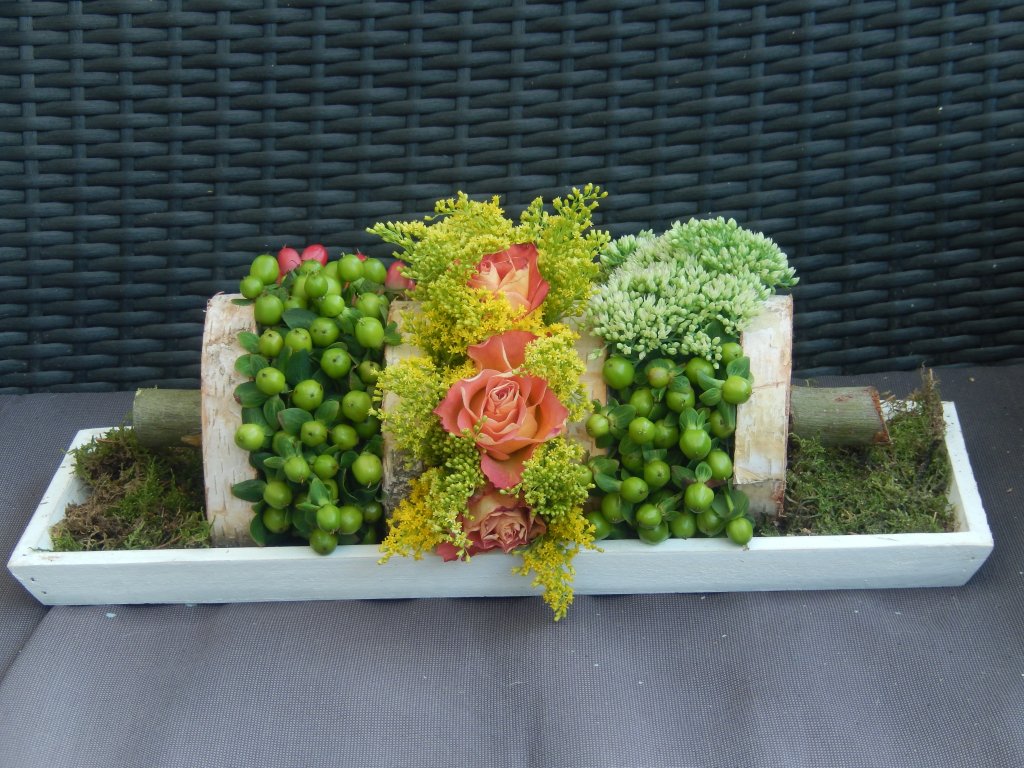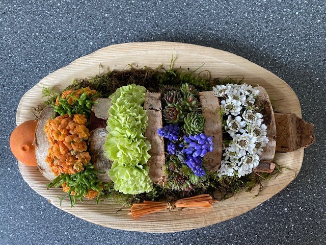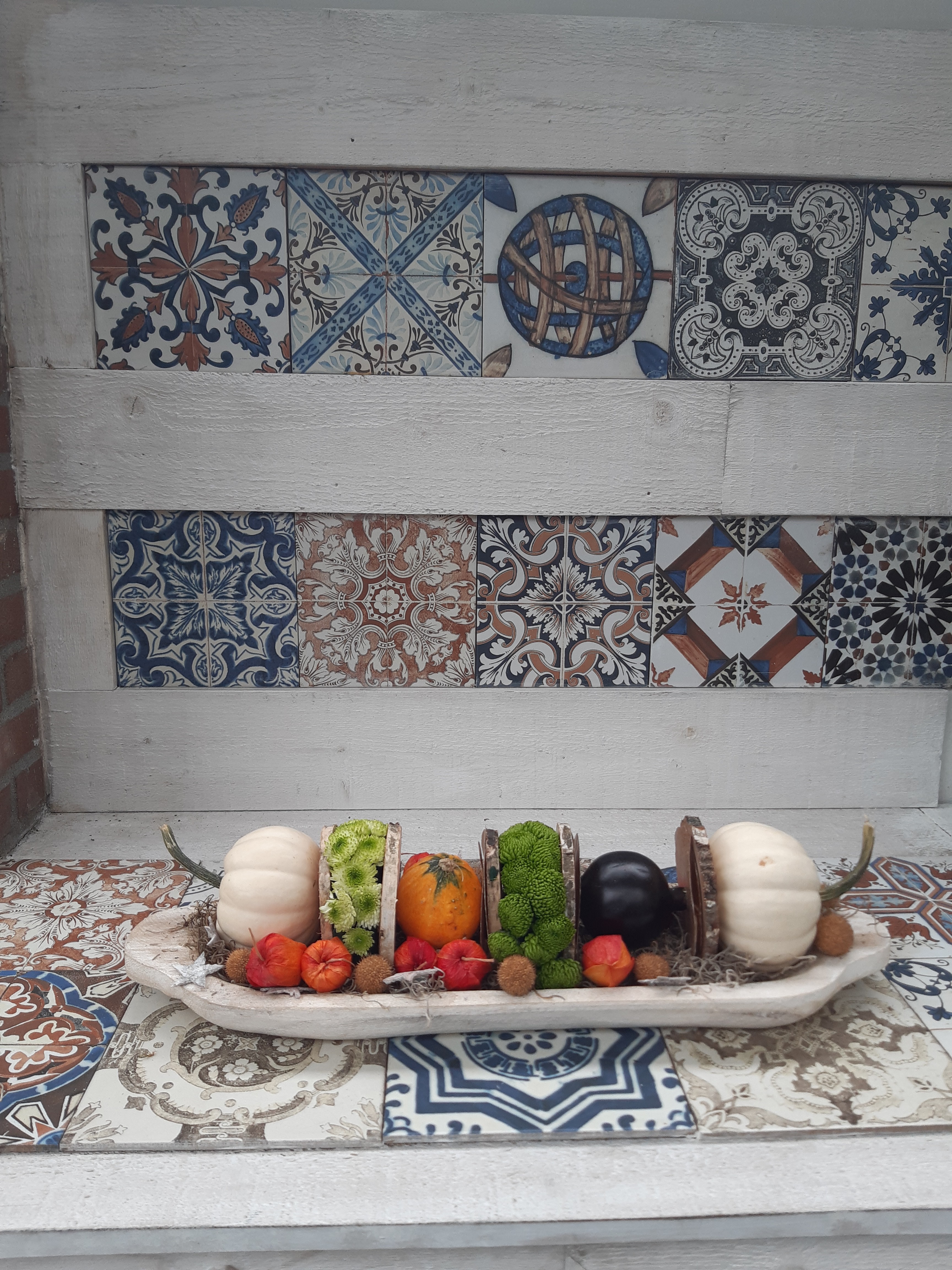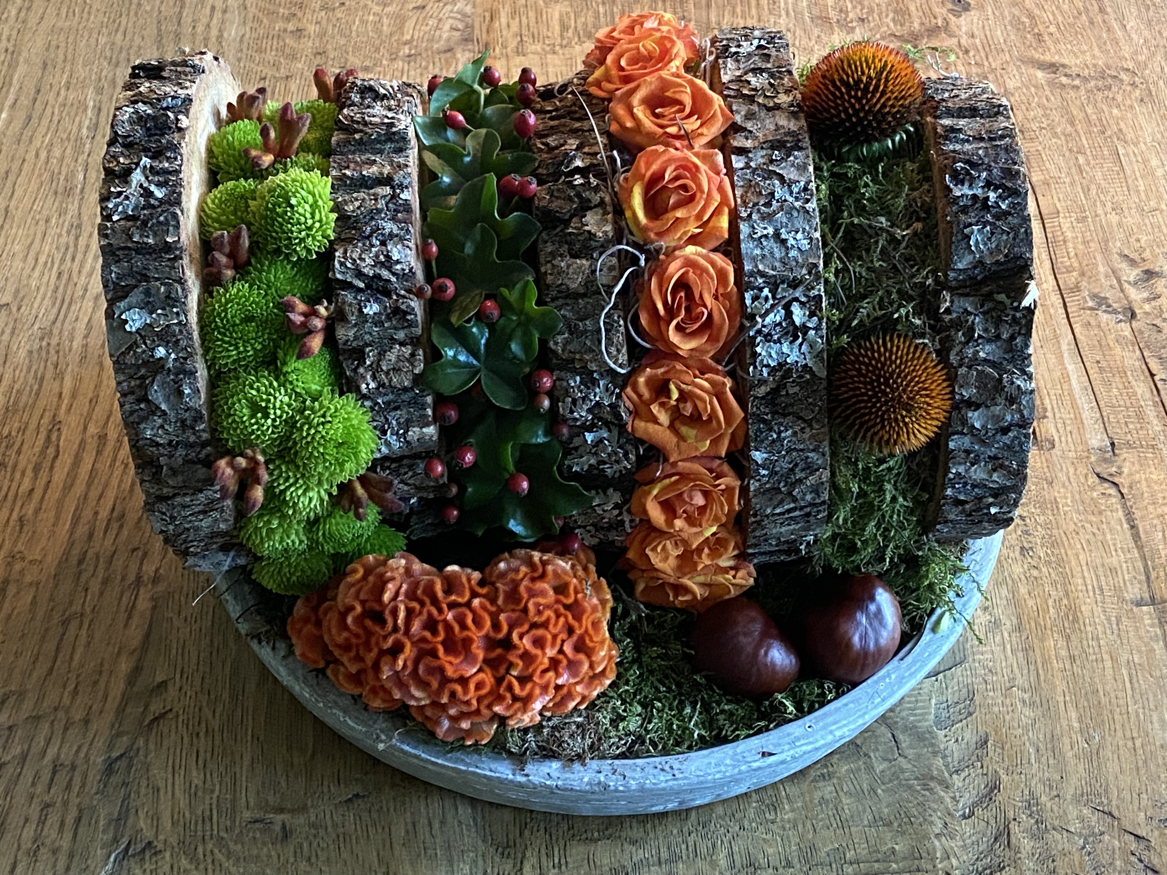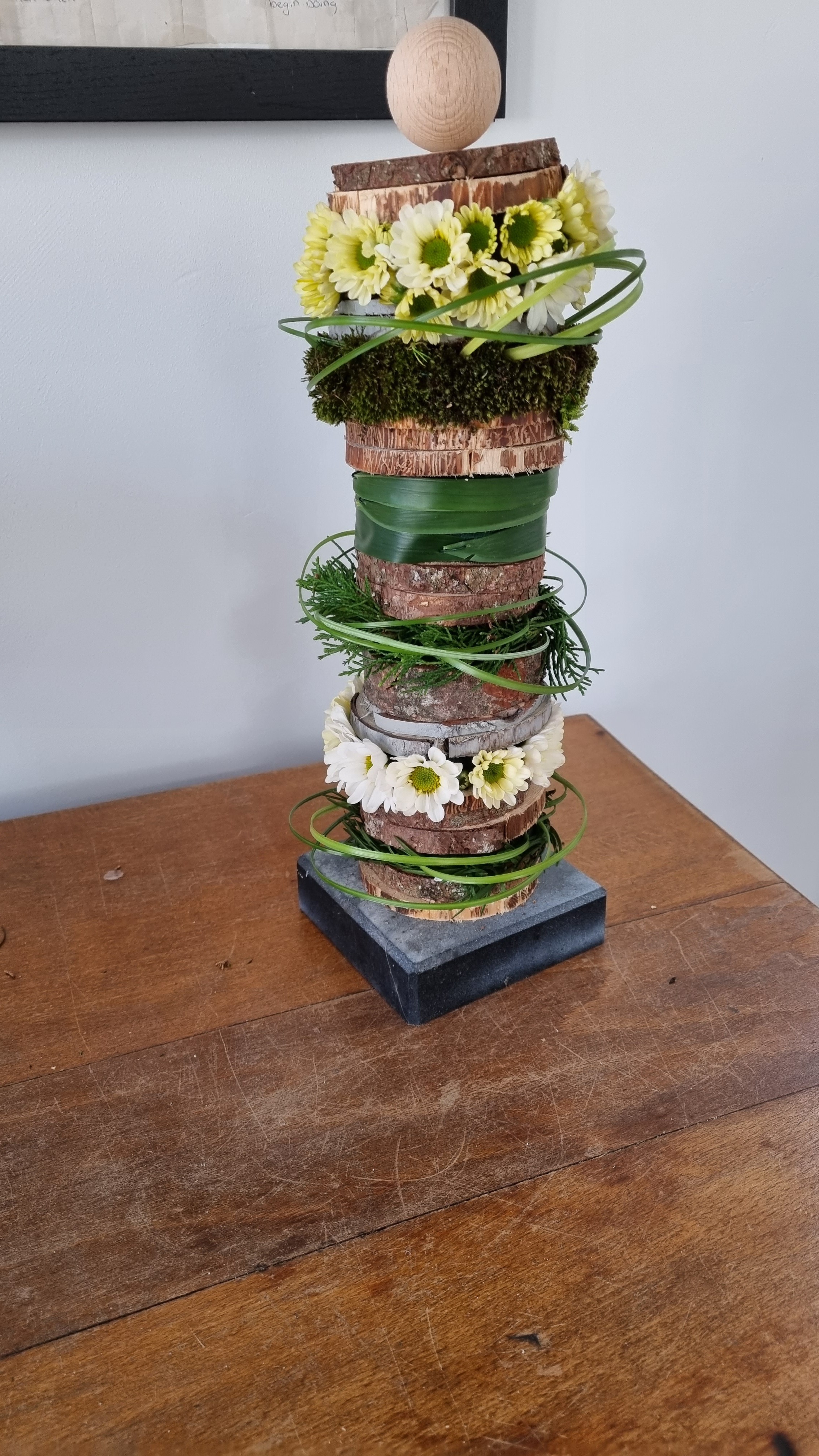 Wat leuk dat je deze voor Koningsdag hebt gemaakt. Het is je heel goed gelukt met deze materialen en kleuren. Het is al een feestje op zich. Je houtschijven hadden wat groter gemogen. Nu vallen ze bijna helemaal weg, maar hij wordt er niet minder vrolijk van. Je kan hem misschien nog een keer maken en dan je oasis nog kleiner maken en nog kleinere bloemen gebruiken. Hij blijft leuk om te maken.