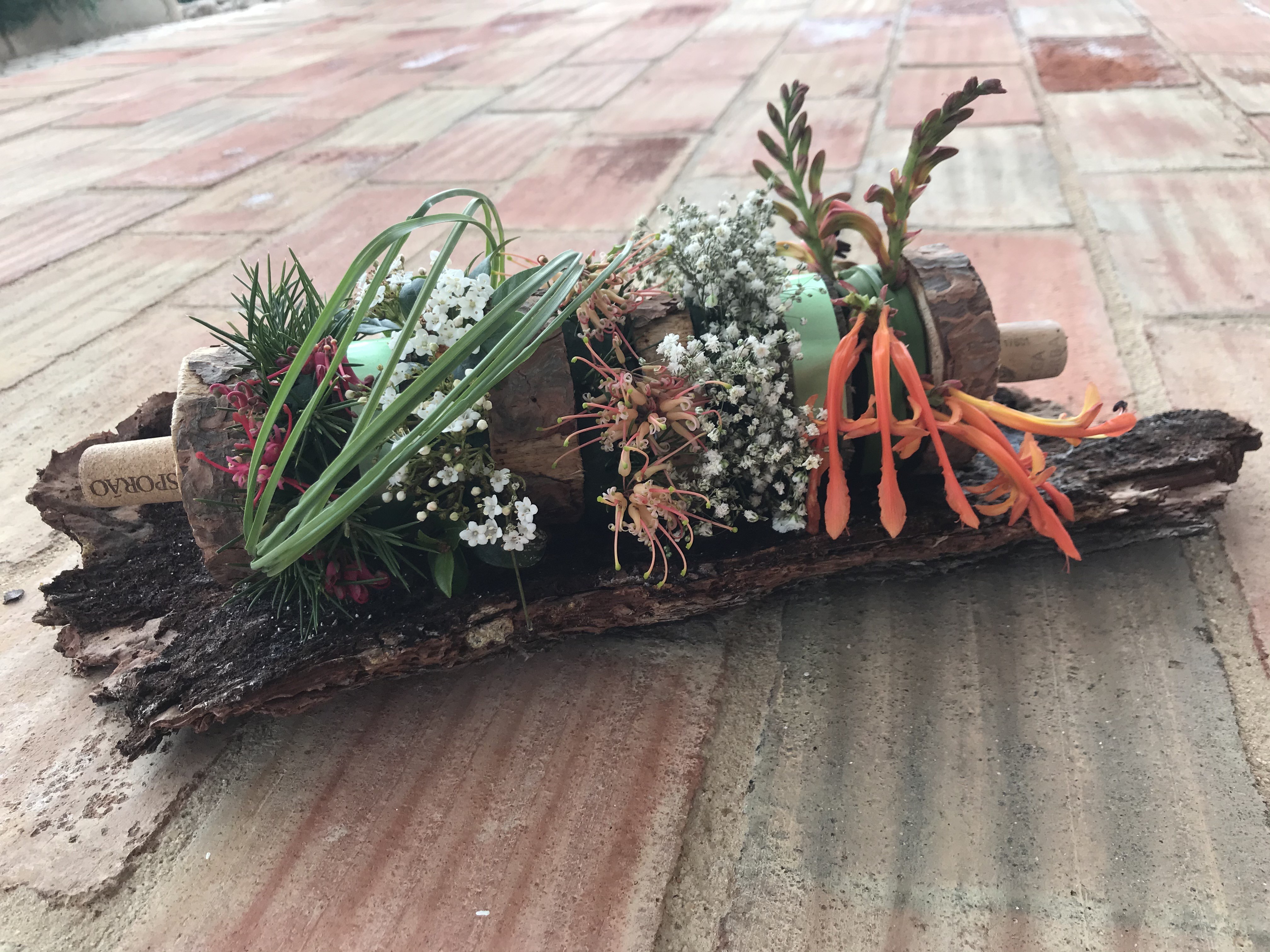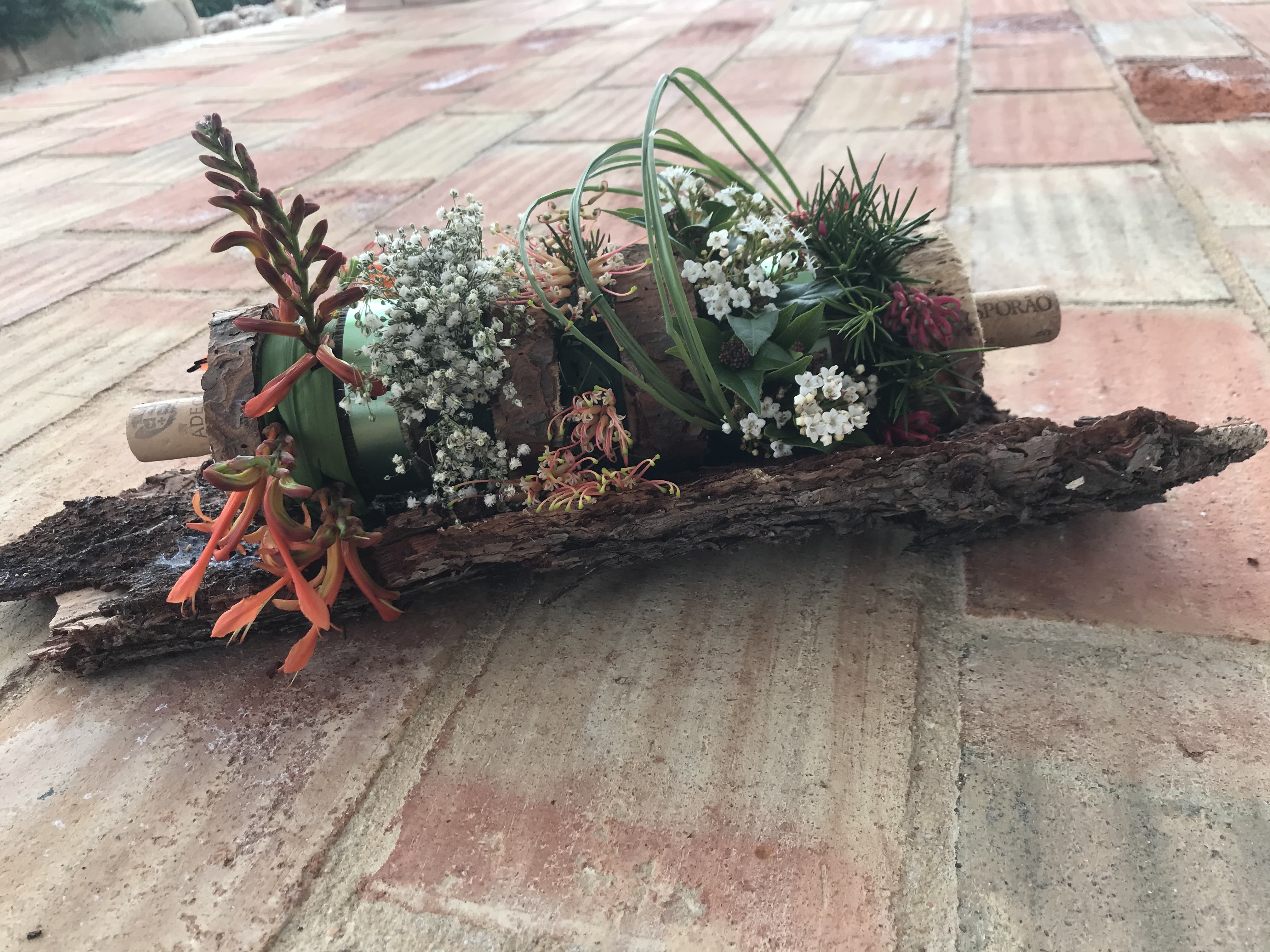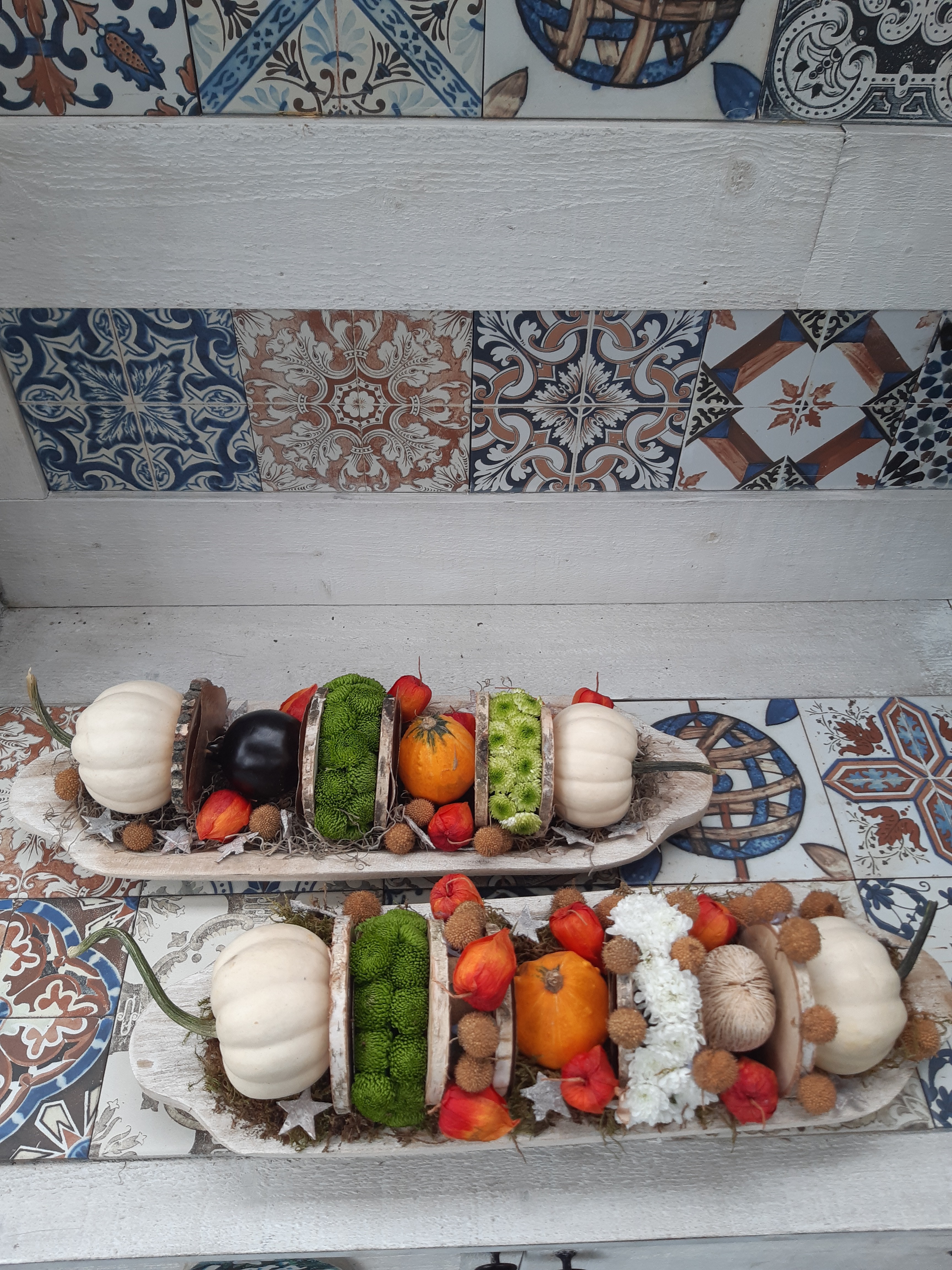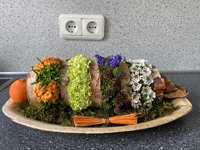 ik had moeite om een tonkinstok te kopen en heb toen maar een alternatief bedacht om de boomschijven aan elkaar te verbinden. Ik heb hiervoor de groene prikkers gebruikt. Doordat mijn materialen wat grover zijn vond ik het niet storend dat het er af en toe wat minder verfijnd uit ziet. Ik vind het een fijn herfststuk geworden. Maar uiteindelijk lijkt het meer op een rollade dan een shashlick denk ik.