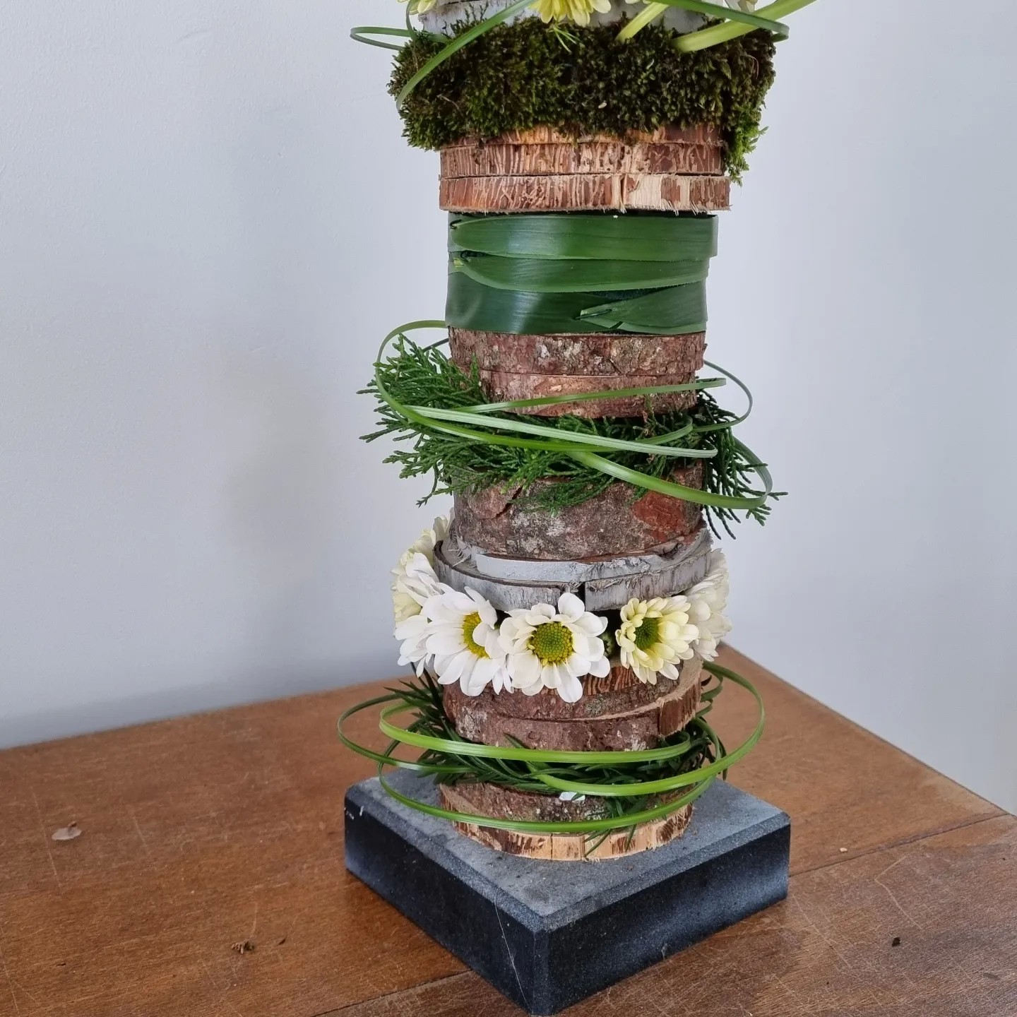 Je kan dit arrangement dus ook rechtop maken op bijvoorbeeld een ijzeren voet met pin. Je vervangt dan de tonking stok door een ijzeren buisje.