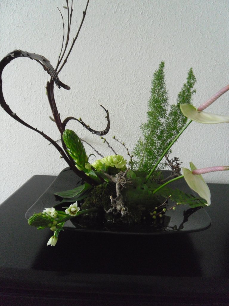 Heel leuk dat je deze stijl hebt vast gepakt. Je schaal ziet er mooi uit. Twee kleine tipje...Als iets gebogen (krom)is probeer het dan naar binnen te gebruiken. Je zou dus die ene Asparagus kunnen omdraaien dan wordt hij eleganter. Probeer ook zoveel mogenlijk natuurlijke krommen bloemen te gebruiken of bloemen die doordat ze omhoog groeien krom worden, zoals Gerbera's, Anemonen, Ranonkels. De Eustama's zijn een beetje te recht en stijf. Voor de kleur verdeling doen ze het wel leuk.