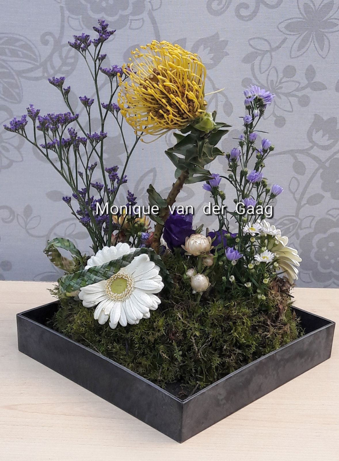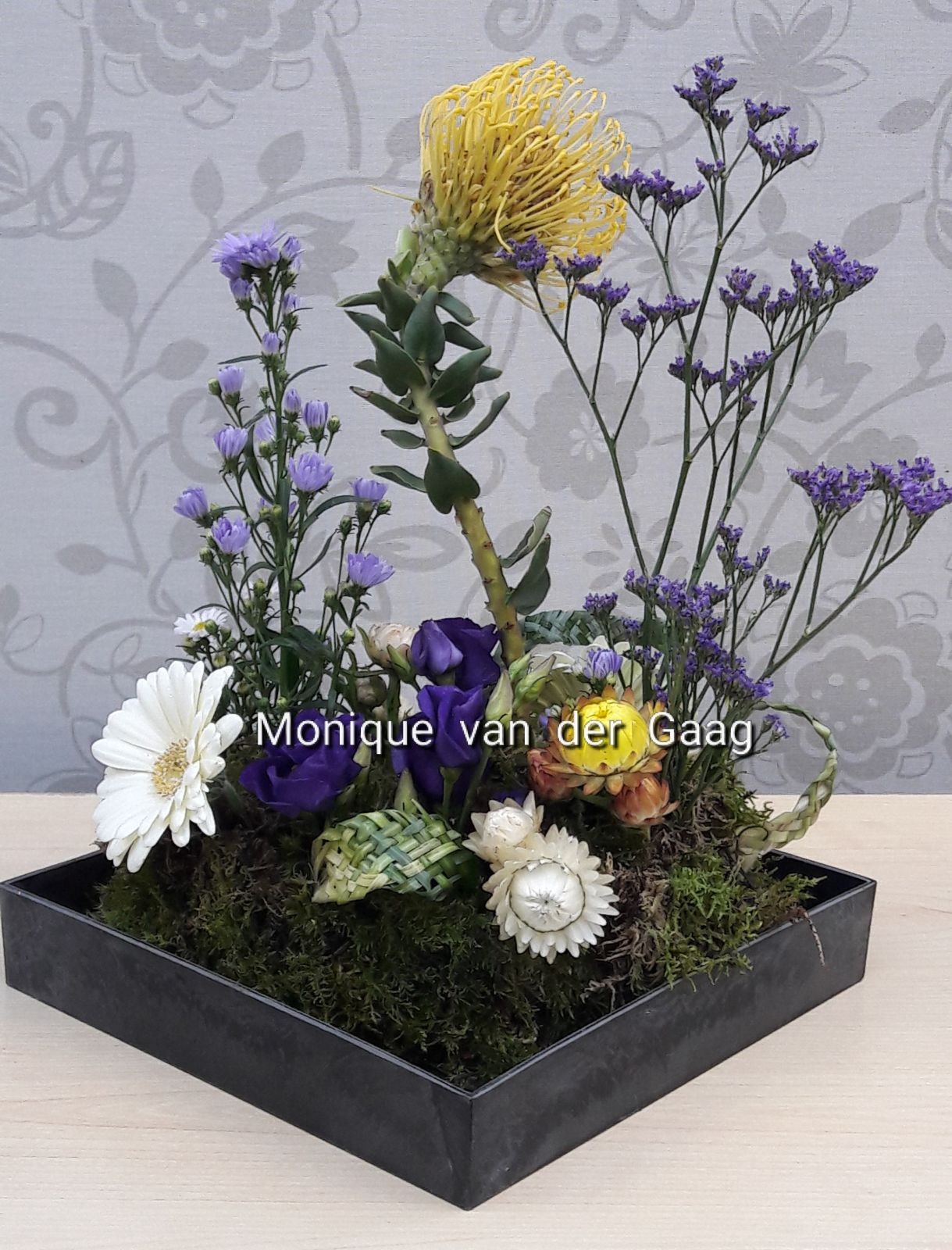 Hoi Nicolle, Dit soort arrangementen maak ik niet vaak, vandaar weer eens uitgeprobeerd. De kromming van 'het gele speldenkussen ' vond ik wel mooi... Wat vind jij? Ik hoor graag je feedback weer. Dankjewel alvast. Grtjs Monique
