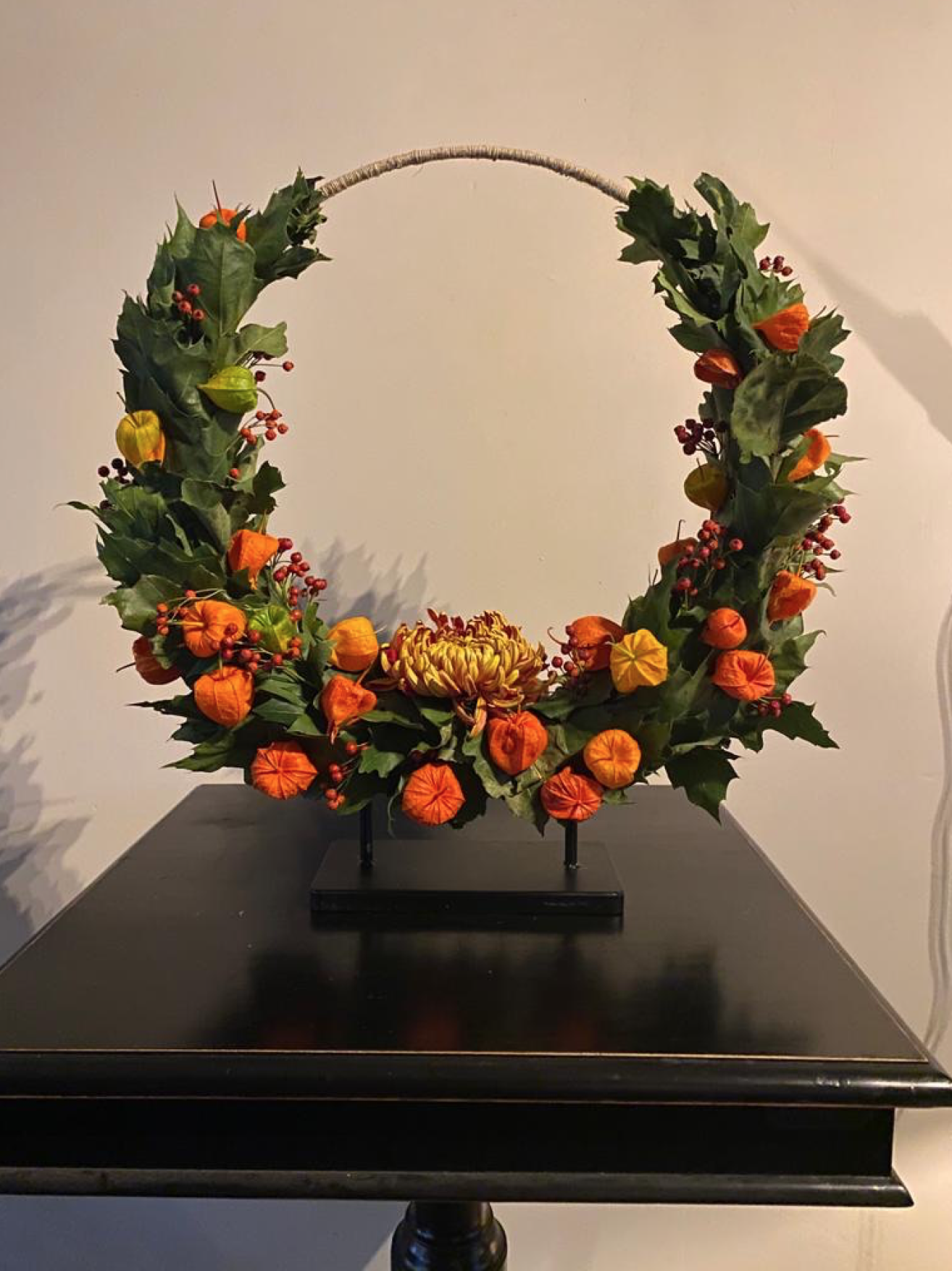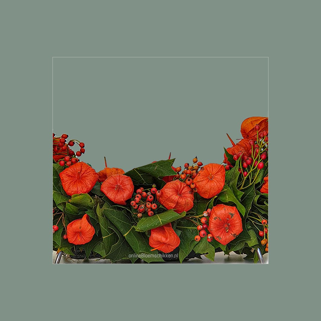 Voor de kerstdagen kan je deze krans ook prima maken. Je vervangt dan de Quercus (eikenblad) door Nobilis (blauwspar) en de Physalis (lampions) door kerstballetjes.