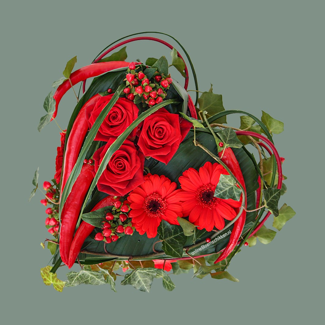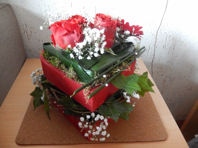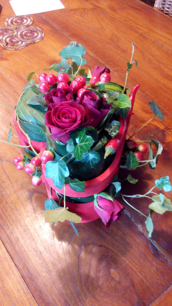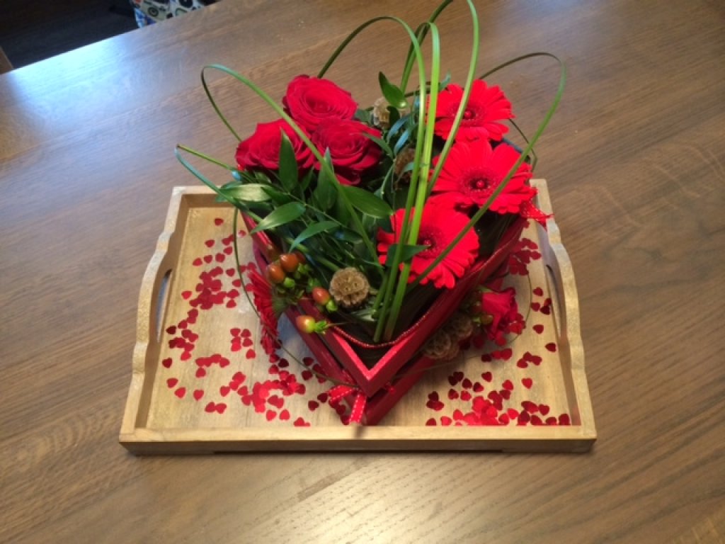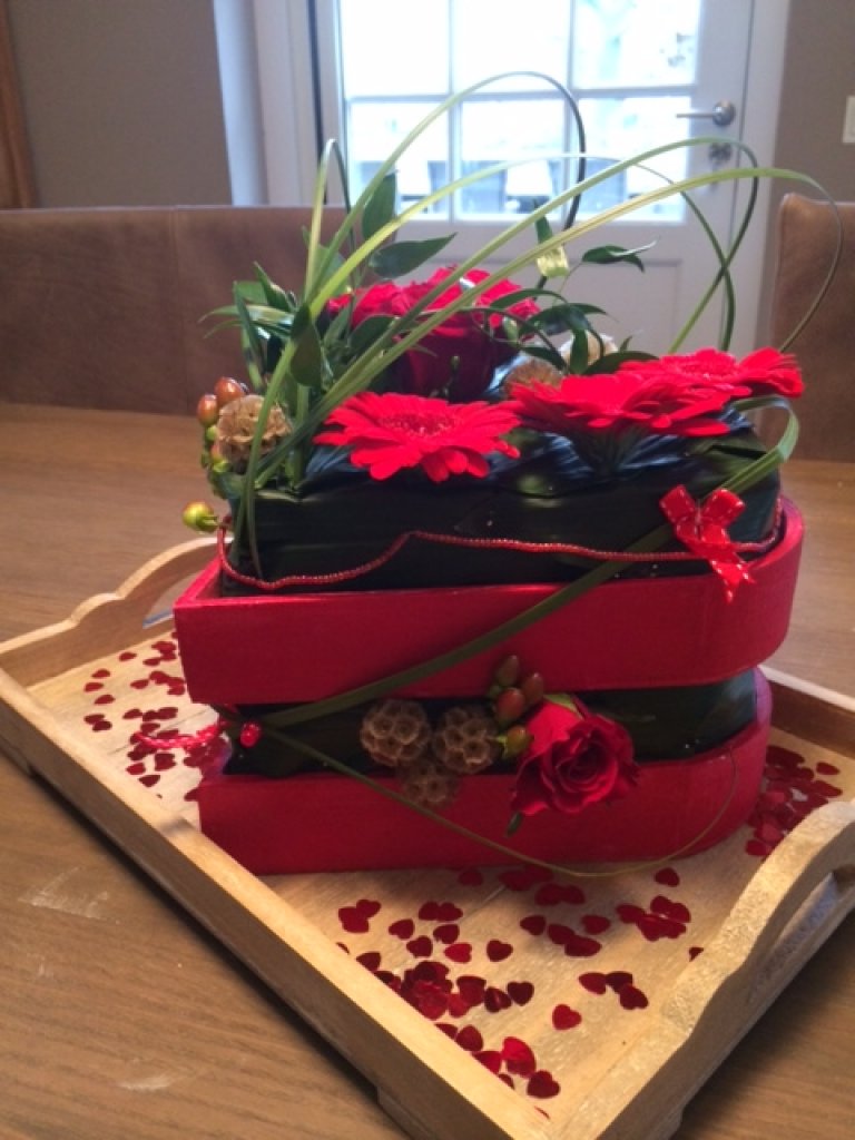 Stapelverliefd...een leuk arrangement voor Valentijn. De techniek van stapelen met oasis en groenten is ook heel leuk als je dat met bijvoorbeeld doet met kleine houten fruitkistjes. Zo is het voor veel meer gelegenheden een leuk stuk om te geven of om neer te zetten.