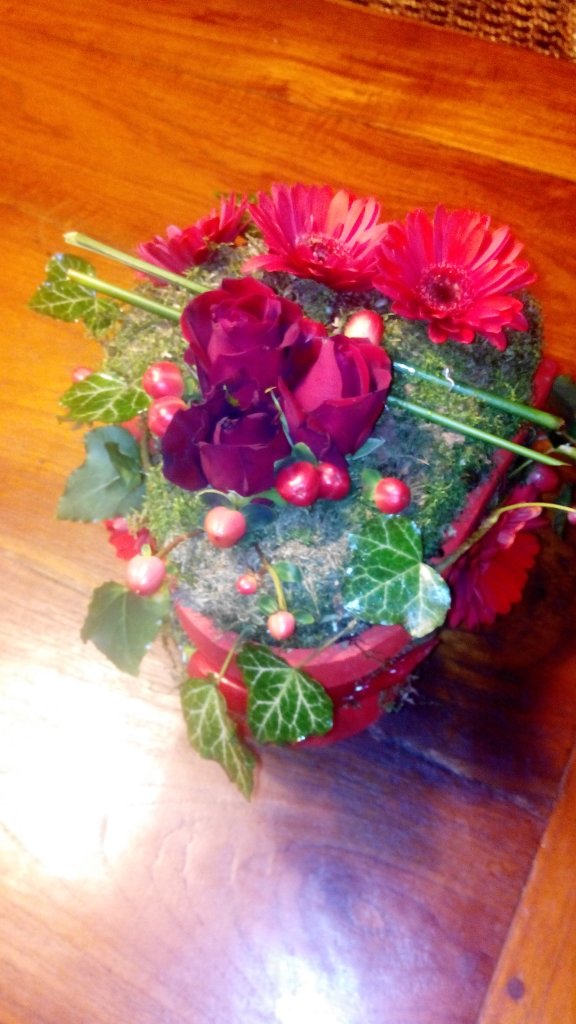 Dit hart heb ik vanmiddag gemaakt. Ik had wat verschillende soorten rozen over en een rieten hart waar ik zelf oasis in heb gedaan. Vond t best lastig om de vorm van t hart erin te krijgen. Is nog niet helemaal gelukt. Maar vond t wel n leuke oefening. Zodra de kleine hartjes weer te koop zijn wil ik n keer de stapelverliefd maken zoals online staat aangeboden.