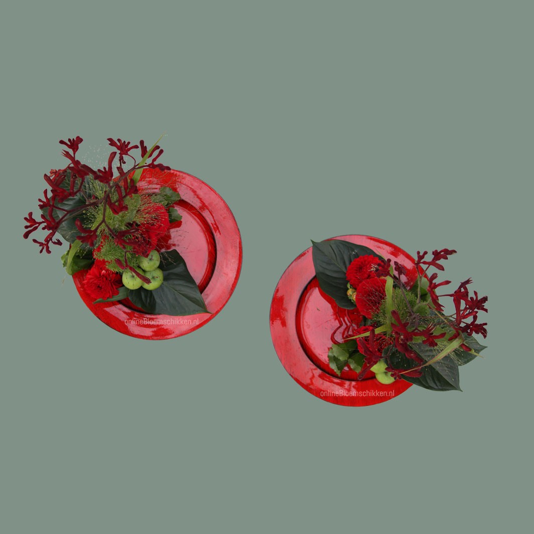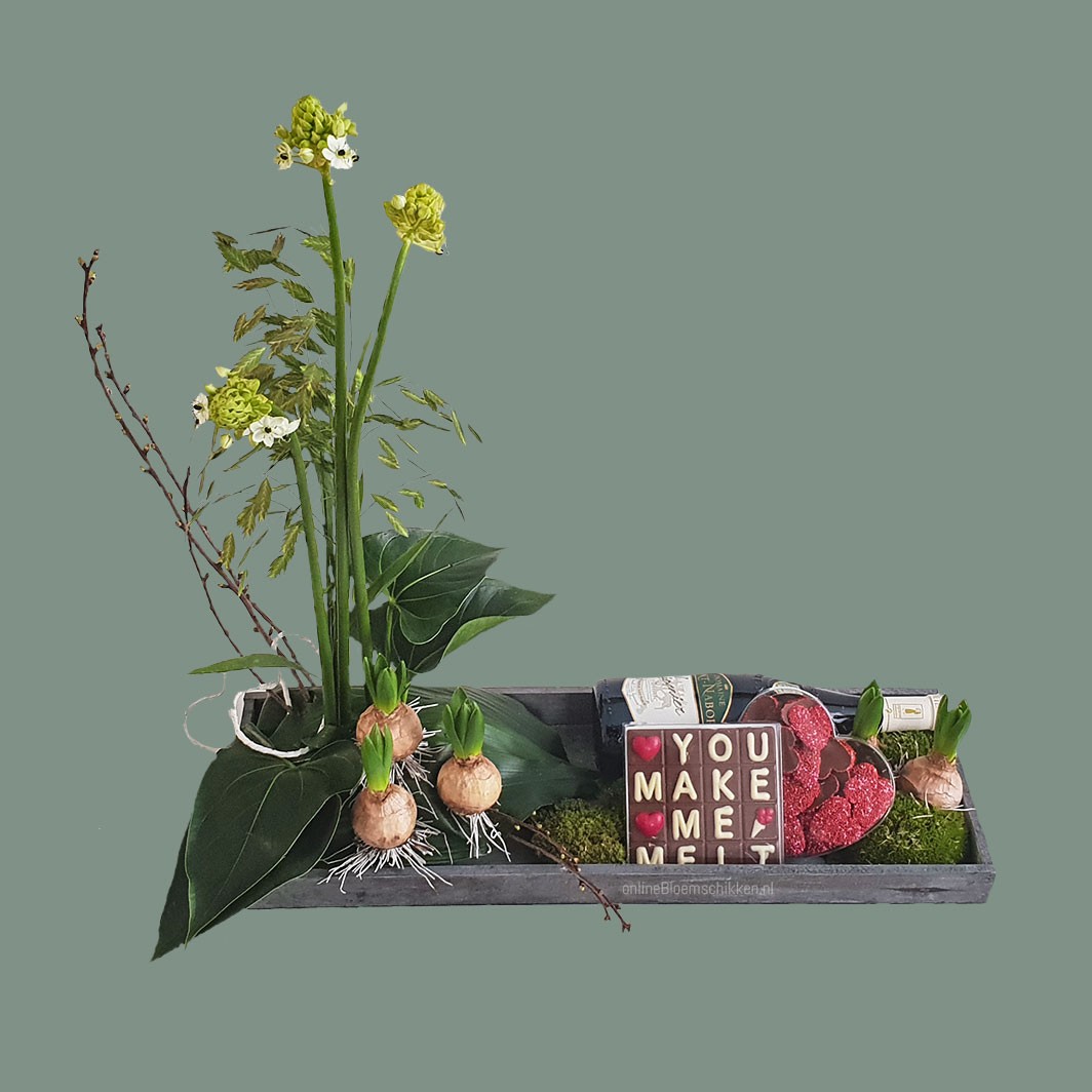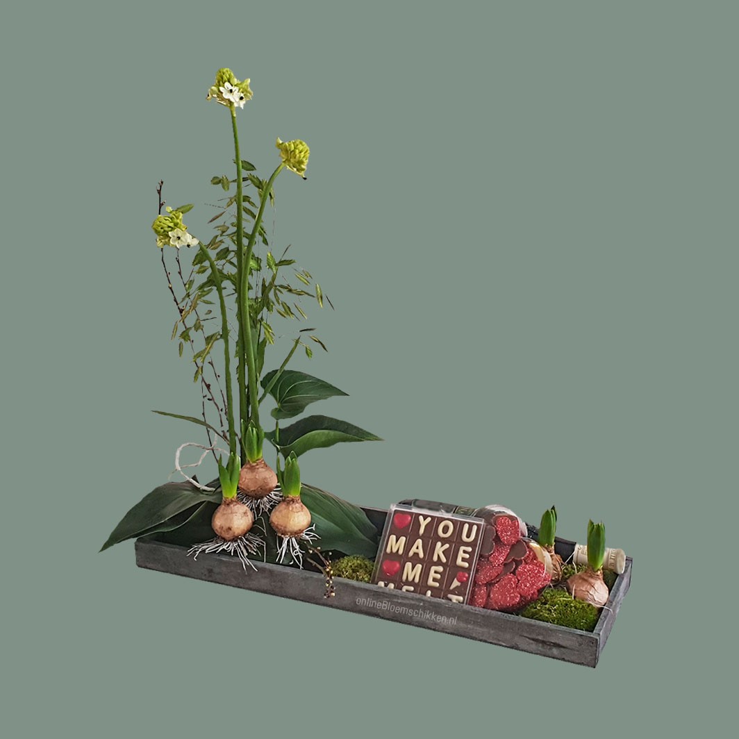 Dit lineaire arrangement is op een waterschotel gemaakt en daardoor kan het makkelijk op een ondergrond geplaatst worden die niet waterdicht is. Op deze manier kunnen er ook makkelijk cadeau-artikelen bij geplaatst worden zonder dat deze nat worden.