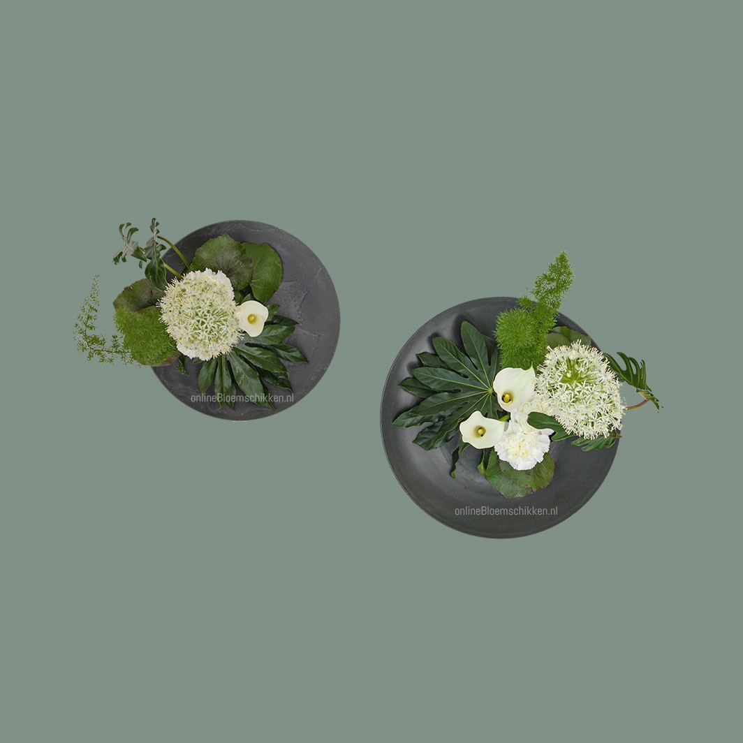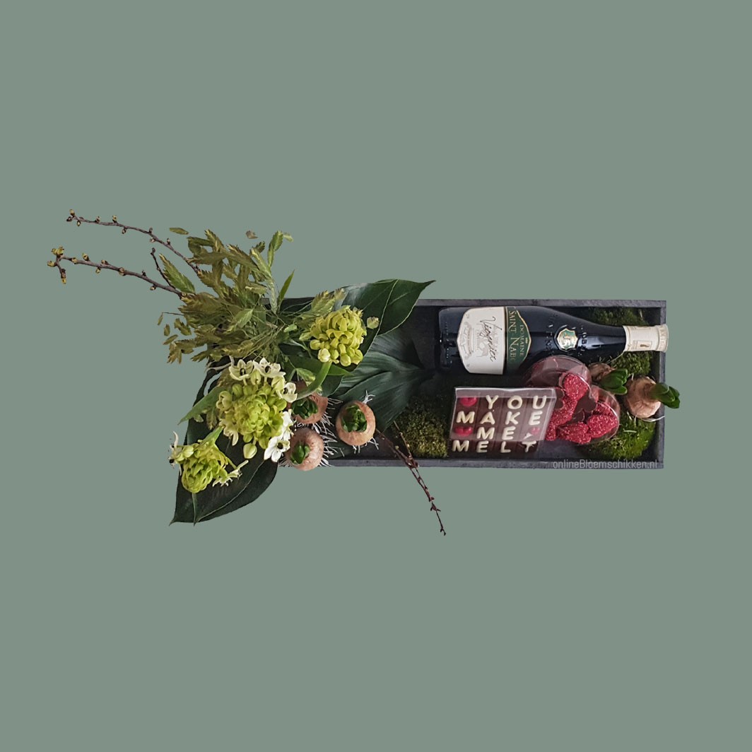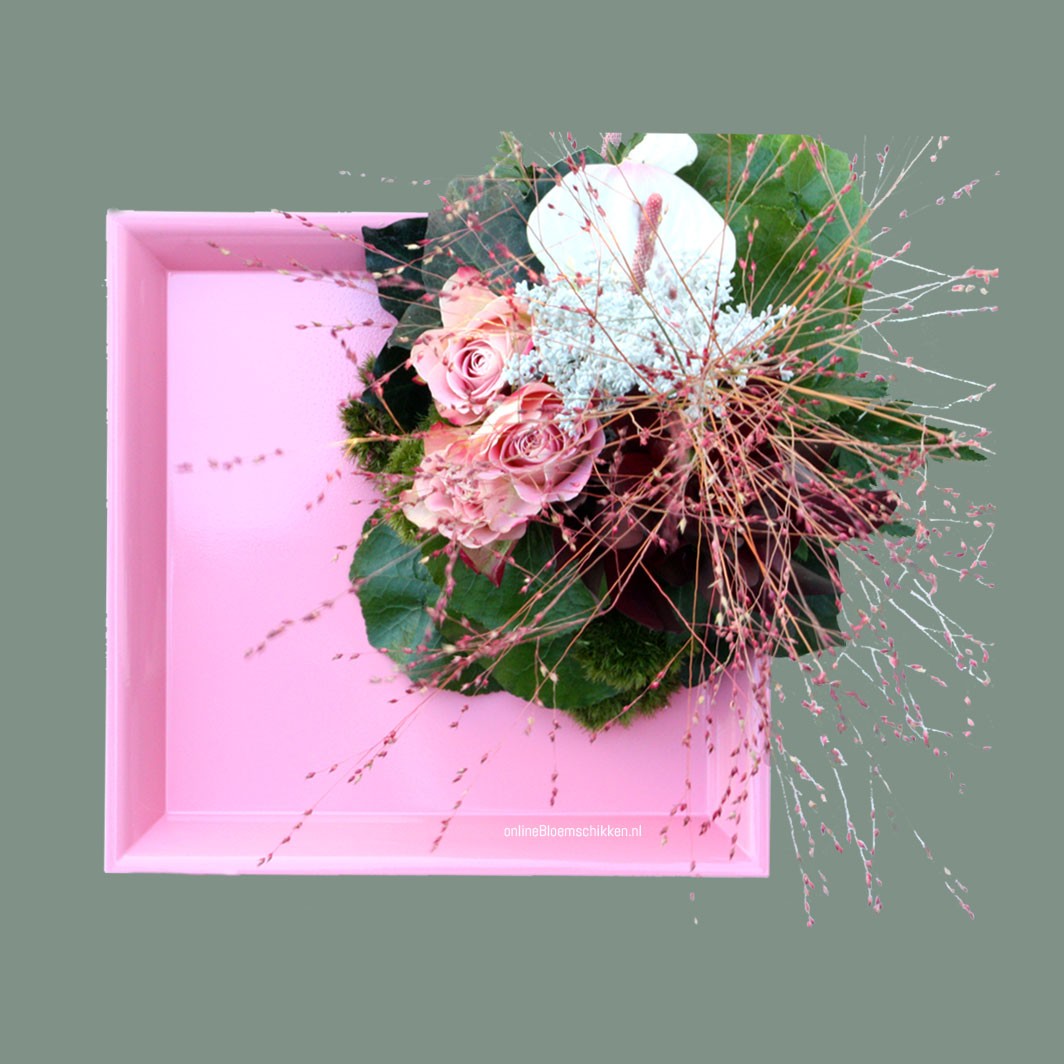 Dit lineaire arrangement is op een waterschotel gemaakt en daardoor kan het makkelijk op een ondergrond geplaatst worden die niet waterdicht is. Op deze manier kunnen er ook makkelijk cadeau-artikelen bij geplaatst worden zonder dat deze nat worden.