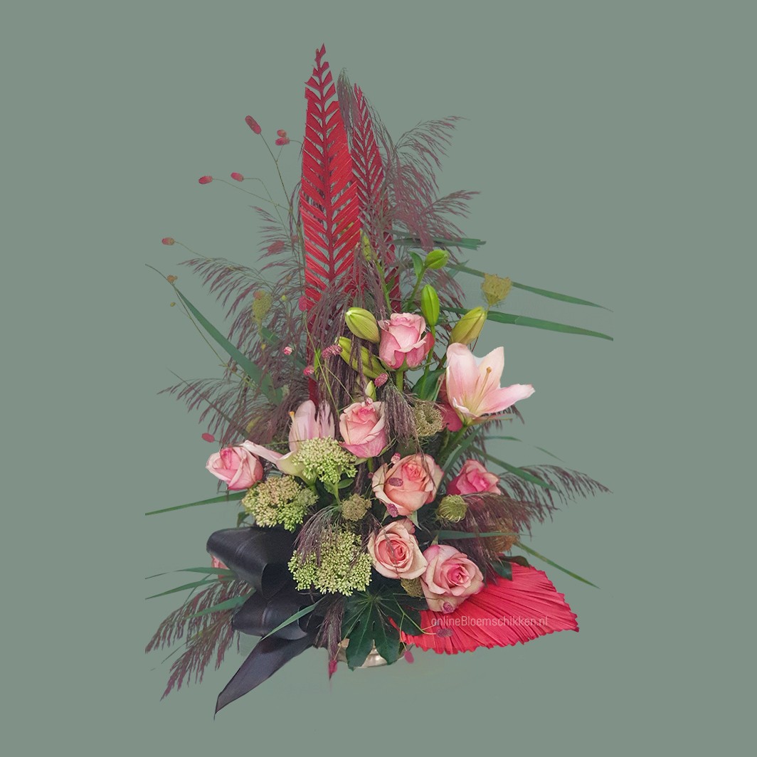 Dit arrangement is uitstekend geschikt voor een bruiloft. Of het nu op het strand is of in een kasteel, het past op veel verschillende locaties. De stijl van het arrangement kan je ook heel goed terug laten komen in de autoversiering en/of de bloemenboog.
