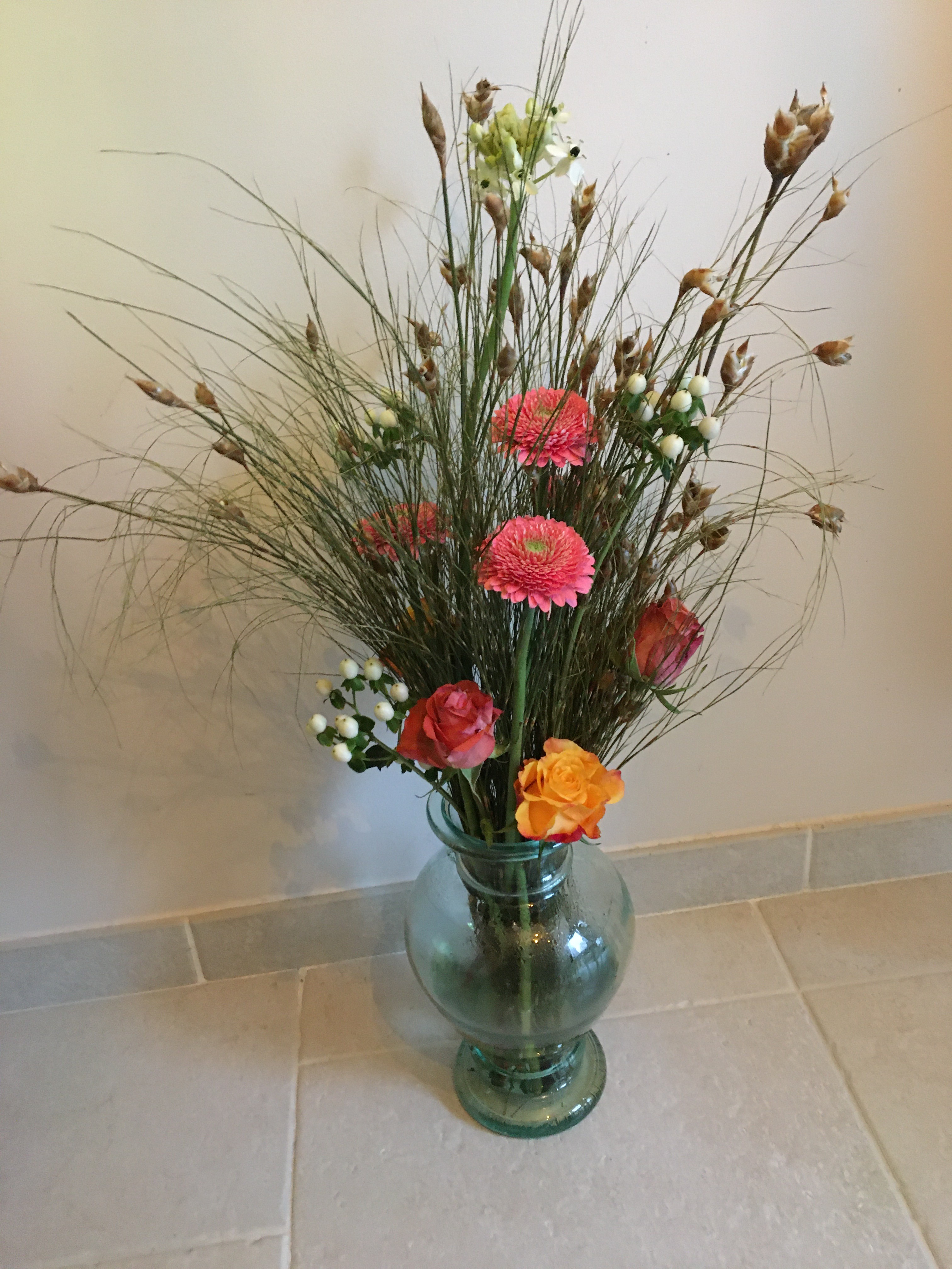 Ik vind er niks mis mee met je boeket. Mooie vorm die goed bij je vaas past en frisse kleuren. Misschien had jij meer dat soort boeket in je hoofd wat je nu veel ziet. Dan mis je eigenlijk een paar langwerpige bloemen. Nu is alles vrij rond en krijg je minder diepte. Dus lange bloemen lang laten en een paar zware ronde bloemen onderin om ruimte te krijgen.