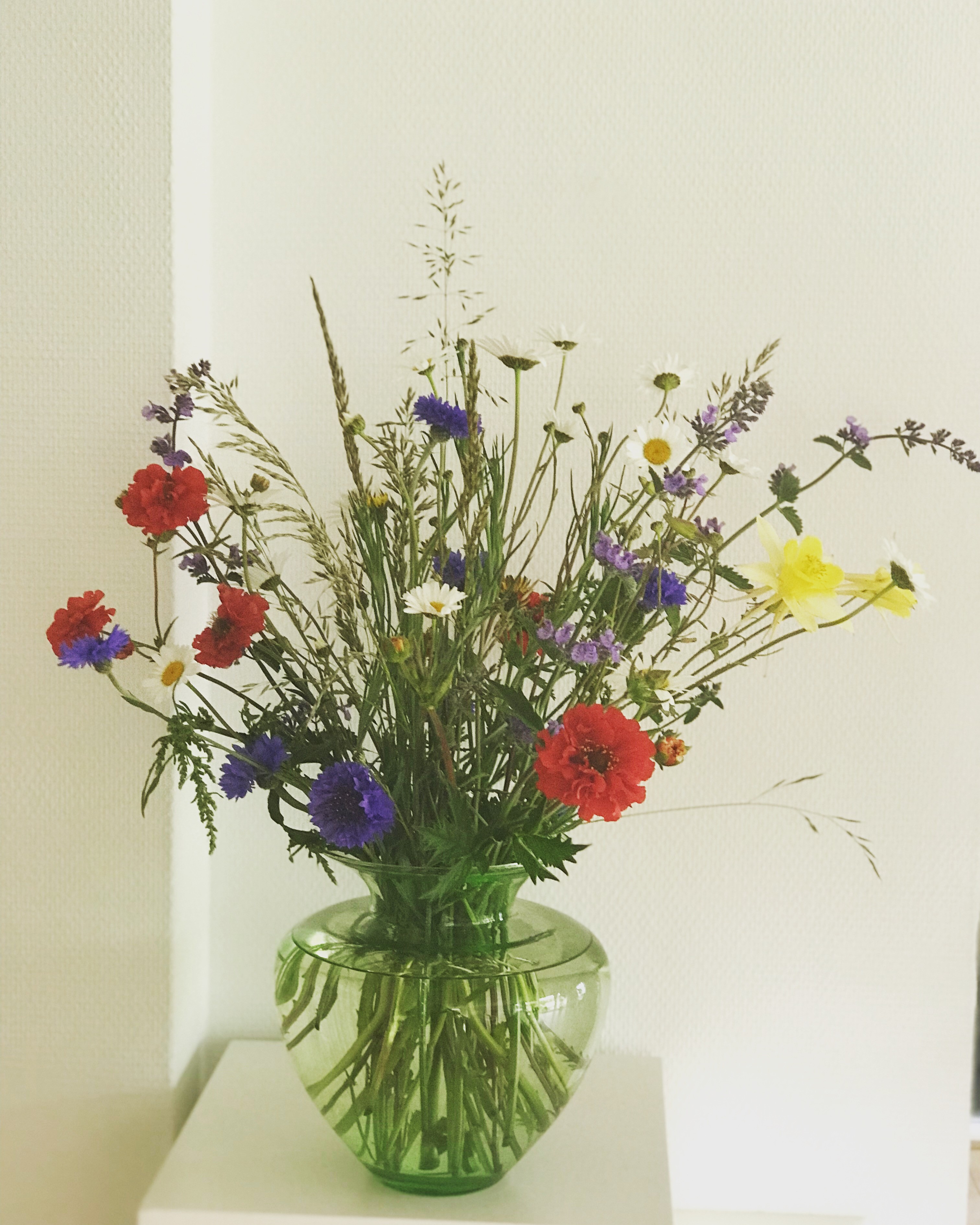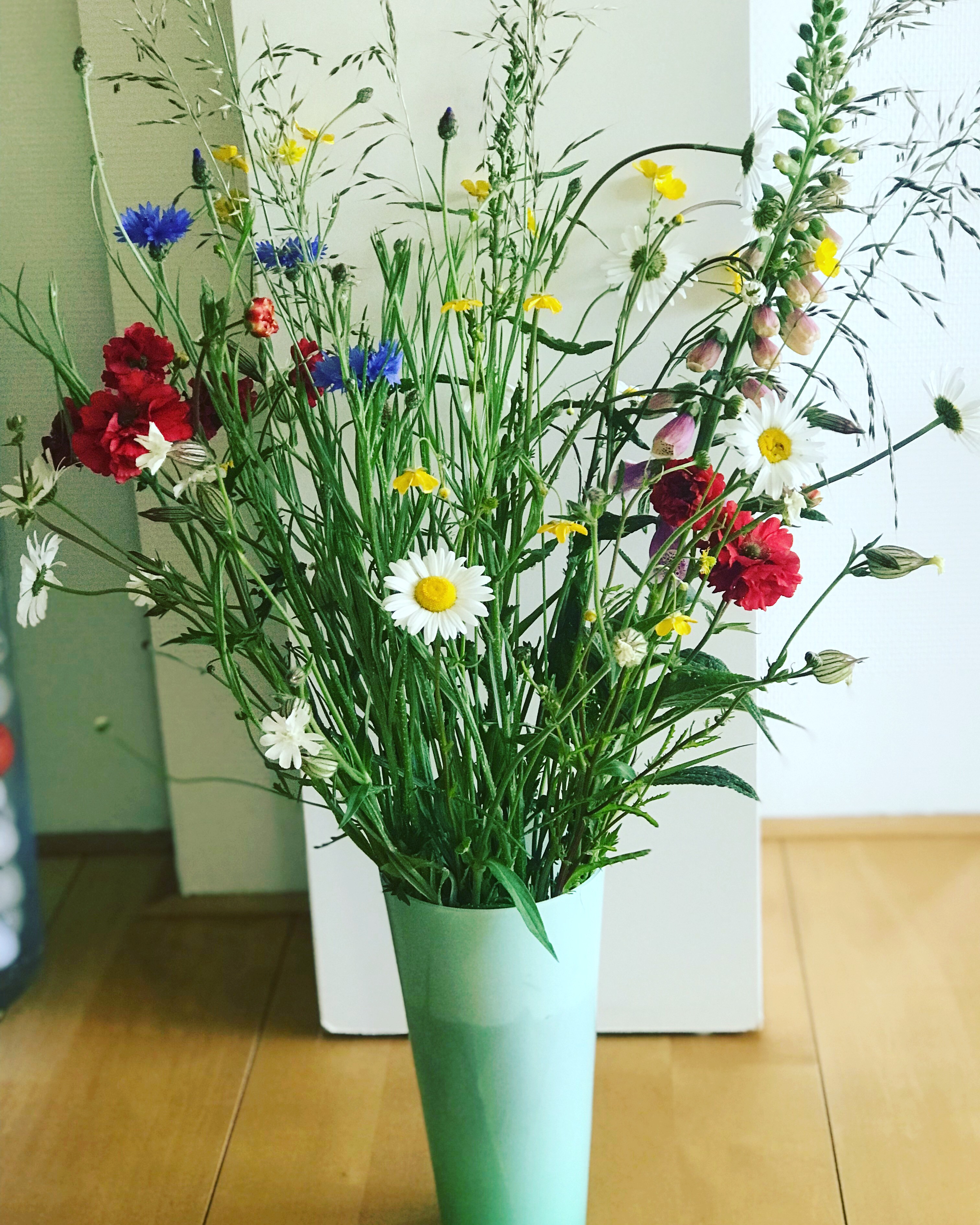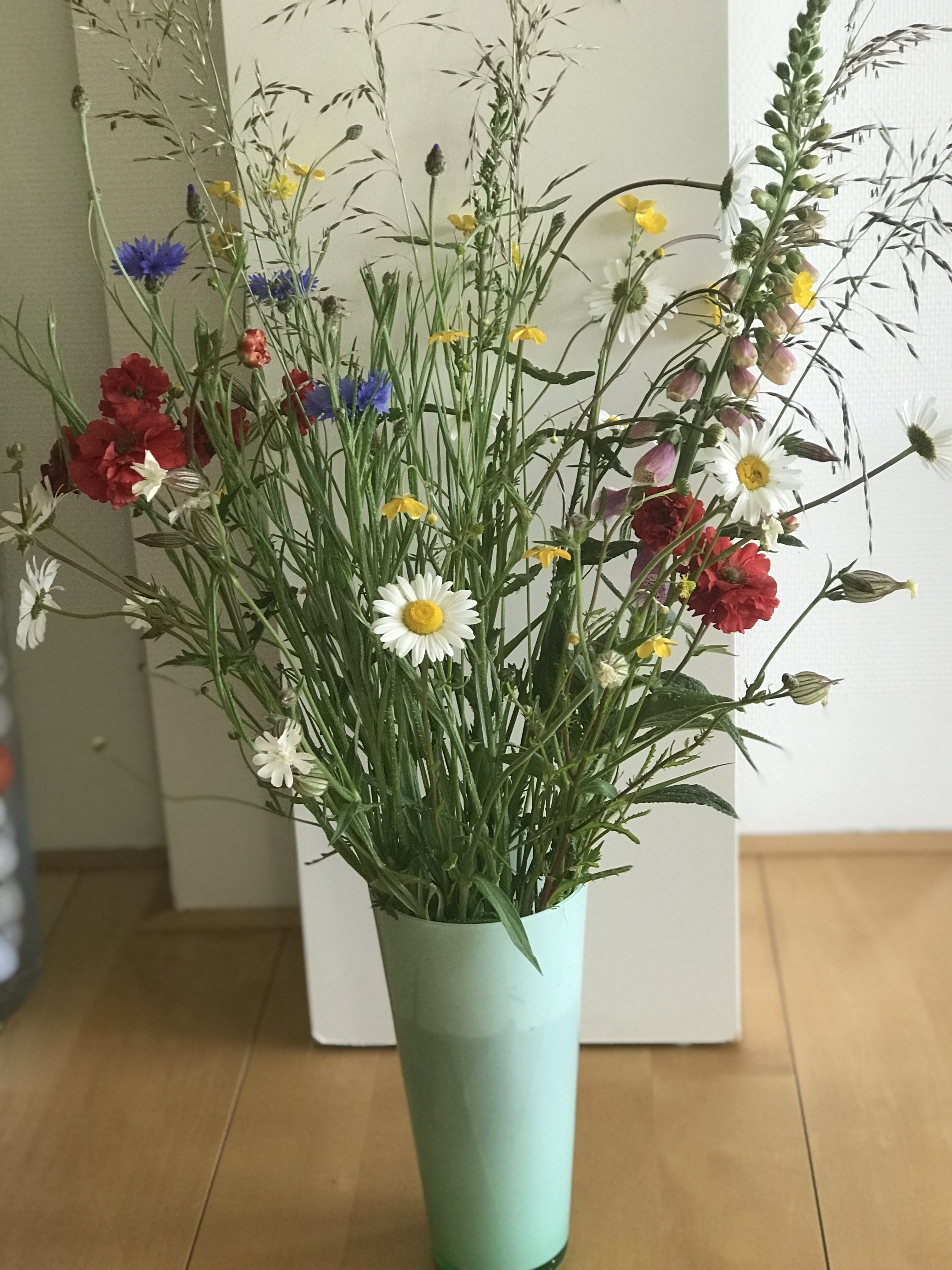 Hallo Nicolle, Zo leuk om zelf mijn bloemen te plukken, terwijl de bijen om mij heen zoemen in één van de vele pluk-tuinen in mijn omgeving! De boeketjes pasten in een limonadeglas of een klein karafje, wat heel toepasselijk was, omdat ze als tafelschikking dienden. Klaver, klaproos (nog in de knop geplukt), korenbloem, kamille, Cosmea, de zaaddozen van Juffertje in 't Groen, zonnebloem, dille en nog veel meer: geweldig gewoon. Heb je nog tips voor mij, zijn er dingen die beter kunnen? Ik hoor het graag. Dankjewel alvast. Het was een vrolijk etentje, gisteren. Ook door de kleurige bloemen. Ze waren laag genoeg om de ander aan de overzijde van de tafel te kunnen zien. Grtjs Vlijtig liesje