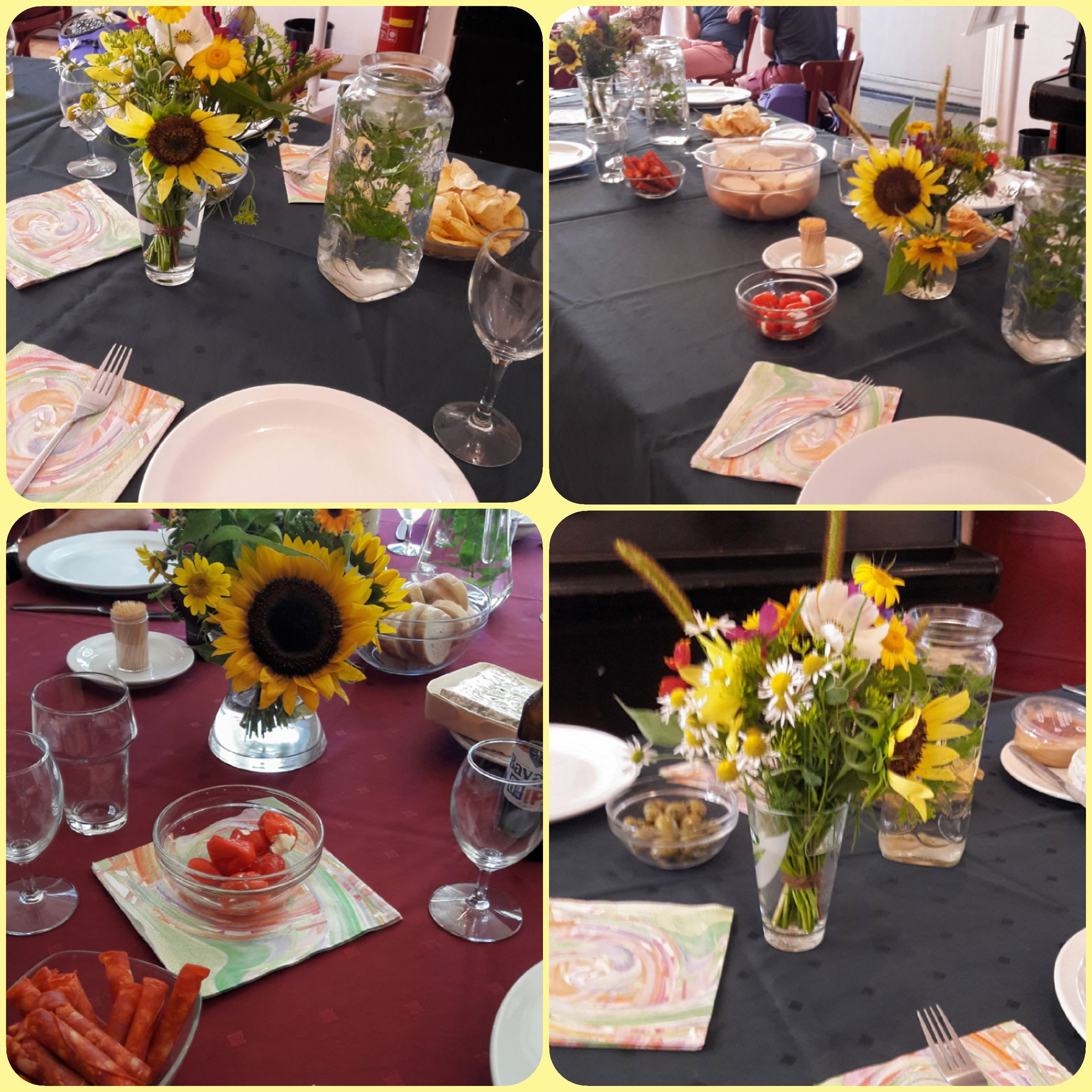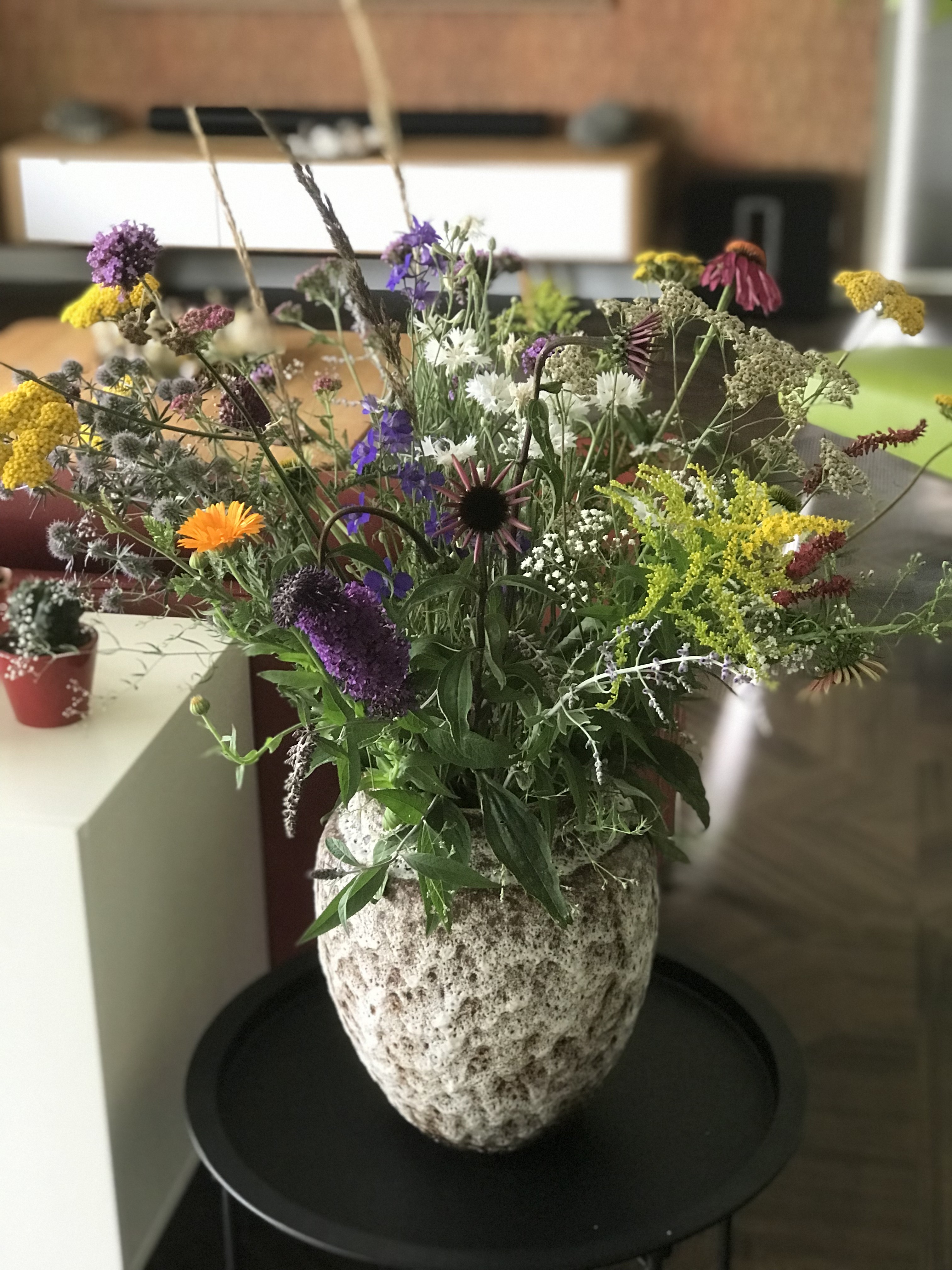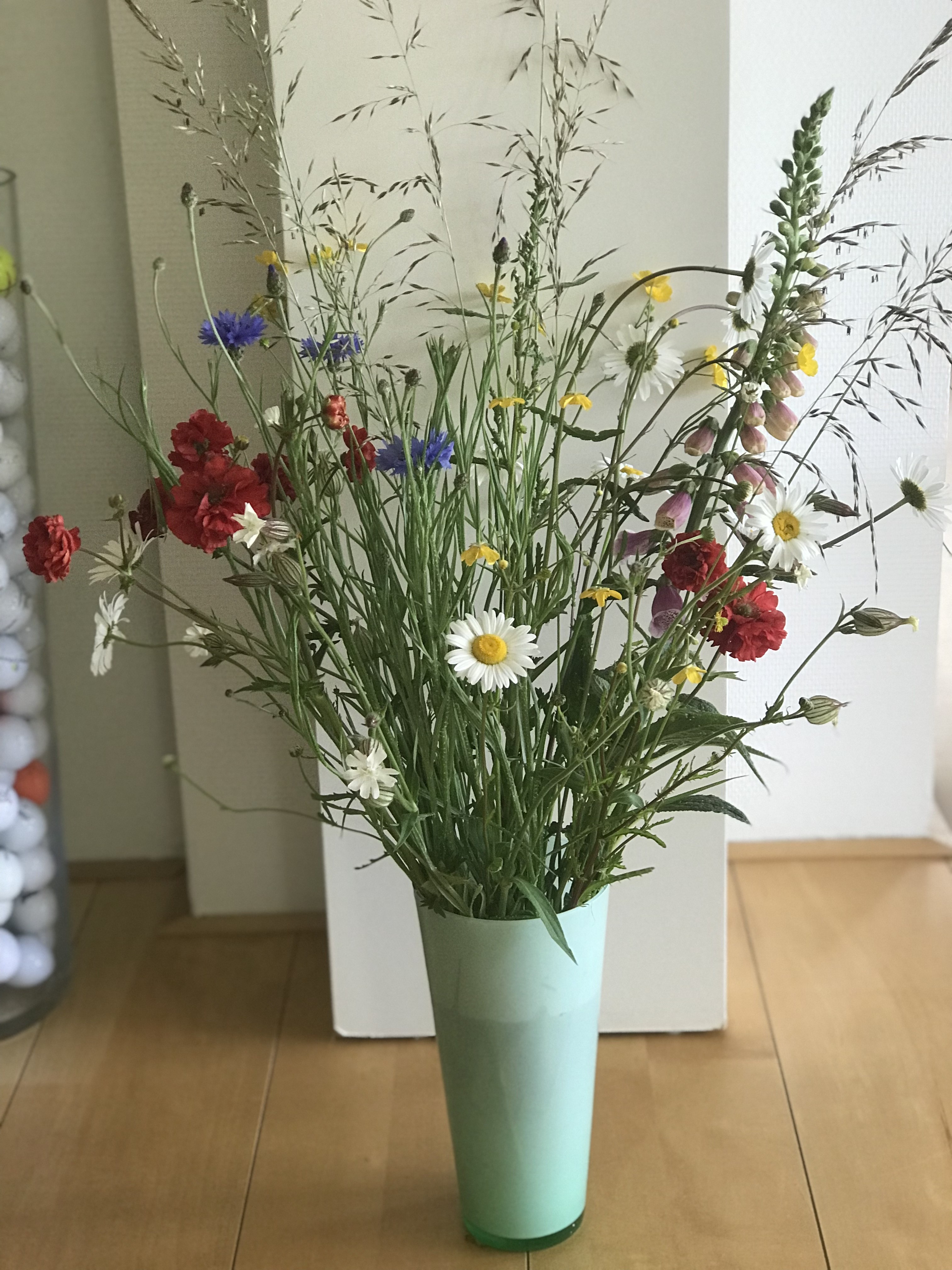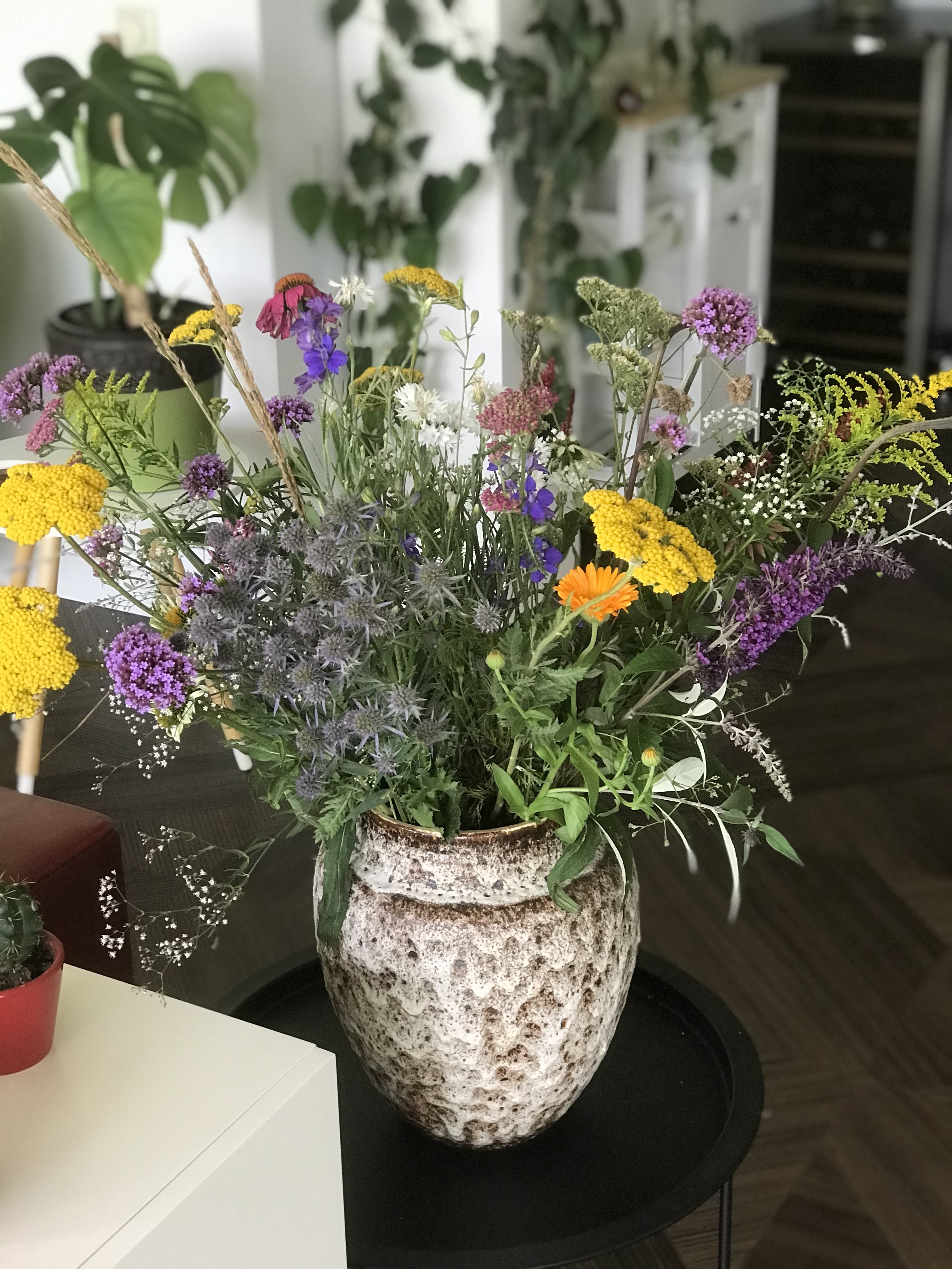 Hallo Nicolle, Zo leuk om zelf mijn bloemen te plukken, terwijl de bijen om mij heen zoemen in één van de vele pluk-tuinen in mijn omgeving! De boeketjes pasten in een limonadeglas of een klein karafje, wat heel toepasselijk was, omdat ze als tafelschikking dienden. Klaver, klaproos (nog in de knop geplukt), korenbloem, kamille, Cosmea, de zaaddozen van Juffertje in 't Groen, zonnebloem, dille en nog veel meer: geweldig gewoon. Heb je nog tips voor mij, zijn er dingen die beter kunnen? Ik hoor het graag. Dankjewel alvast. Het was een vrolijk etentje, gisteren. Ook door de kleurige bloemen. Ze waren laag genoeg om de ander aan de overzijde van de tafel te kunnen zien. Grtjs Vlijtig liesje
