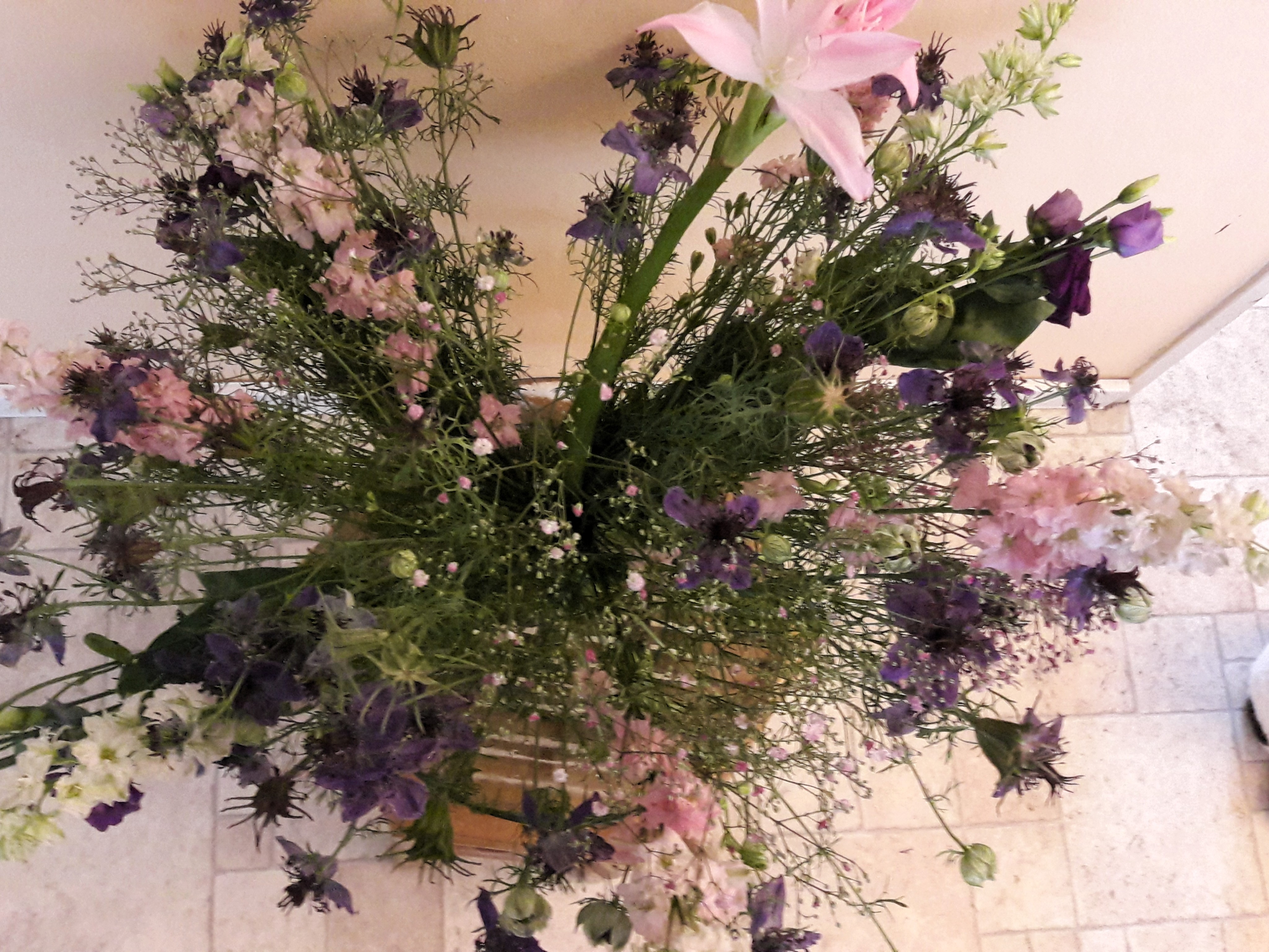 Hallo Nicolle, Vandaag had ik zin om een groot, luchtig boeket te maken in roze en blauw, de lievelingskleuren van een bevriend echtpaar, dat bijna jarig is. Ik heb 10 stelen Juffertjes in het groen gebruikt, 3 donkerpaarse Lisianthus, 8 roze Delphinium (er waren er 2 gebroken, maar ik kreeg ze met korting), 3 takken roze gipskruid en 1 roze Nerrine (die kreeg ik ook met korting, anders niet te betalen). Het boeket korenschoof gebonden uiteraard en de 'Blijft het staan-proef' gedaan. Heb je nog tips voor mij, wat kan beter? Groetjes Vlijtig liesje