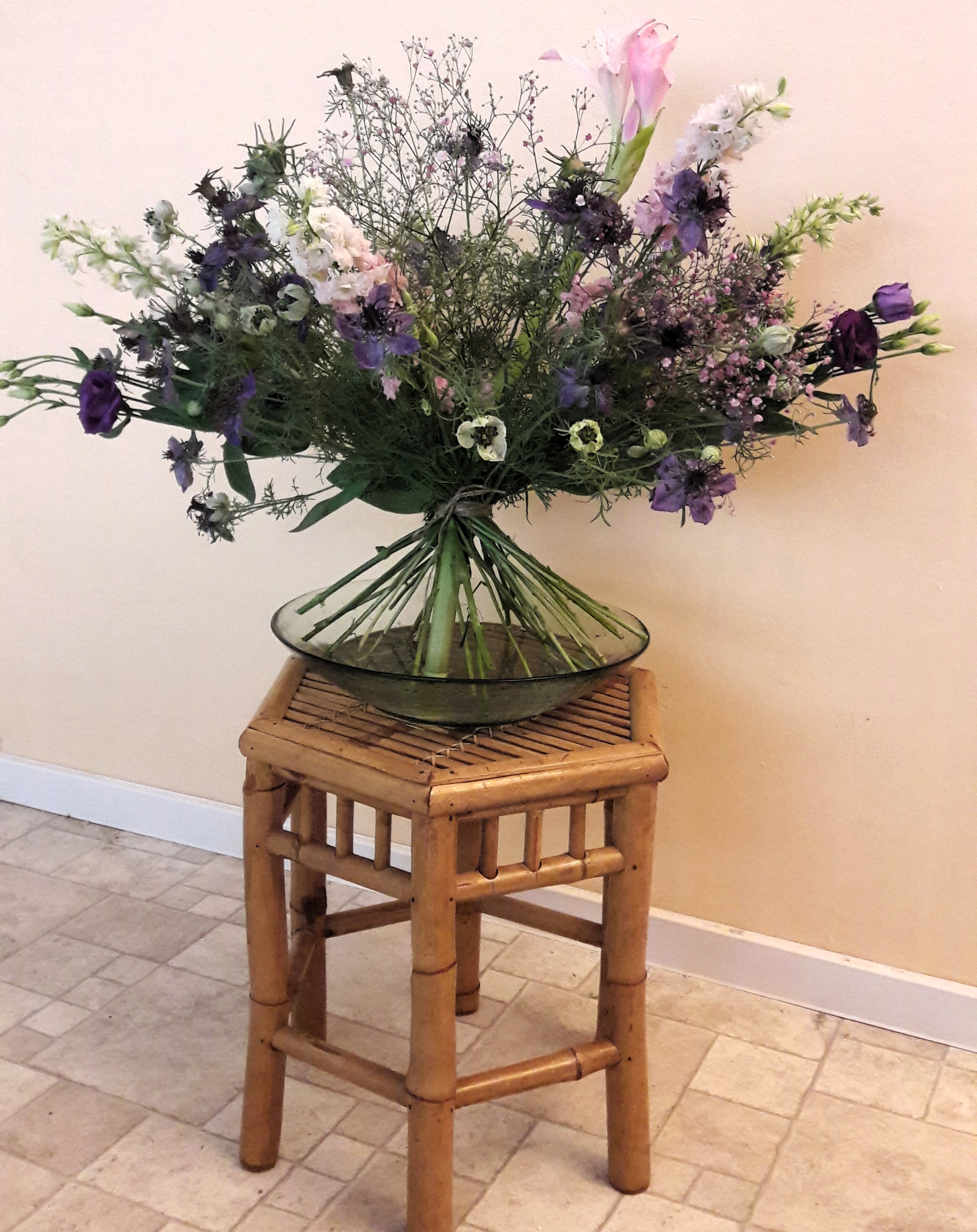 Hallo Nicolle, Vandaag had ik zin om een groot, luchtig boeket te maken in roze en blauw, de lievelingskleuren van een bevriend echtpaar, dat bijna jarig is. Ik heb 10 stelen Juffertjes in het groen gebruikt, 3 donkerpaarse Lisianthus, 8 roze Delphinium (er waren er 2 gebroken, maar ik kreeg ze met korting), 3 takken roze gipskruid en 1 roze Nerrine (die kreeg ik ook met korting, anders niet te betalen). Het boeket korenschoof gebonden uiteraard en de 'Blijft het staan-proef' gedaan. Heb je nog tips voor mij, wat kan beter?