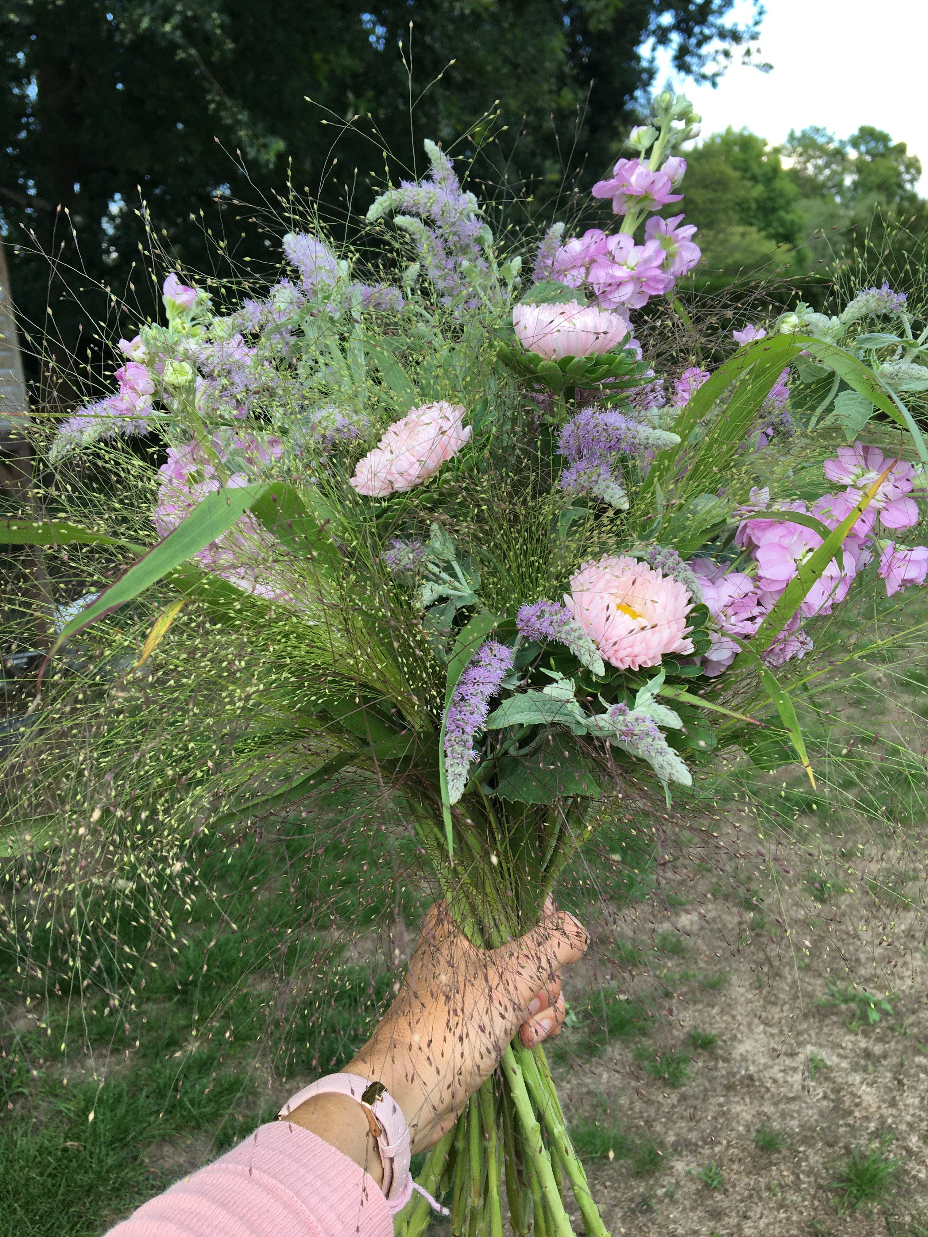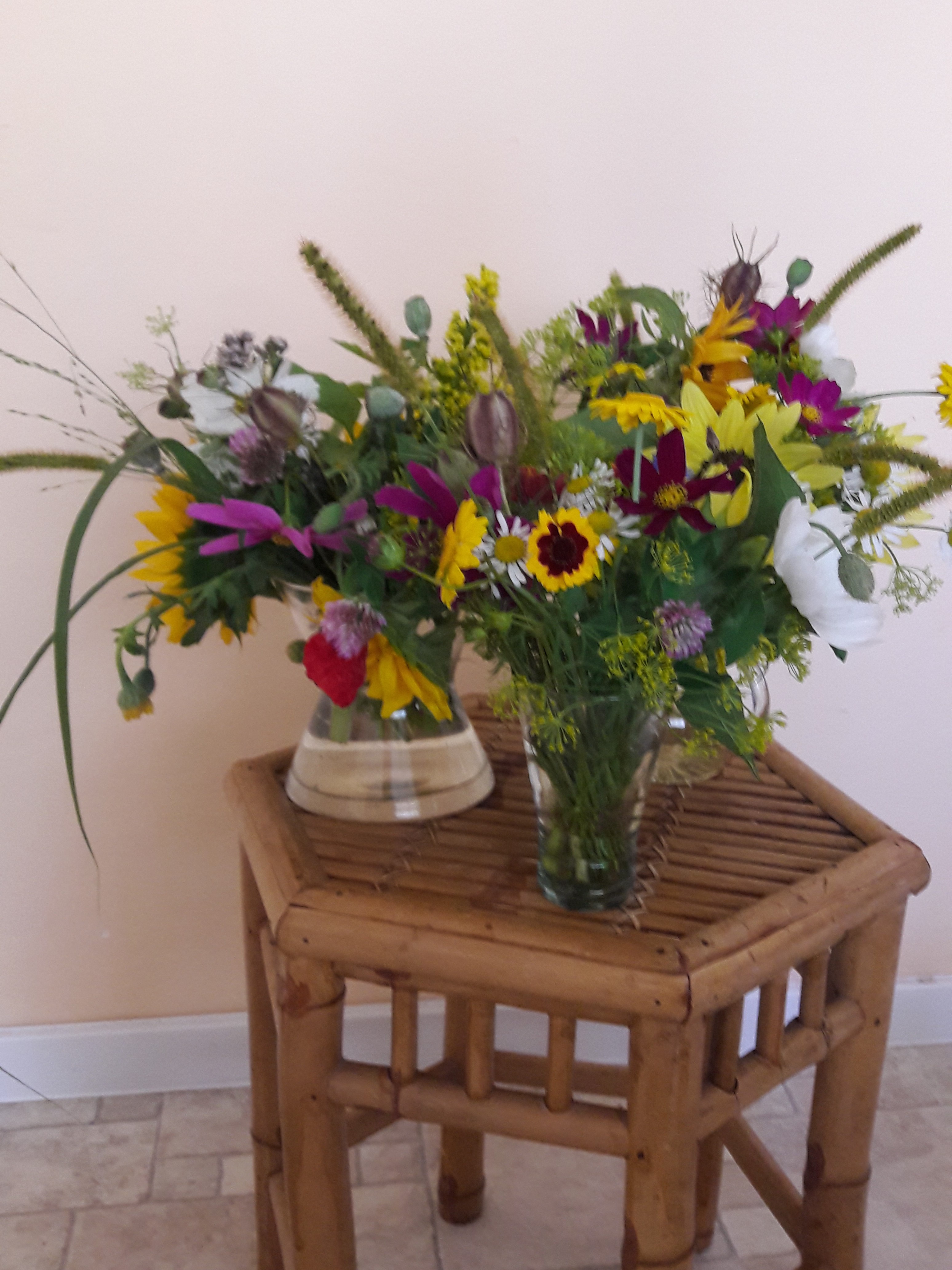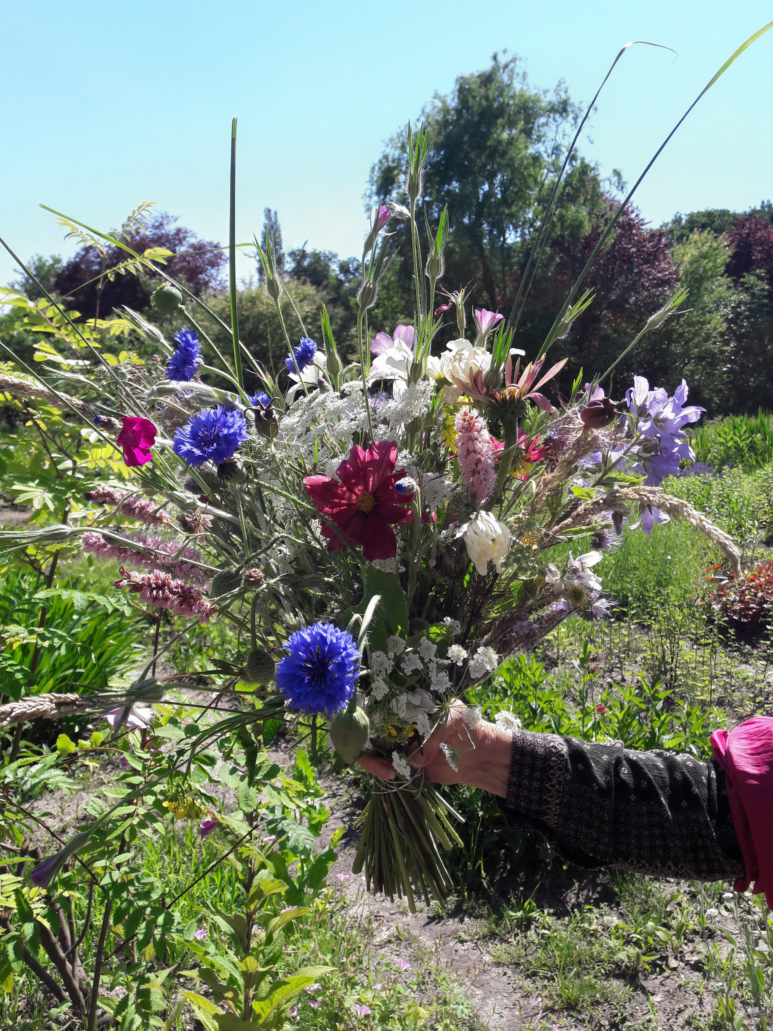 Het is toch wat met die Pluk-tuinen! Sommige zijn echt commercieel, terwijl er veel vrijwilligers rondlopen, die geen salaris krijgen. De boeketten zouden dus niet extreem duur hoeven zijn, met zoveel onbetaalde menskracht. Gelukkig een andere pluk-tuin gevonden, iets verder weg. Daar komen deze boeketjes vandaan. Bloemen zijn daar bijzaak. Ze richten zich meer op groenten en fruit. Ze vinden het leuk dat ik zo blij word van het plukken. Soms hoef ik maar 1,50 Euro af te rekenen. Soms mag ik de bloemen zelfs voor niks meenenen. Ik zal volgende week in ruil maar eens een pak gevulde koeken achterlaten voor zoveel bloemenpracht... En verder is het inderdaad een idee dat ik wat meer bloemen in mijn tuin ga zaaien, om daar dan te plukken. Goed plan.