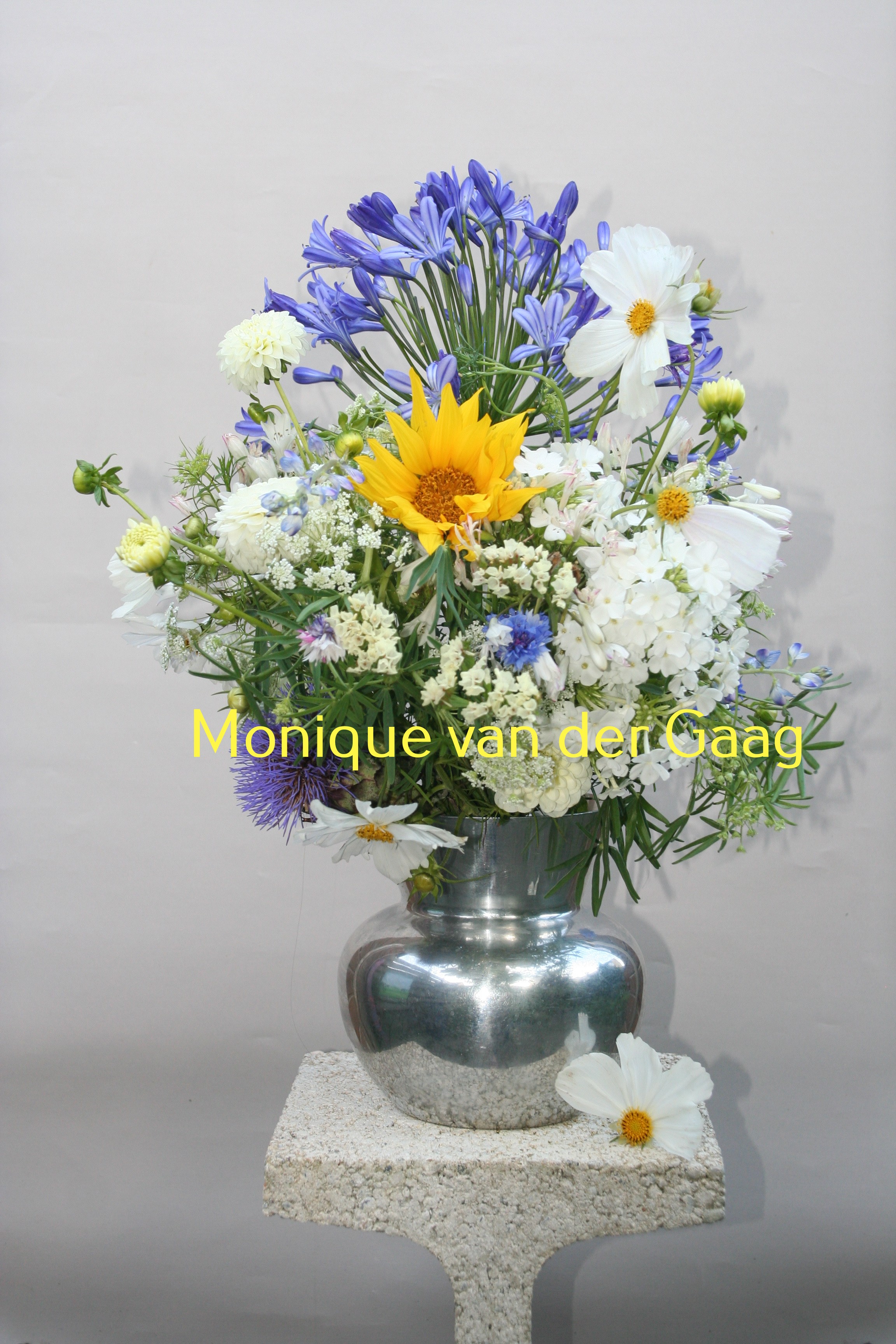 Heel graag ontvang ik jouw feedback op dit blauw/witte boeket met één zonnebloem. De bloemen zijn mooi, maar het boeket lukte niet goed. Wat ging hier mis? Zo fijn dat ik hier vragen kan stellen en tips kan krijgen. Alvast bedankt.