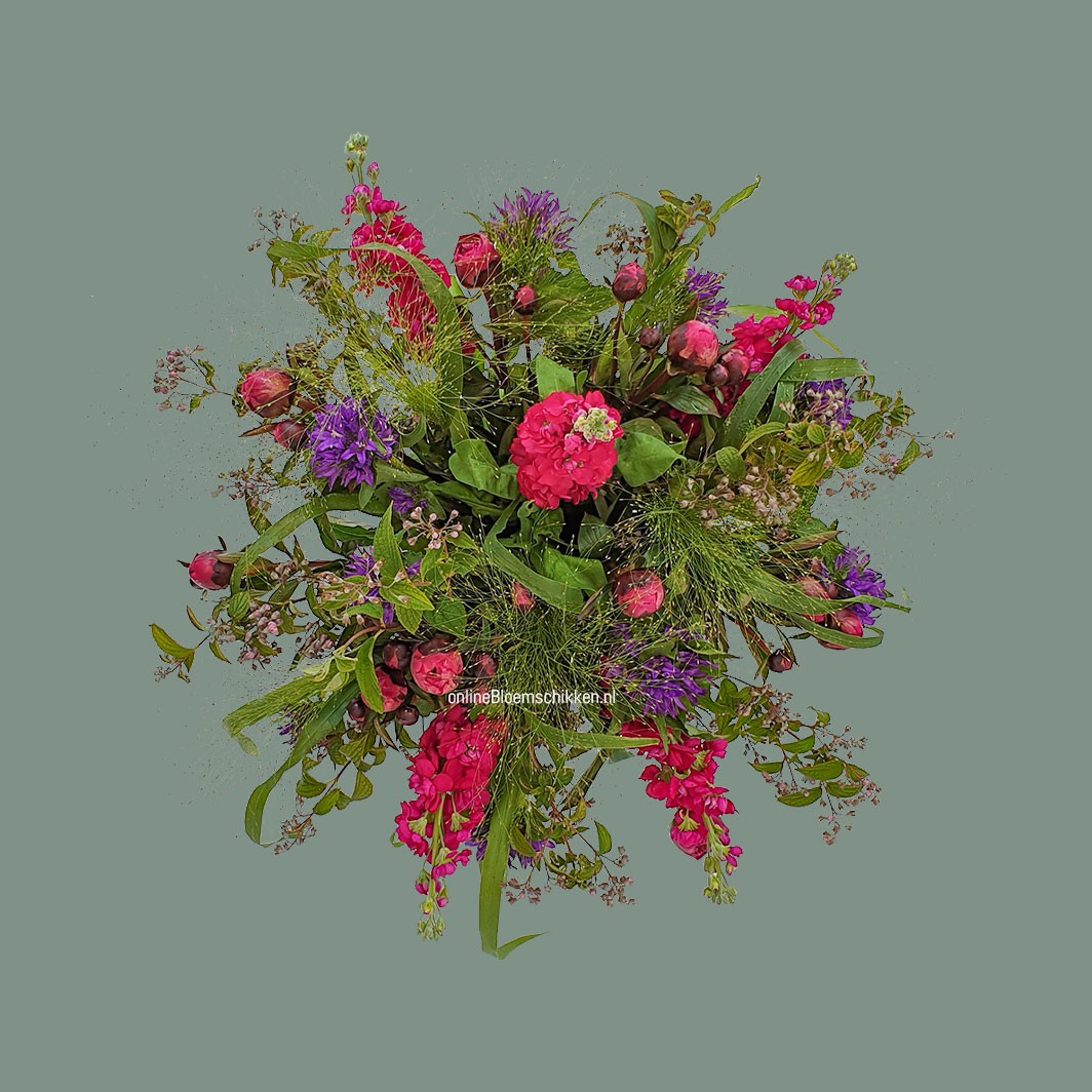 Als het in de hand is gebonden is dan is het naar mijn mening een handgebonden boeket. Jouw vaas kan een parallel handgebonden boeket zijn, maar had zou ook een vaasschikking kunnen zijn. Ik vind het in iedergeval een hele leuke schikking. Die zou ik zo thuis neer zetten.