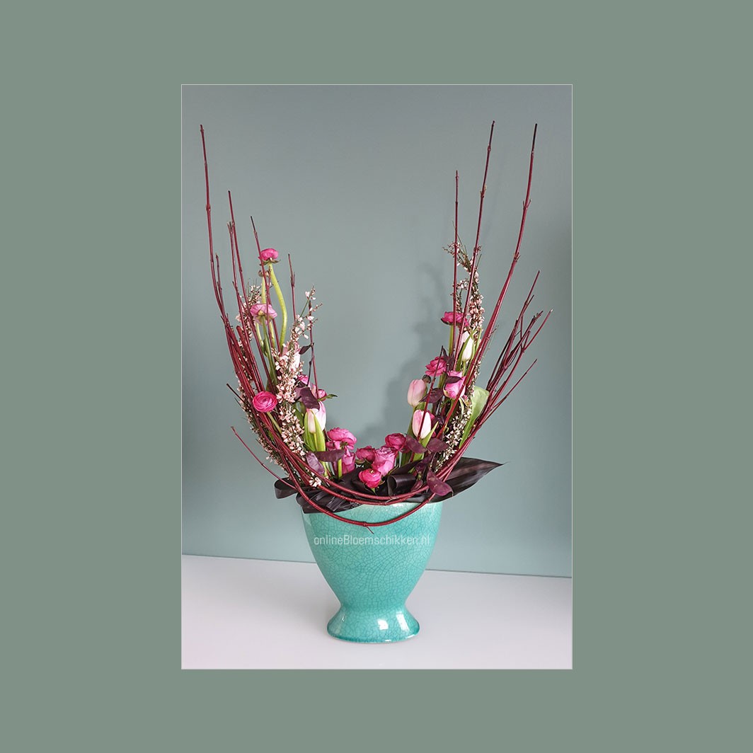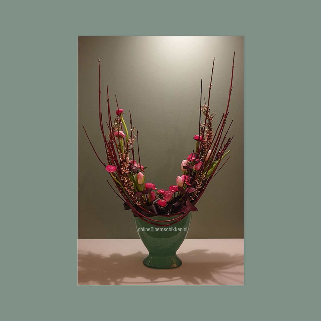 Dit voorjaarsarrangement heeft veel weg van een halve Maanschikking. De truc is alleen: hoe zet je de Cornus aan de voorkant vast? Natuurlijk leggen we dat goed en duidelijk uit tijdens deze les.