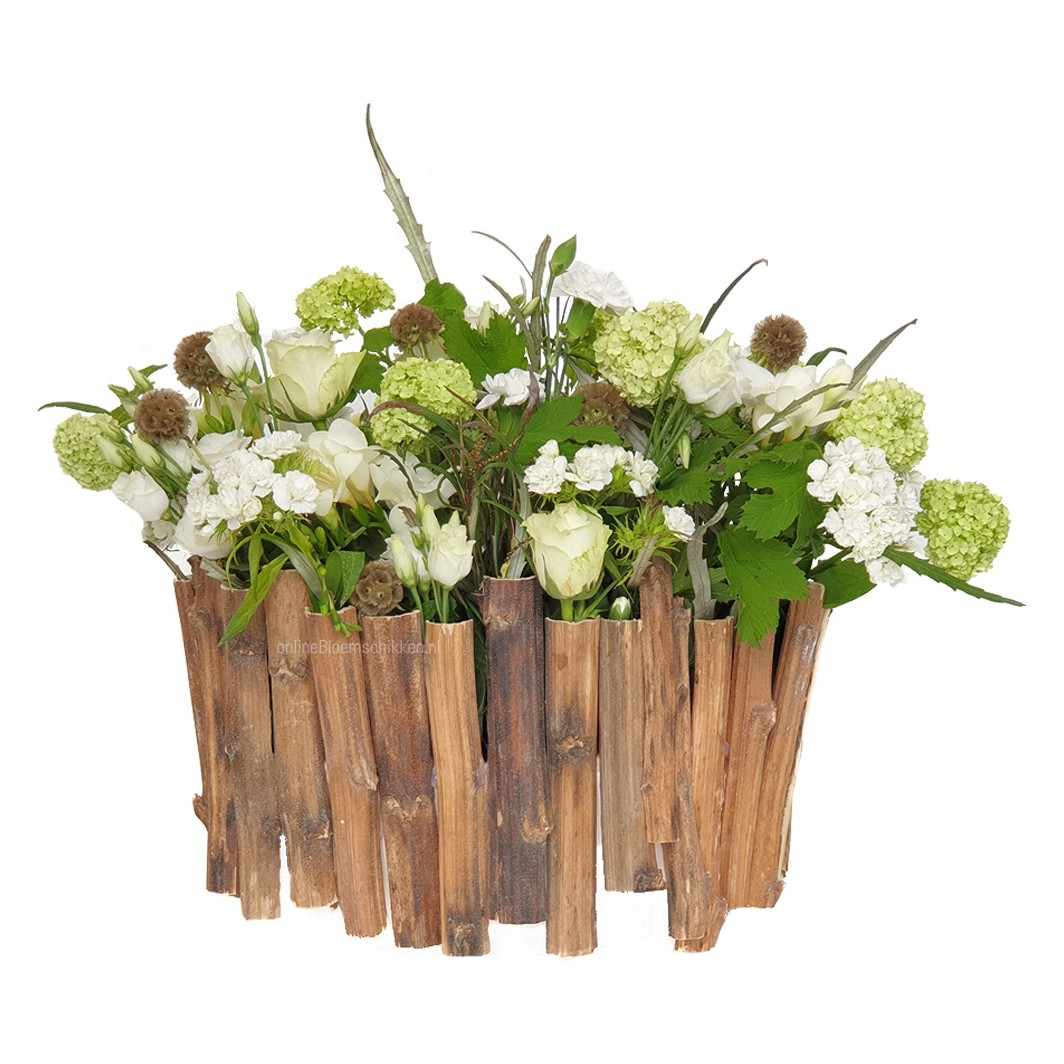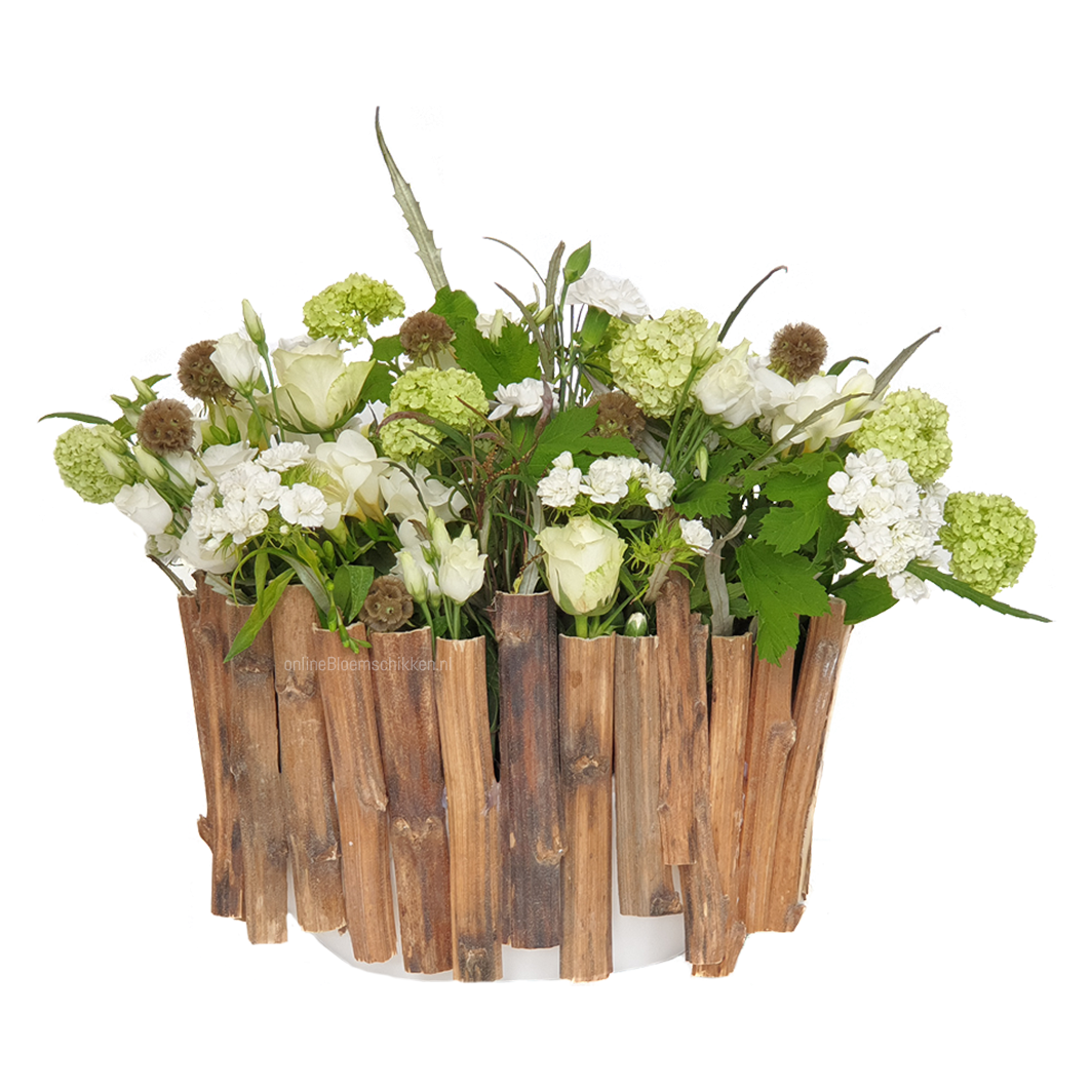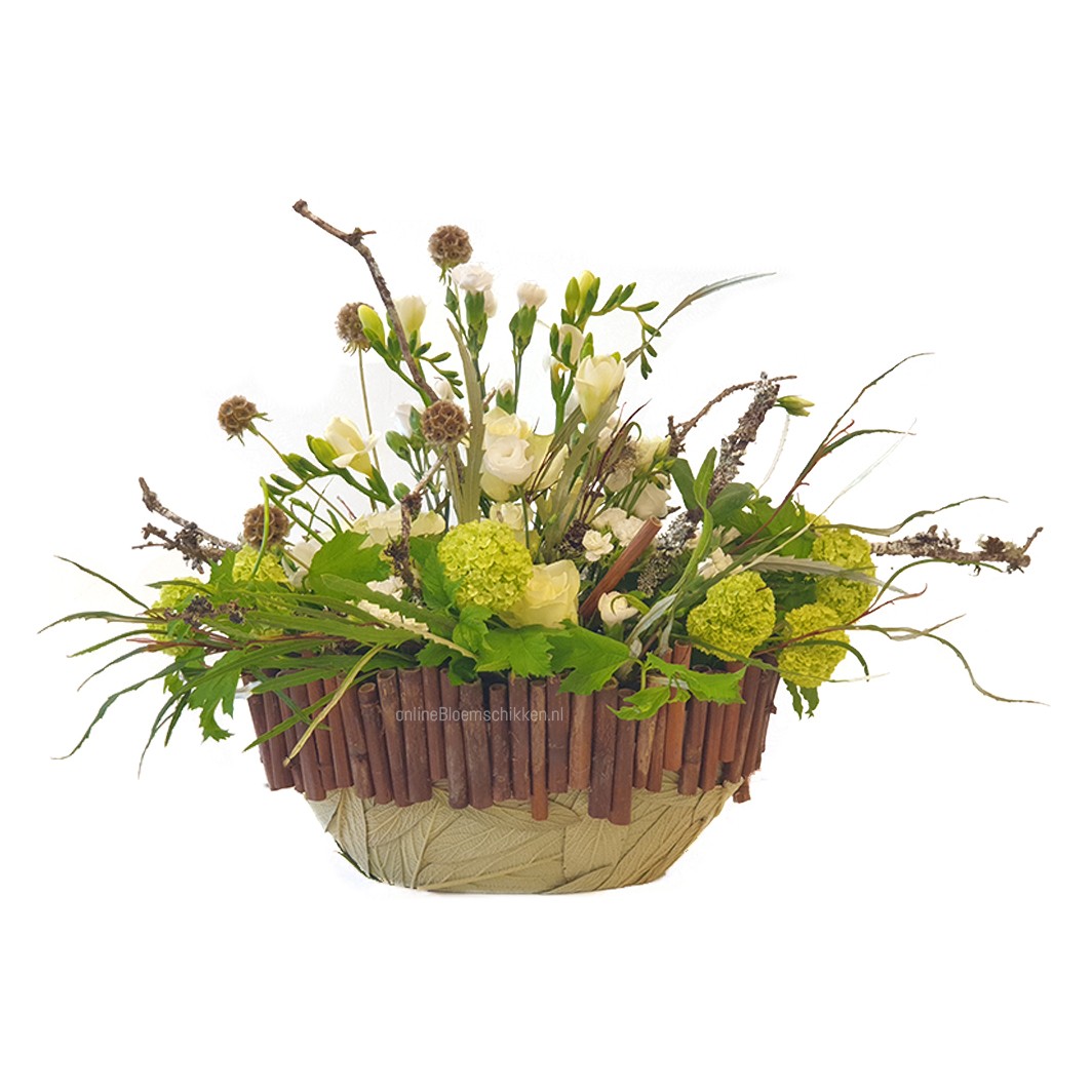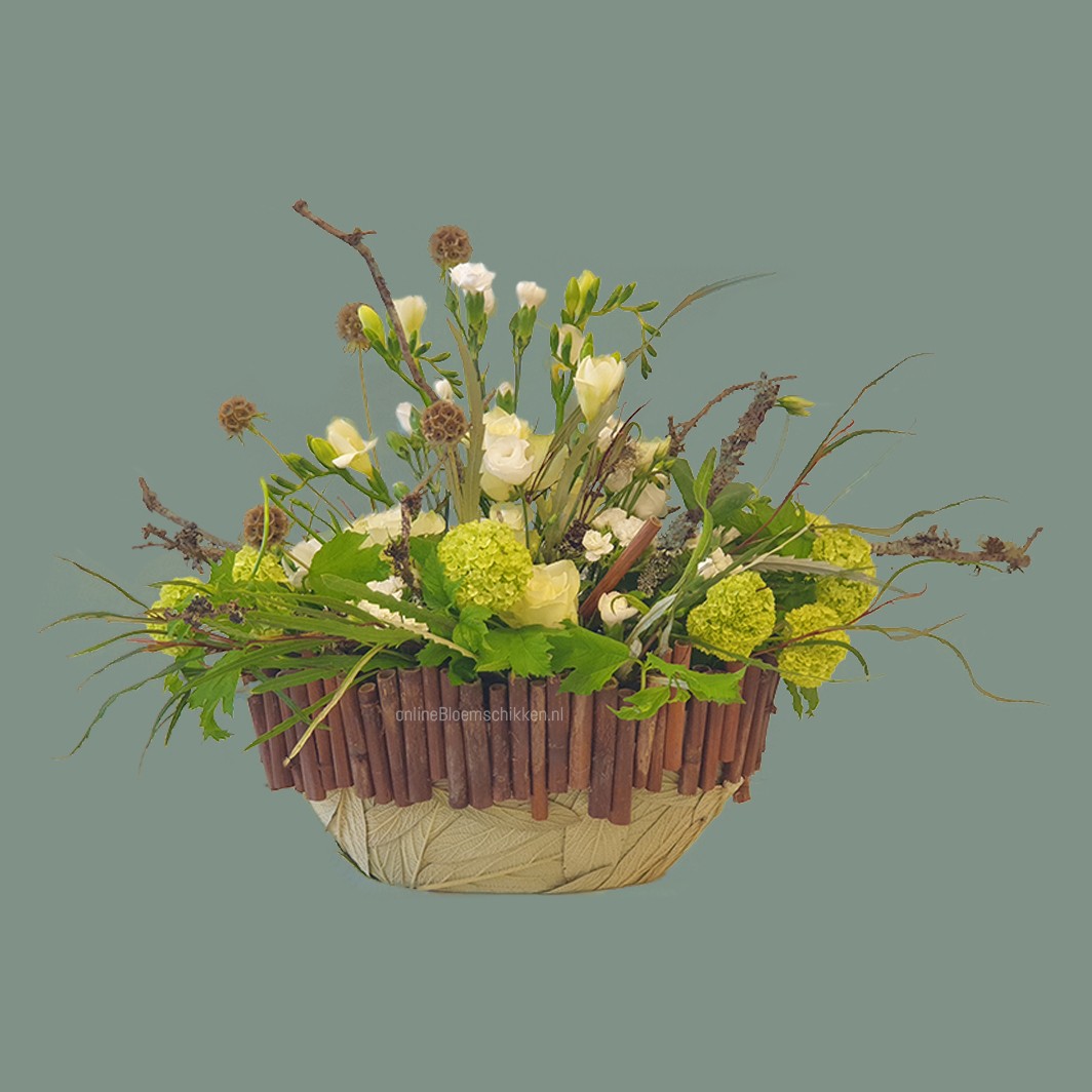 Viburnum kan echt lang blijven staan als je ze goed verzorgt. Warm water en Heestersnijbloemenvoedsel is het advies van de meeste kwekers. Nu zijn er sneeuwballensoorten die al veel sterker zijn dan jaren geleden, daar hebben de kwekers voor gezorgd. Ook een goede verzorging door de kwekers, voordat ze naar de veiling gaan, draagt bij aan een betere kwaliteit. Hopelijk vind je het leuk om met dit arrangement aan de slag gaan, zodat je er daarna lang van kan genieten.