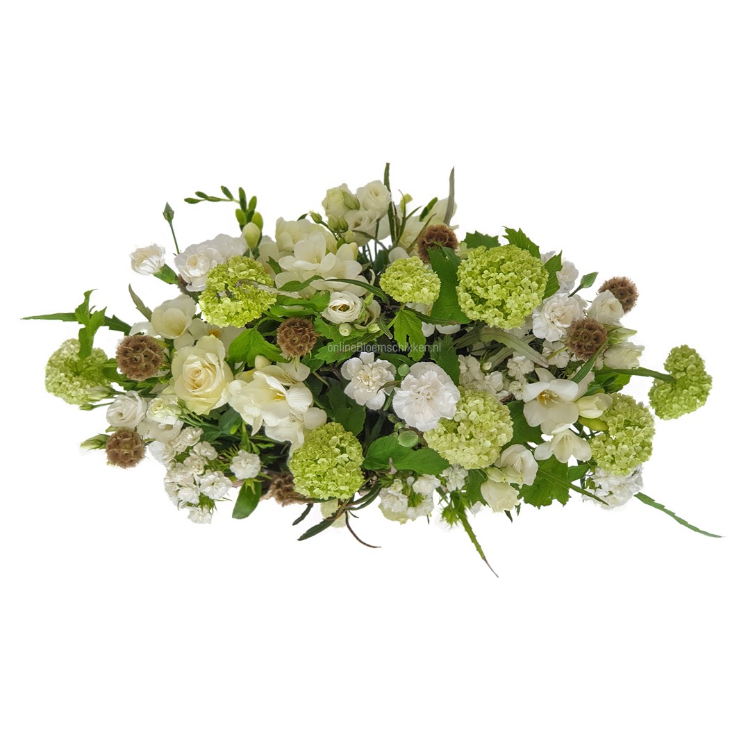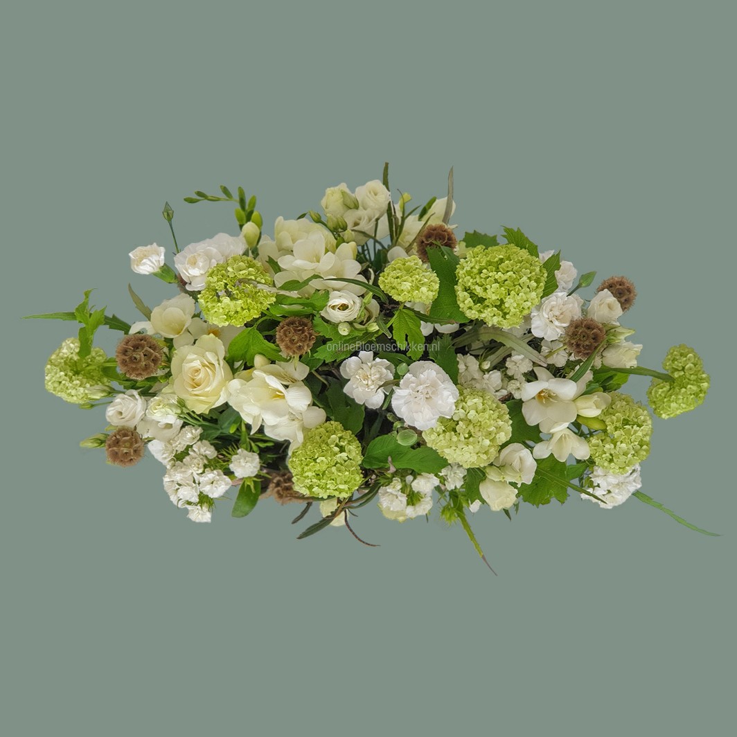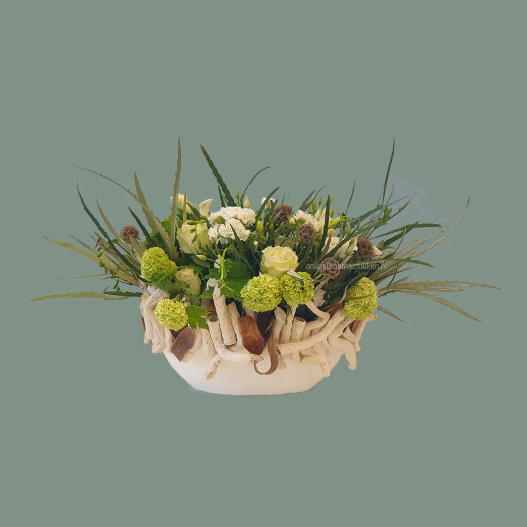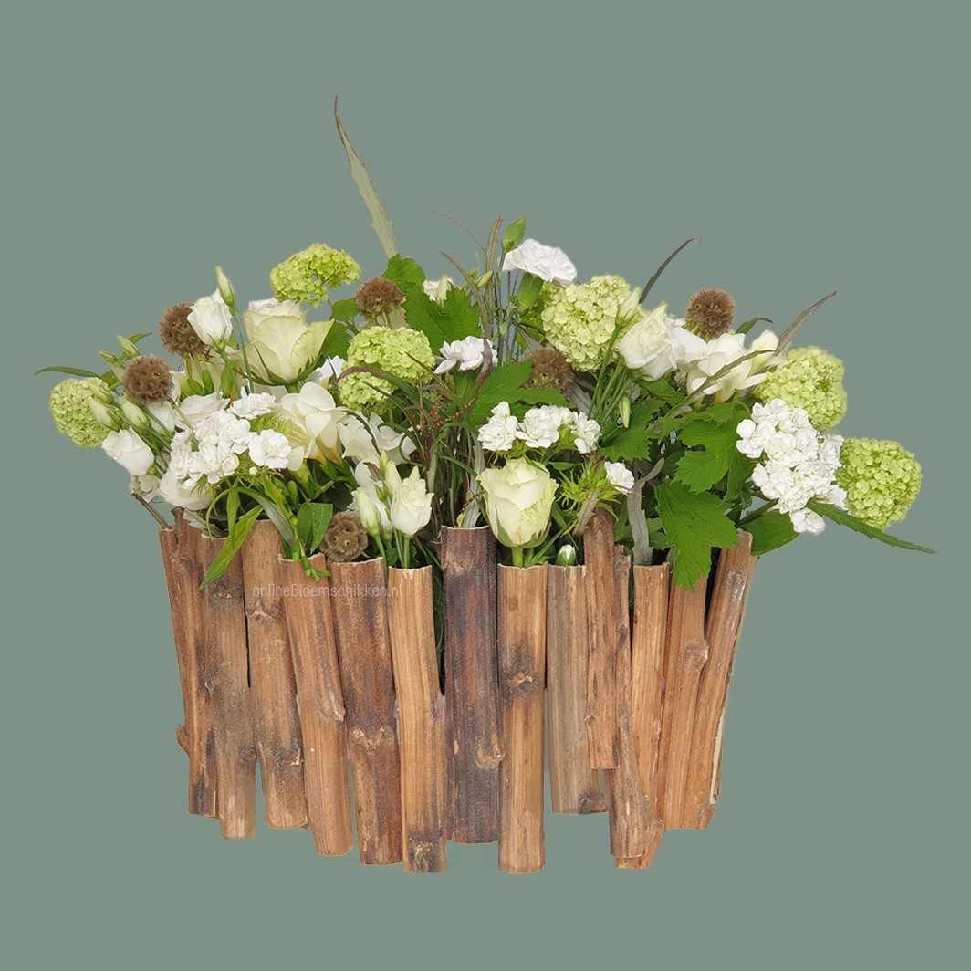 Viburnum kan echt lang blijven staan als je ze goed verzorgt. Warm water en Heestersnijbloemenvoedsel is het advies van de meeste kwekers. Nu zijn er sneeuwballensoorten die al veel sterker zijn dan jaren geleden, daar hebben de kwekers voor gezorgd. Ook een goede verzorging door de kwekers, voordat ze naar de veiling gaan, draagt bij aan een betere kwaliteit. Hopelijk vind je het leuk om met dit arrangement aan de slag gaan, zodat je er daarna lang van kan genieten.