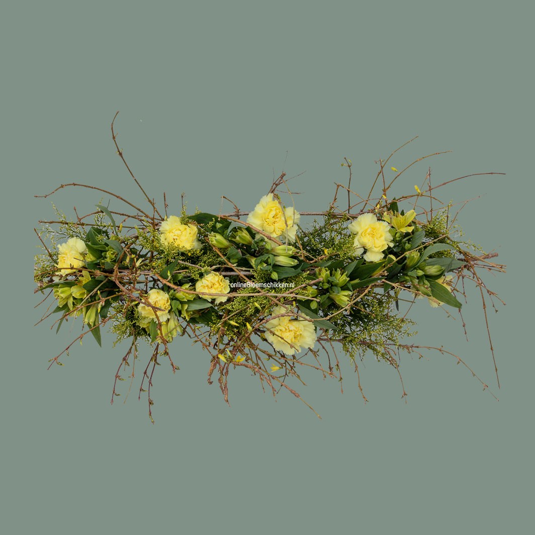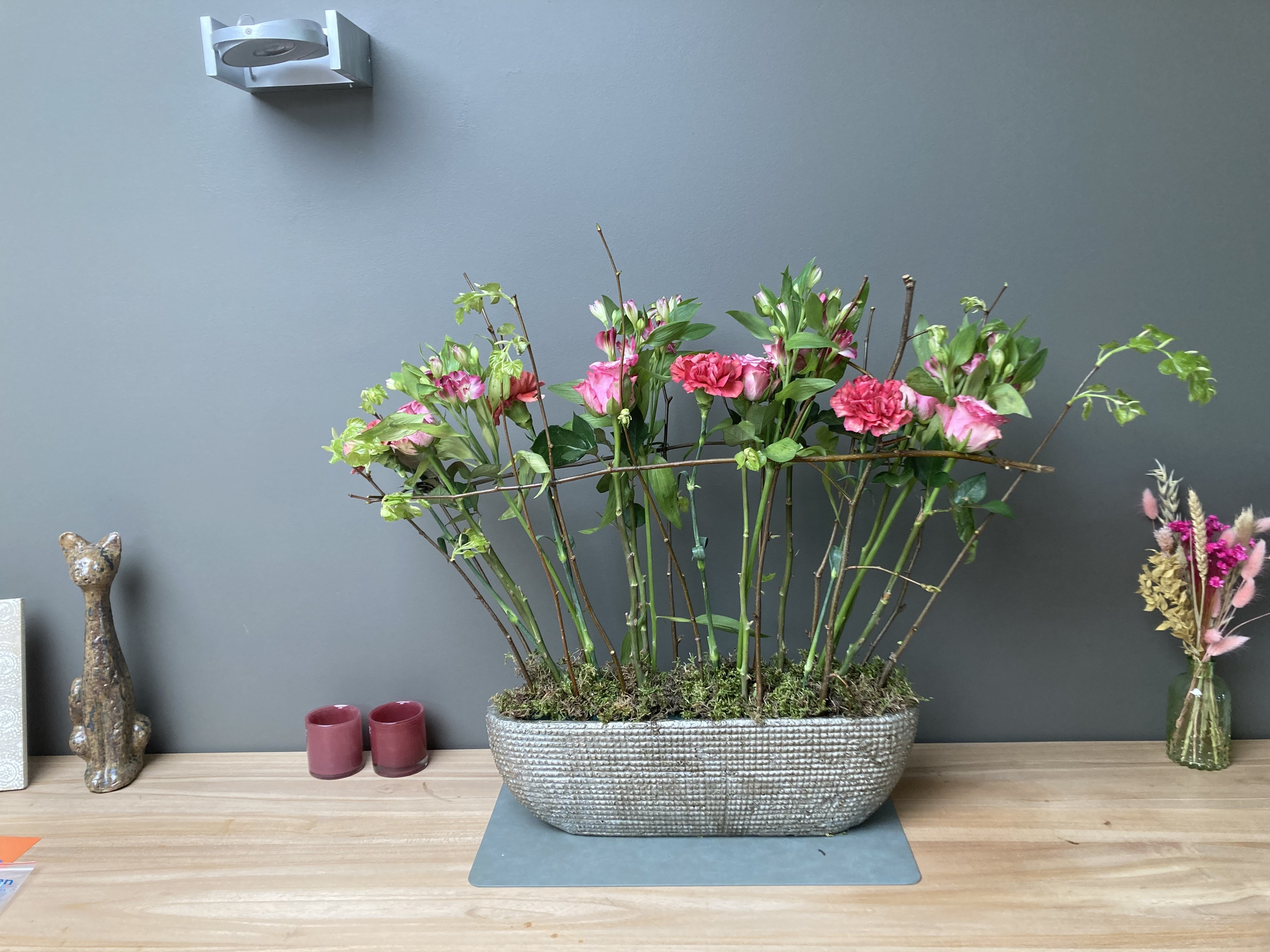 Dit arrangement is in Oasis gestoken en dat maakt het wel iets makkelijker, want dan blijven de bloemen meteen op hun plaats zitten.